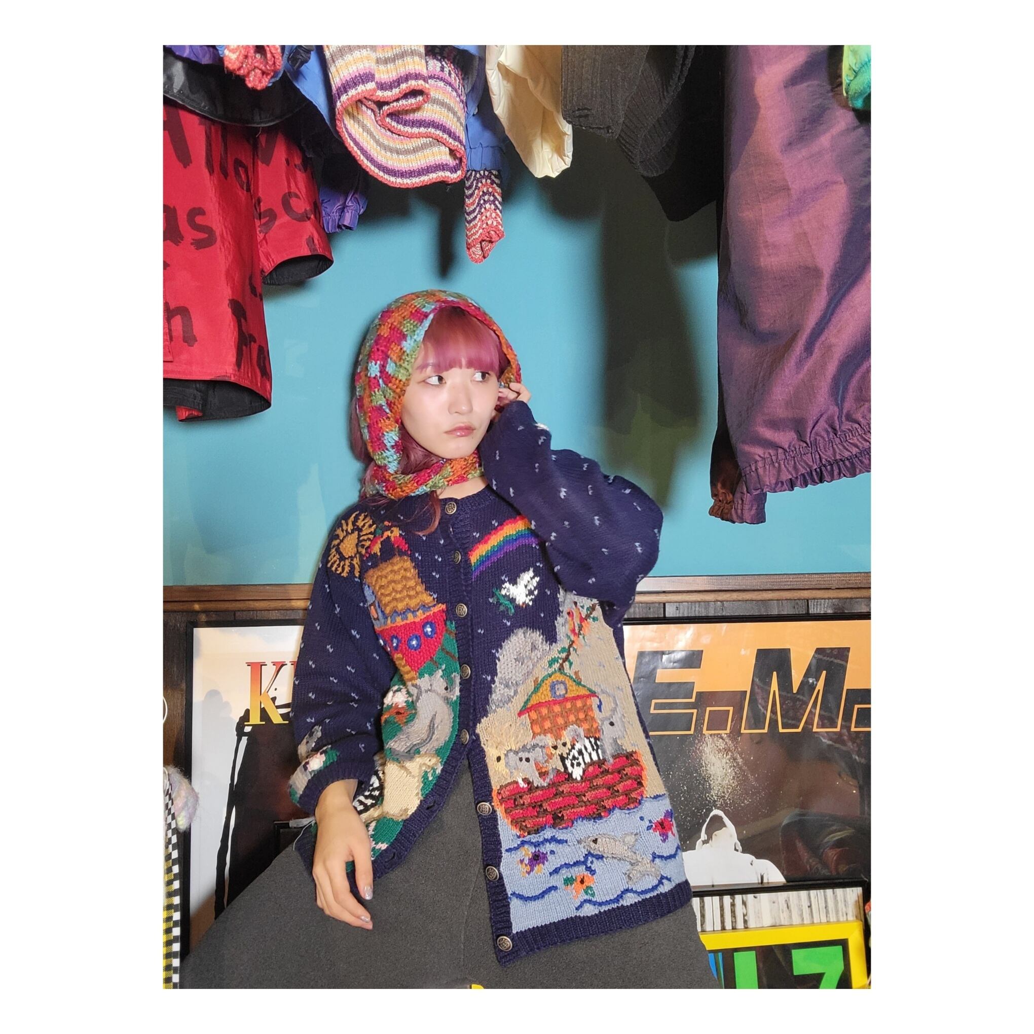 ニットで作られるからこその下手ウマなタッチが愛おしいですね。ボタンが木等のほっこり素材ではなくあまり艶のないシルバーなのもちょっとしたポイントだと思います。