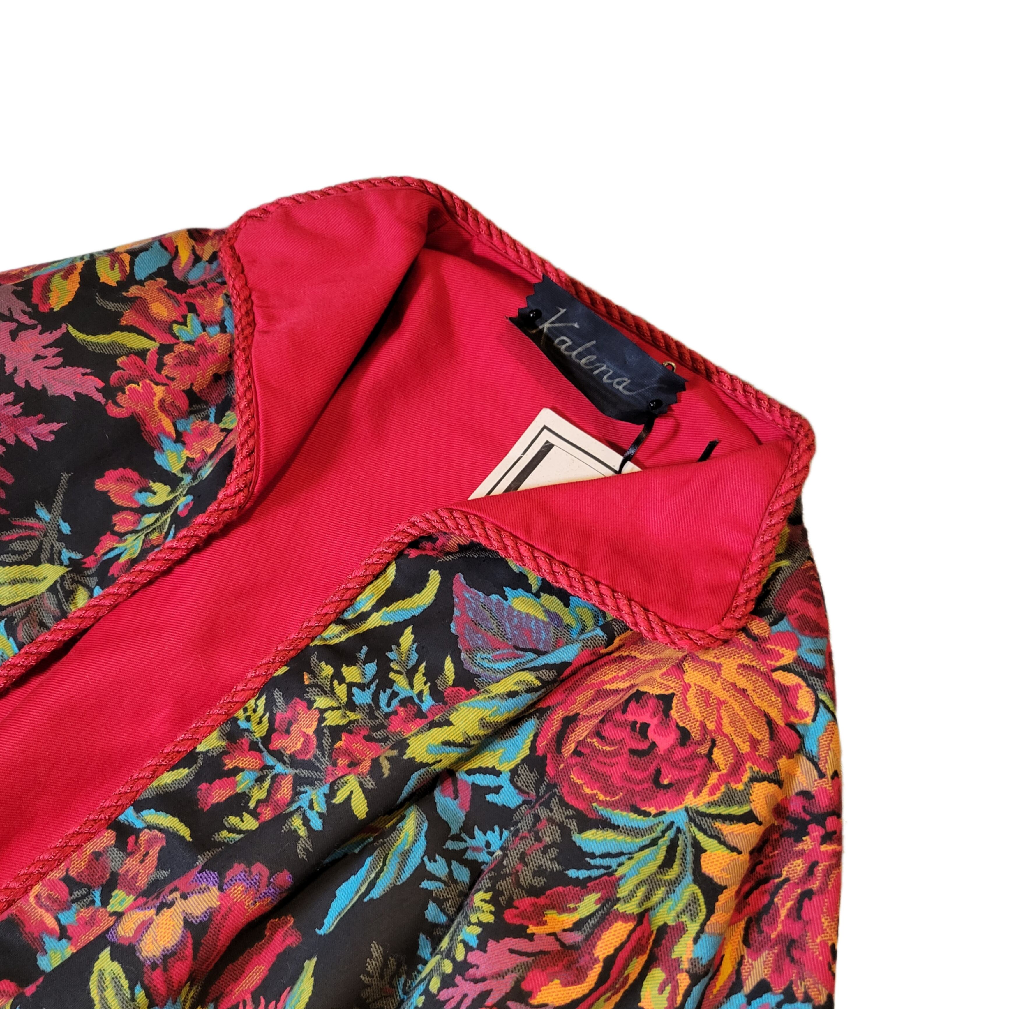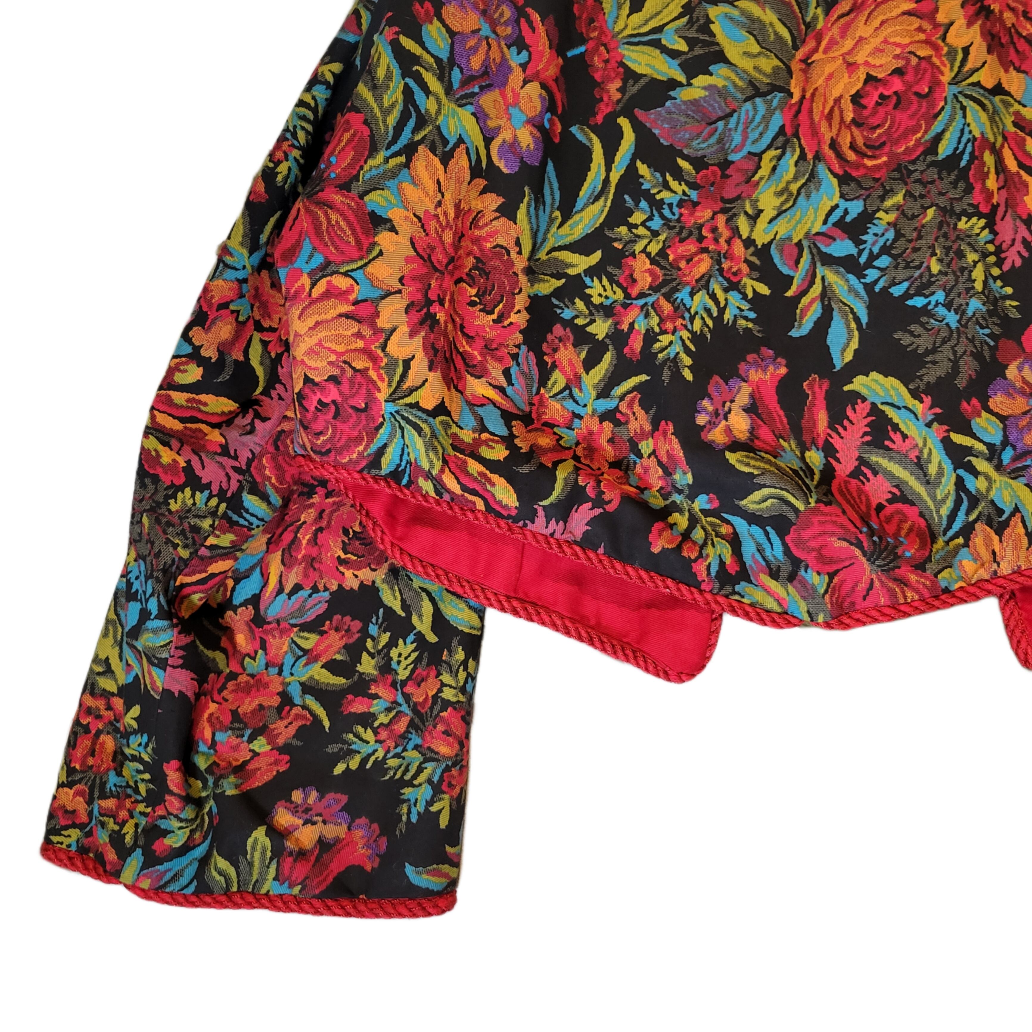 黒のベースに大胆な大ぶりの花柄が華やか。裏地やアウトラインの赤がとっても映えます。