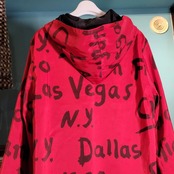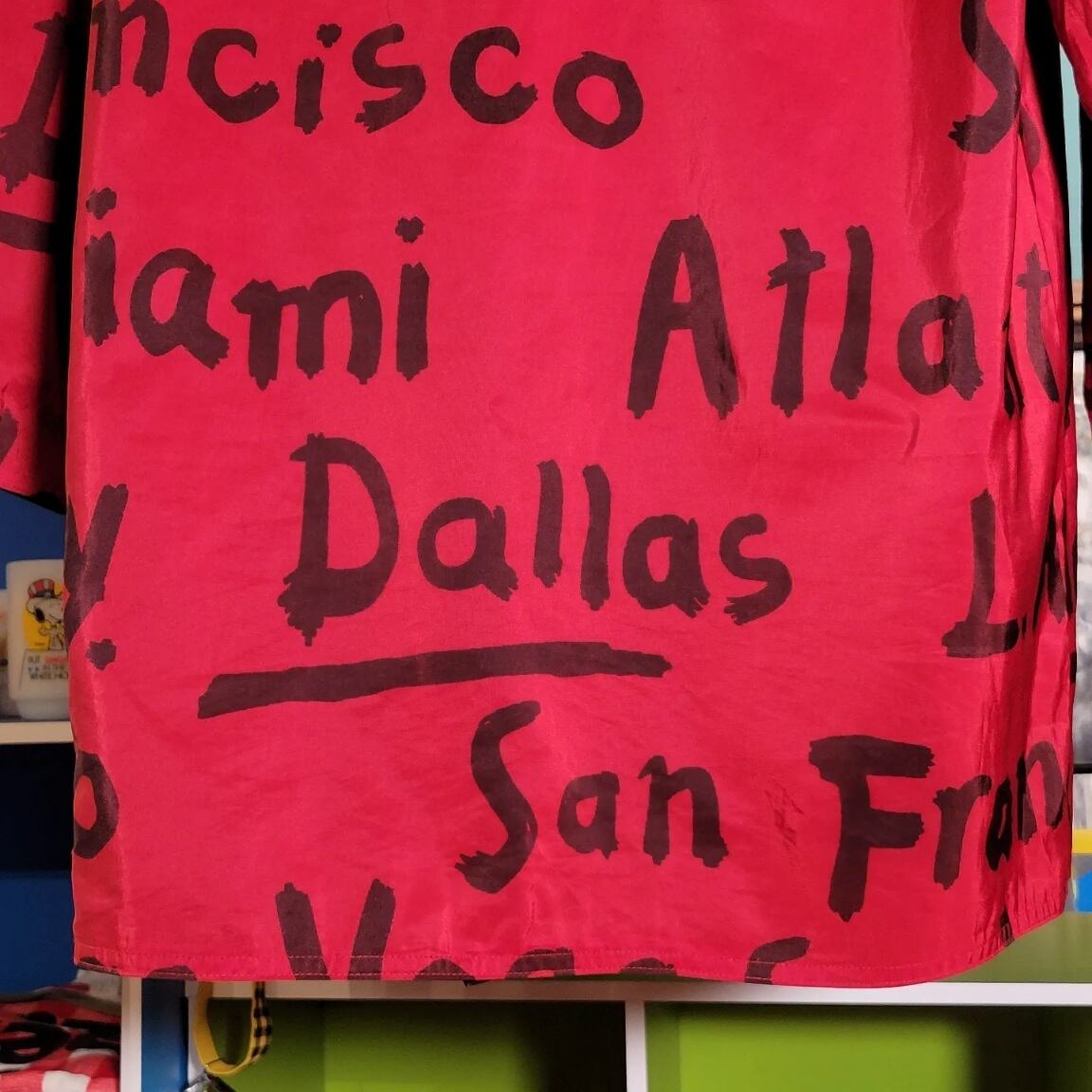ペイントされているアイテムがここ最近流行っていますが、こちらはアメリカのいろいろな州の名前がプリントされているユニークなテキスタイル。どことなくパンクみのある雰囲気がかっこいい。