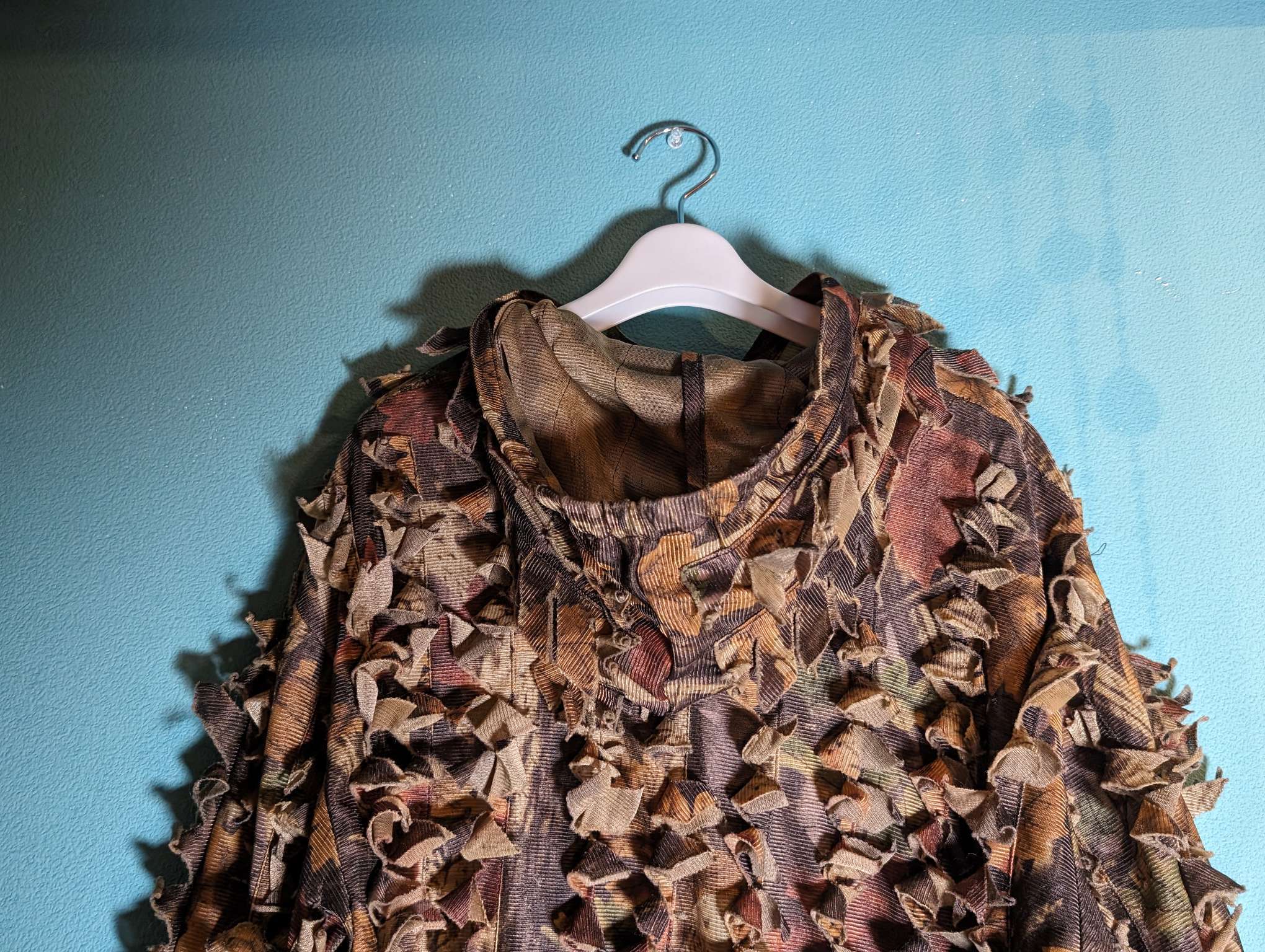 草木に隠れられるよう作られたギリースーツは、自然に溶け込む落ち着いたカラーリングと葉っぱのようなひらひらの立体感がまさに、ソレ用に作られているリアルさ。