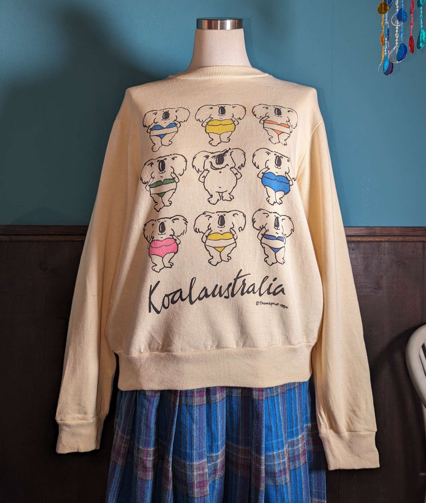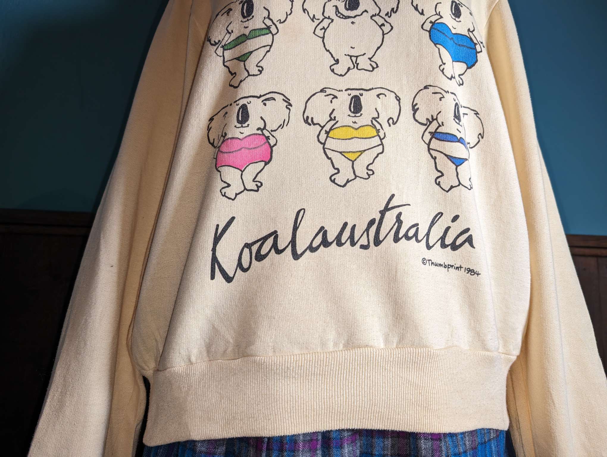 水着姿のコアラちゃん。コアラが服を着ていないのって別に普通なことですが、周りを水着のコアラちゃんが囲うことそして真ん中のコアラちゃんのスケベそうな表情が相まってなんだかファニーなプリントです。健やかな顔のコアラちゃんとちらっと真ん中のコアラちゃんを見る両サイドの子達も気になりますね。