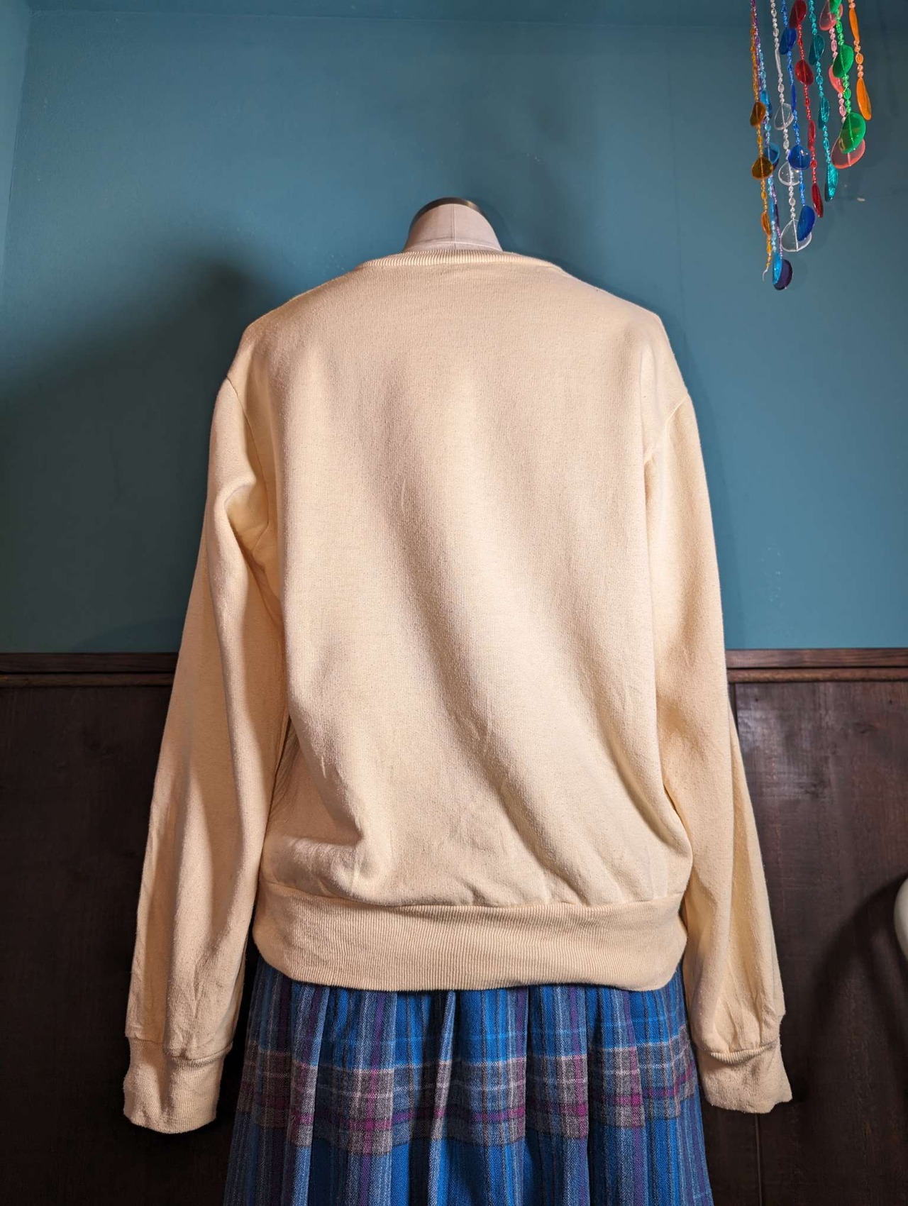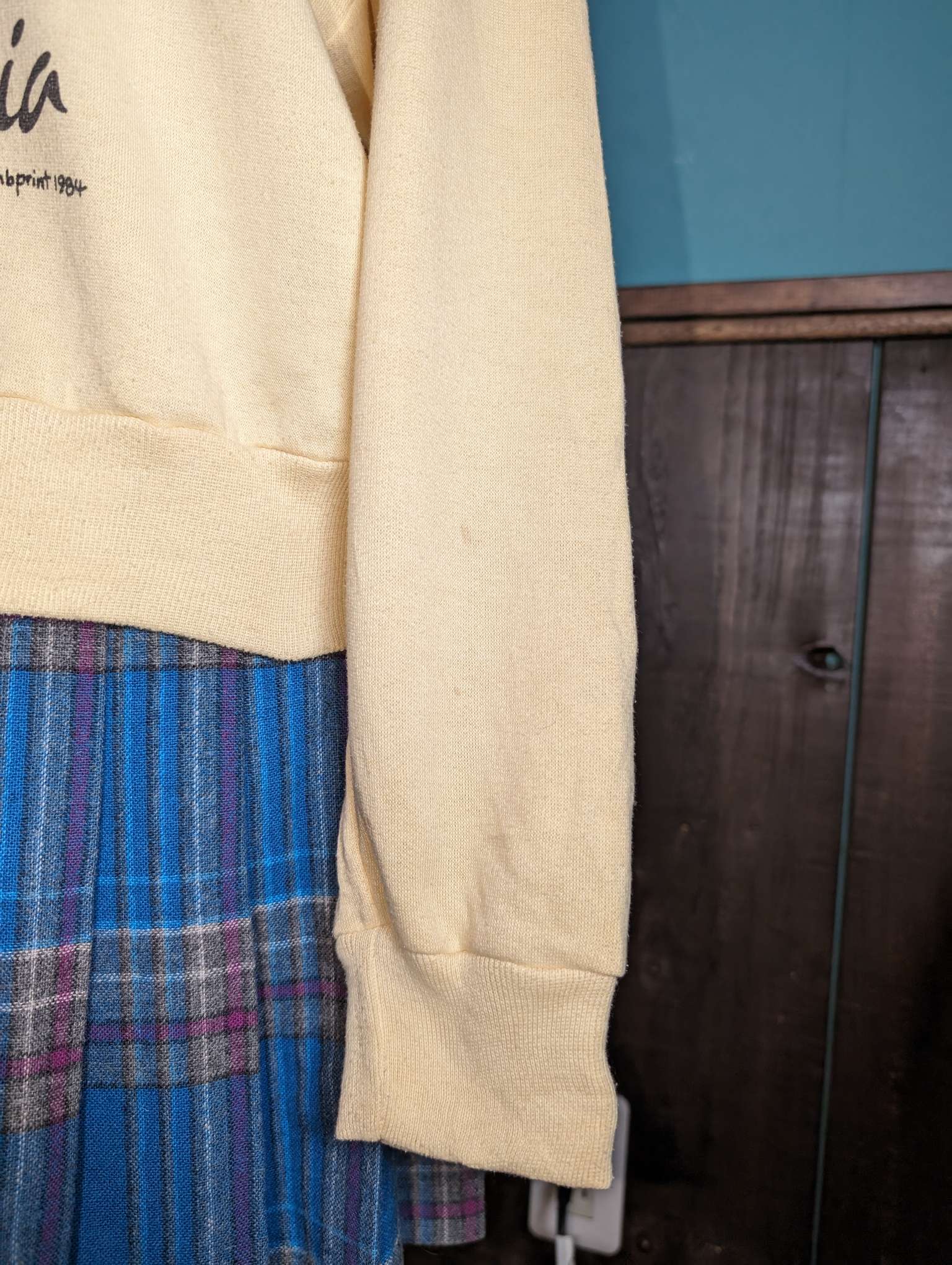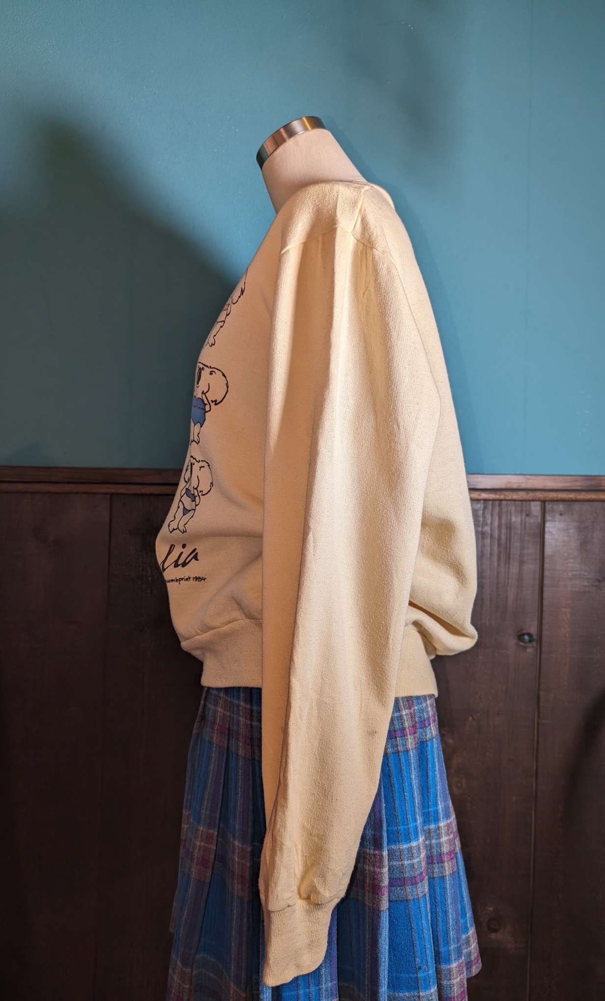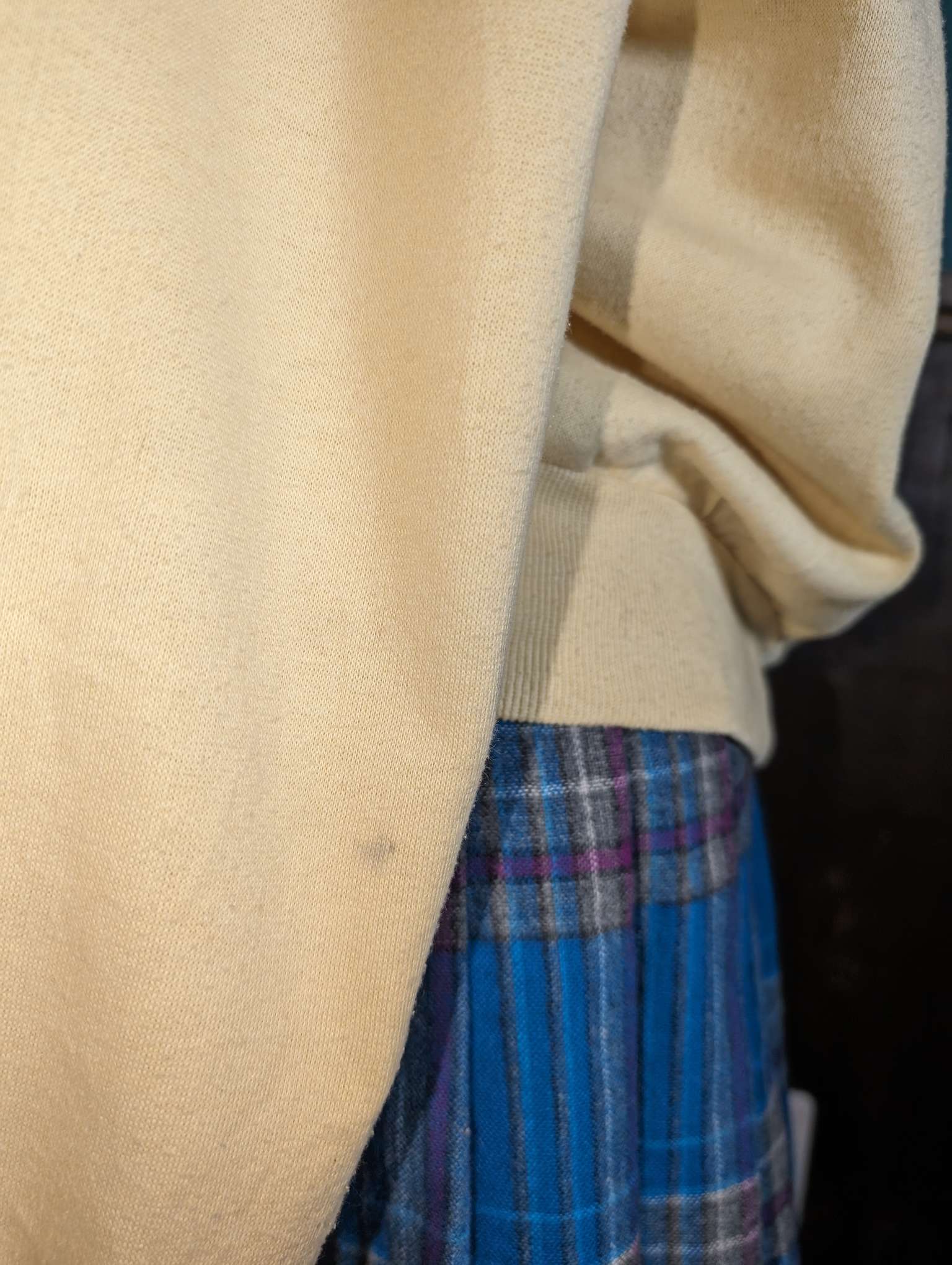 サイズ感自体はM表記で、コンパクトに着られるサイズ感です。写真のように賑やかなスタイリングにも、オーバーオールやベイカーパンツなどのアメカジなスタイリングにもユニークな雰囲気を気軽に出してくれるひょうきん者。
