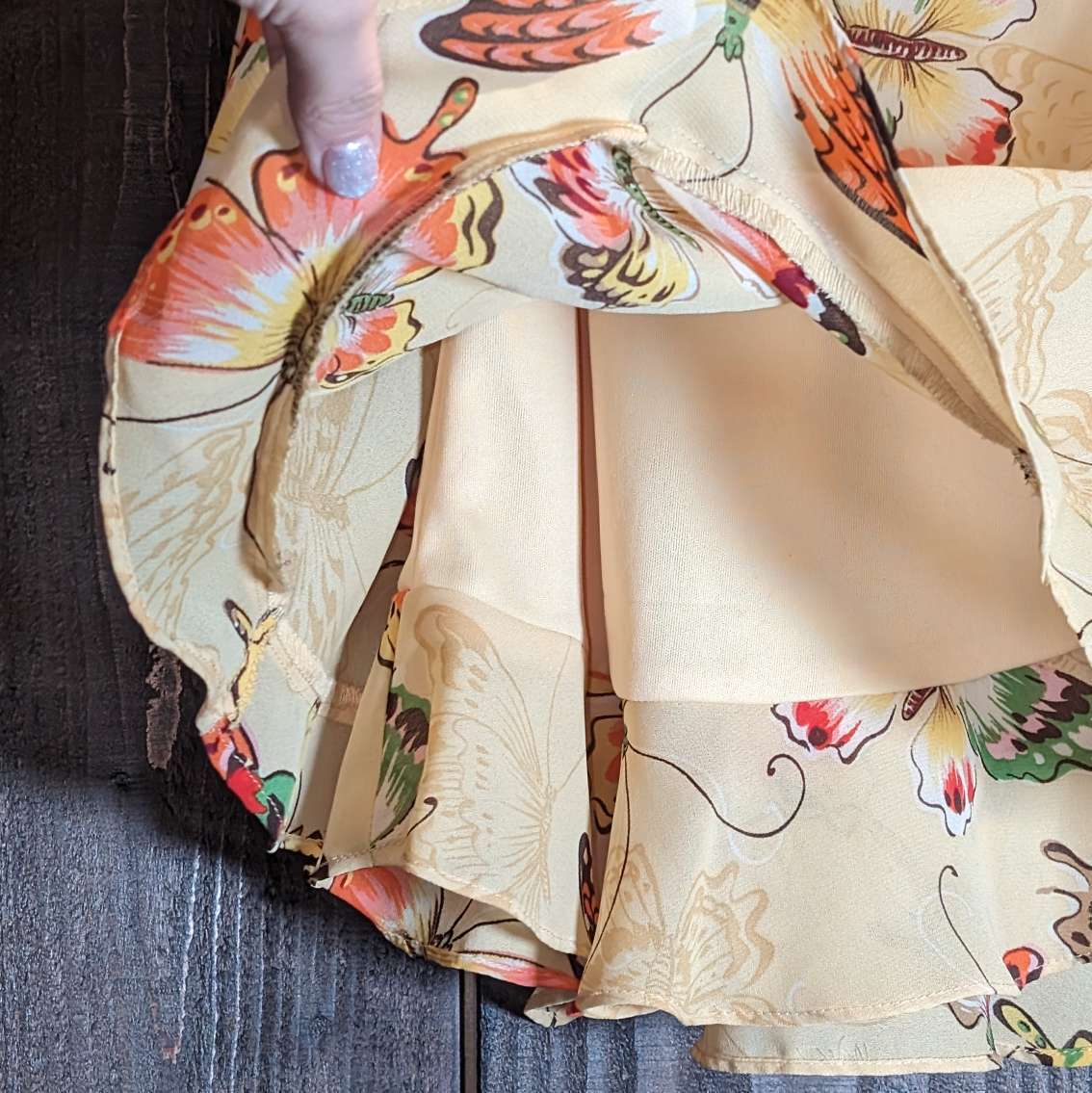 シアーな素材感で柔らかさのある素材と裾部分のフリル、ひらひらと舞う蝶々のプリントとの相性が非常に良い一着。キチンと裏地がついているのも嬉しいポインㇳ。