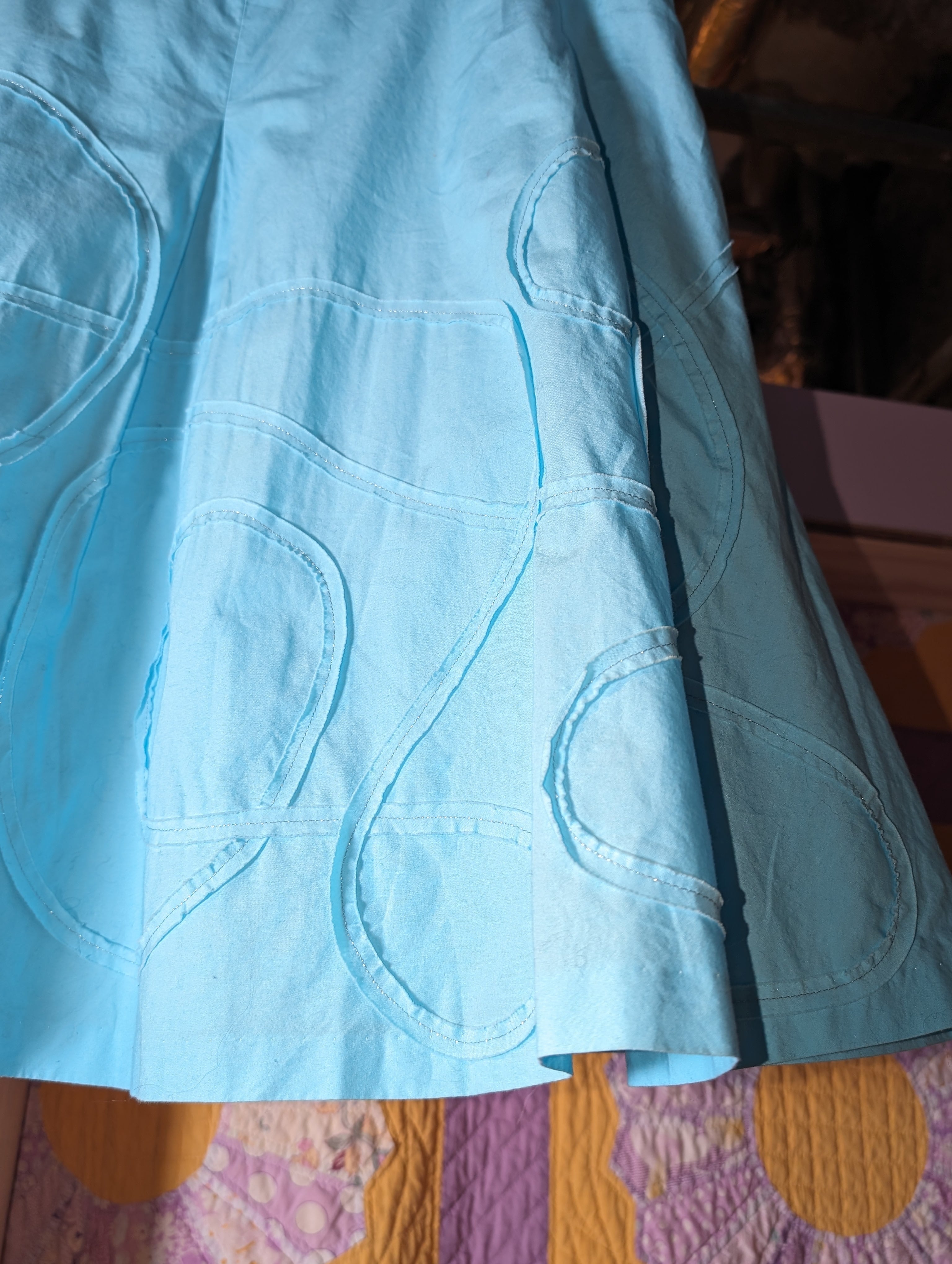 コットンで軽やかな動き、腰辺りからふんわりと広がるシルエットがキュートです。不思議な模様のステッチがぐるぐると施されており、ミニ×フレアなシルエットですが可愛らしさだけではない不思議な魅力がありますね。