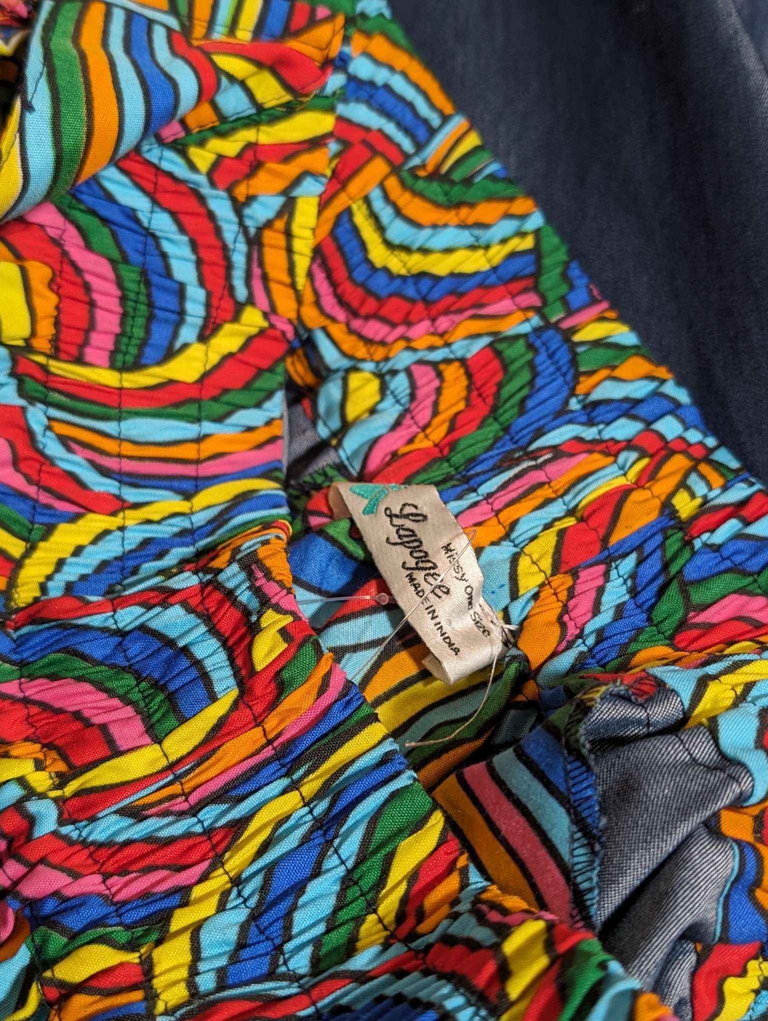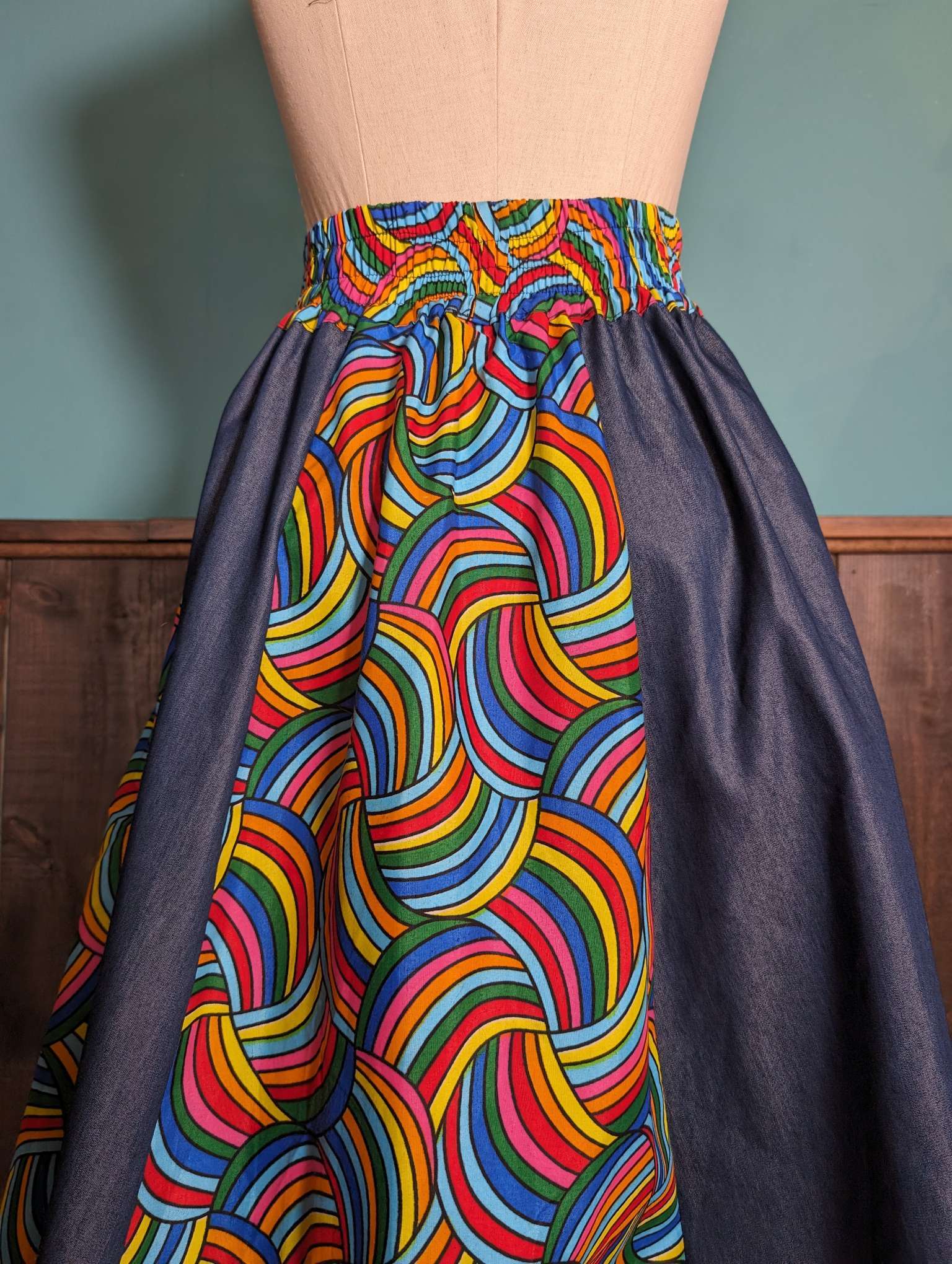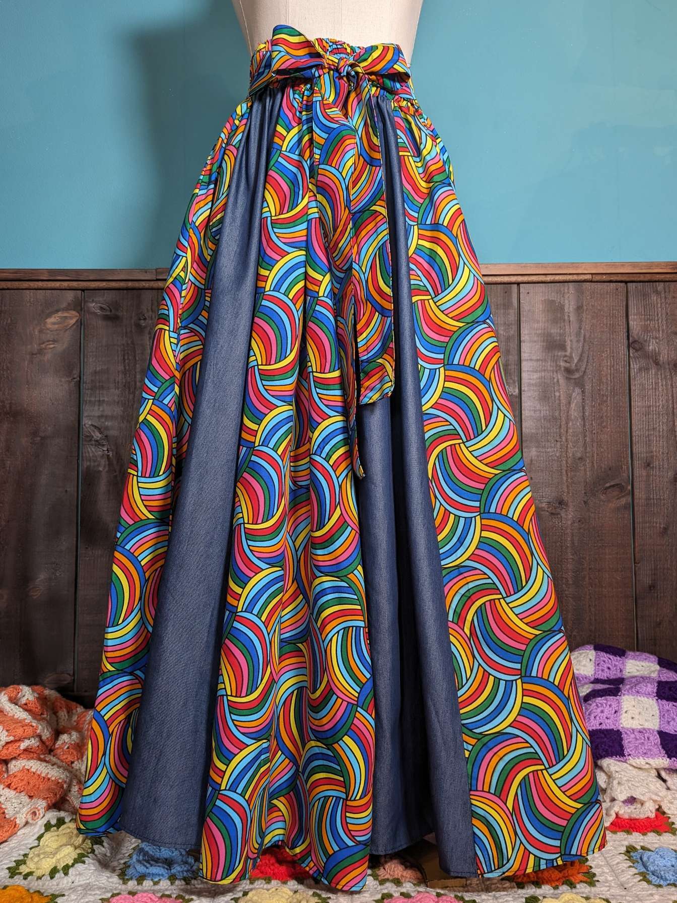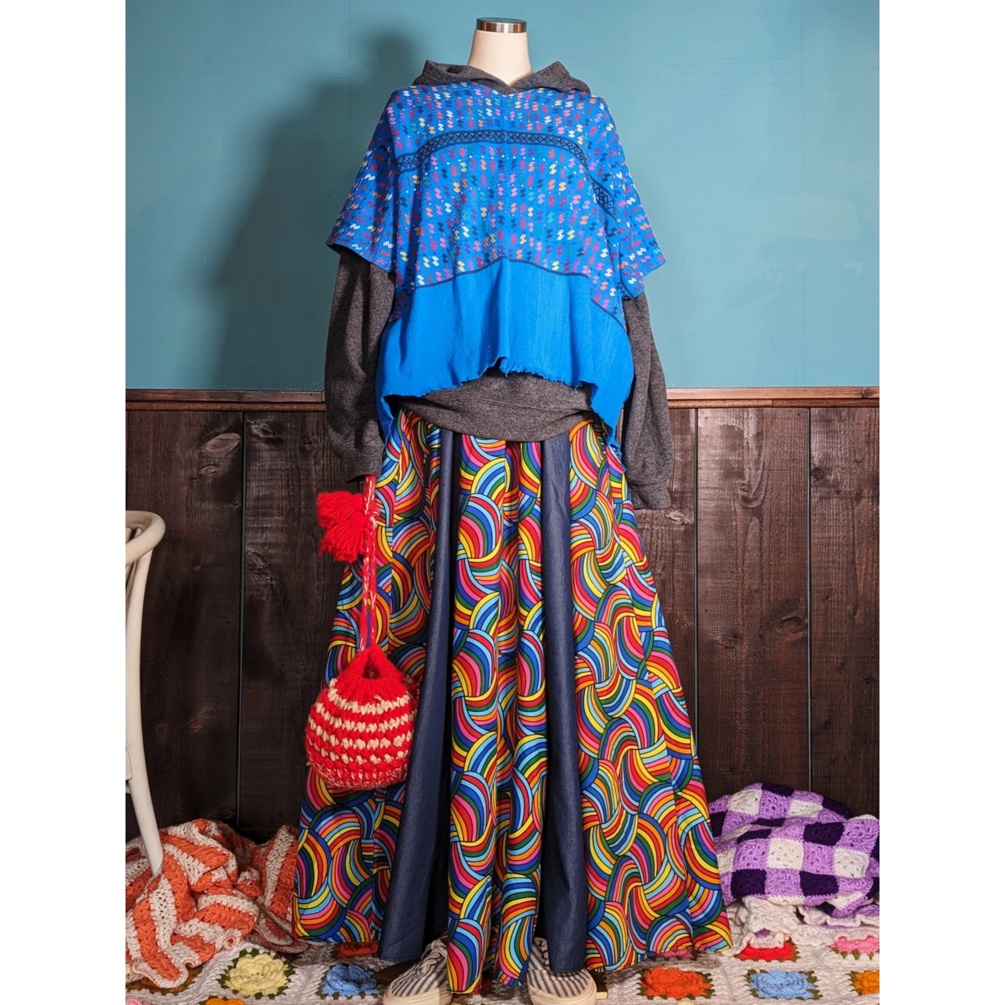 レインボーの賑やかな生地と、インディゴのデニムのようなカラーの記事の切り返しからなるマキシ丈。たっぷりと使われた生地はサーキュラーになっており、それからなる自然なドレープが贅沢(◠ᴥ◕ʋ)
