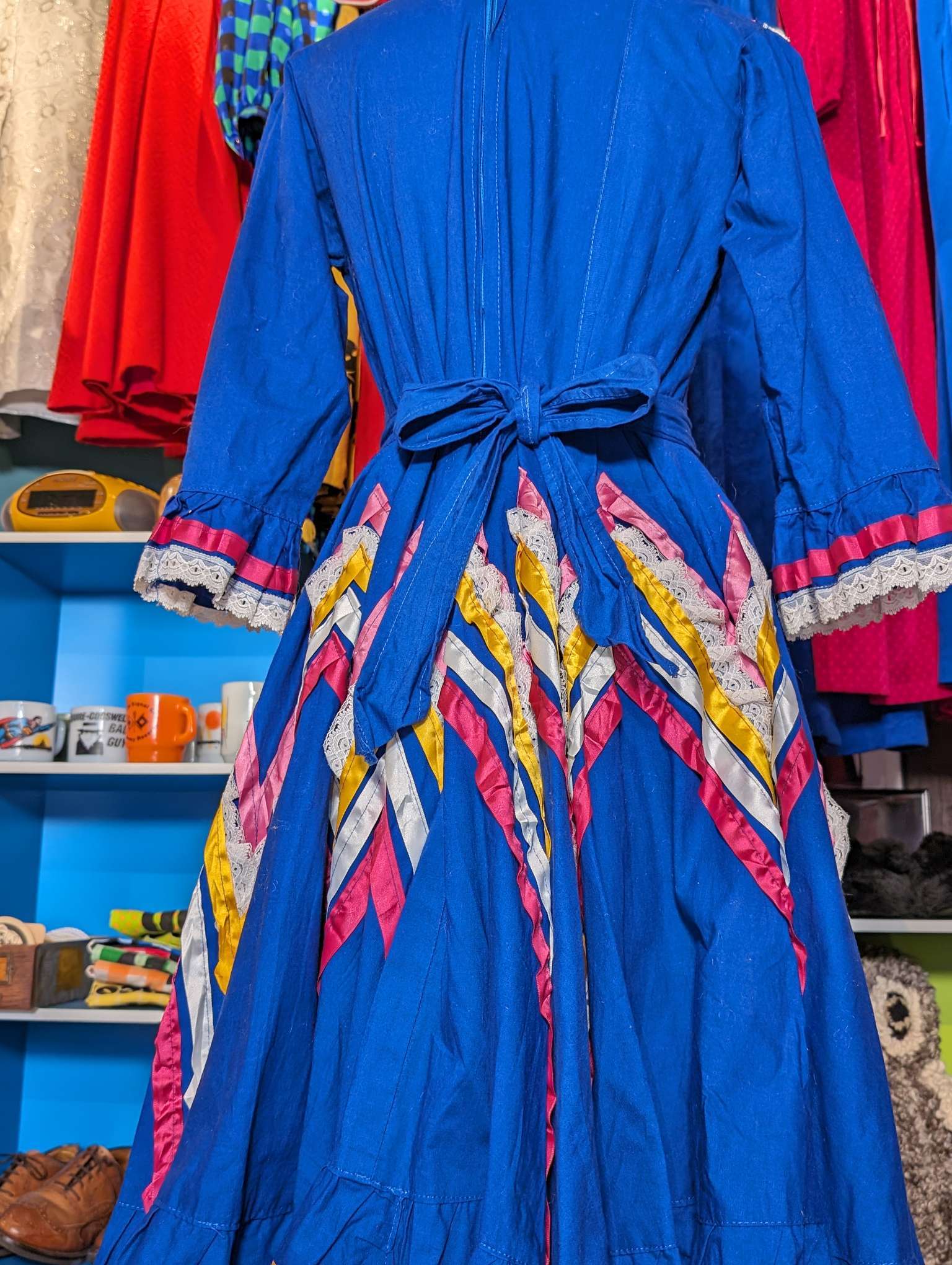 ビビッドなカラーリングとボリューミーなAラインが大胆。カラーテープやレースでこれでもかと言うほど豪華に飾られています。ハイネック×Aライン、装飾的だけれど突飛な配色で掴みどころのない魅力があります。