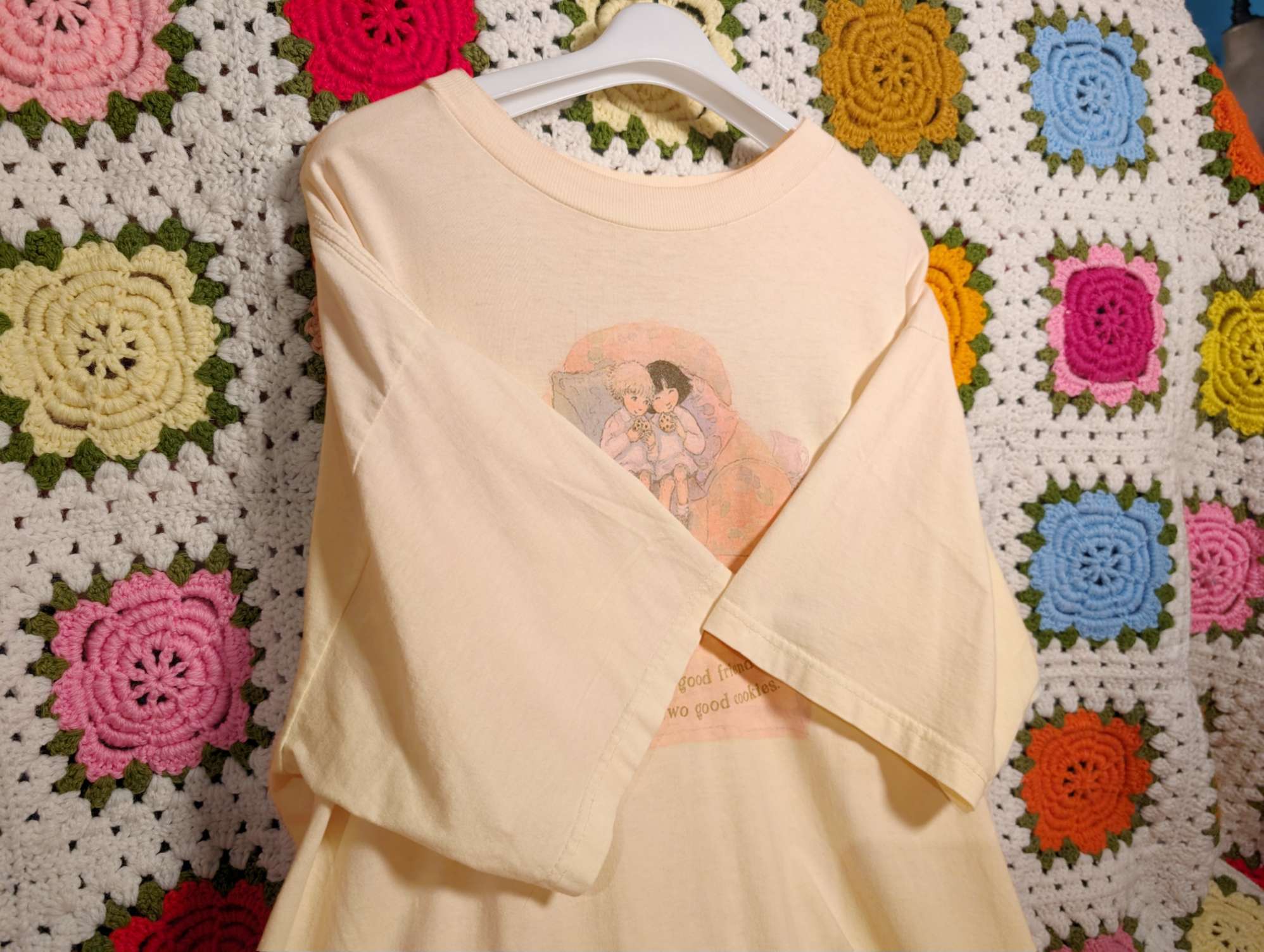 大好きなお友達と仲良く一緒に美味しいクッキーを食べるなんだか童心を思い出し懐かしくなるようなほっこりしたプリント。柔らかなタッチも相まって可愛らしい雰囲気がぐーです。