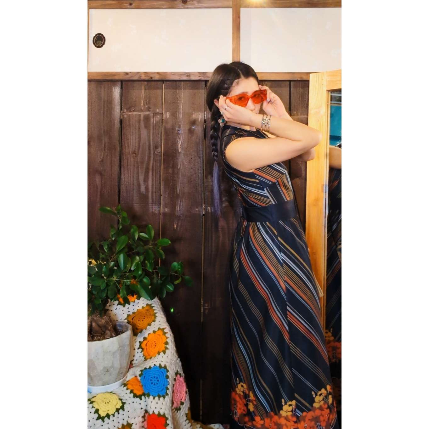 今回はアジアみ感じるこの雰囲気に、エスニックなポシェットと、アクセントはサングラスにまかせてみました。シースルーの羽織をプラスしたり、フリンジのポンチョなどを重ねてみるとまた違った印象になるので実験が楽しい一着です。