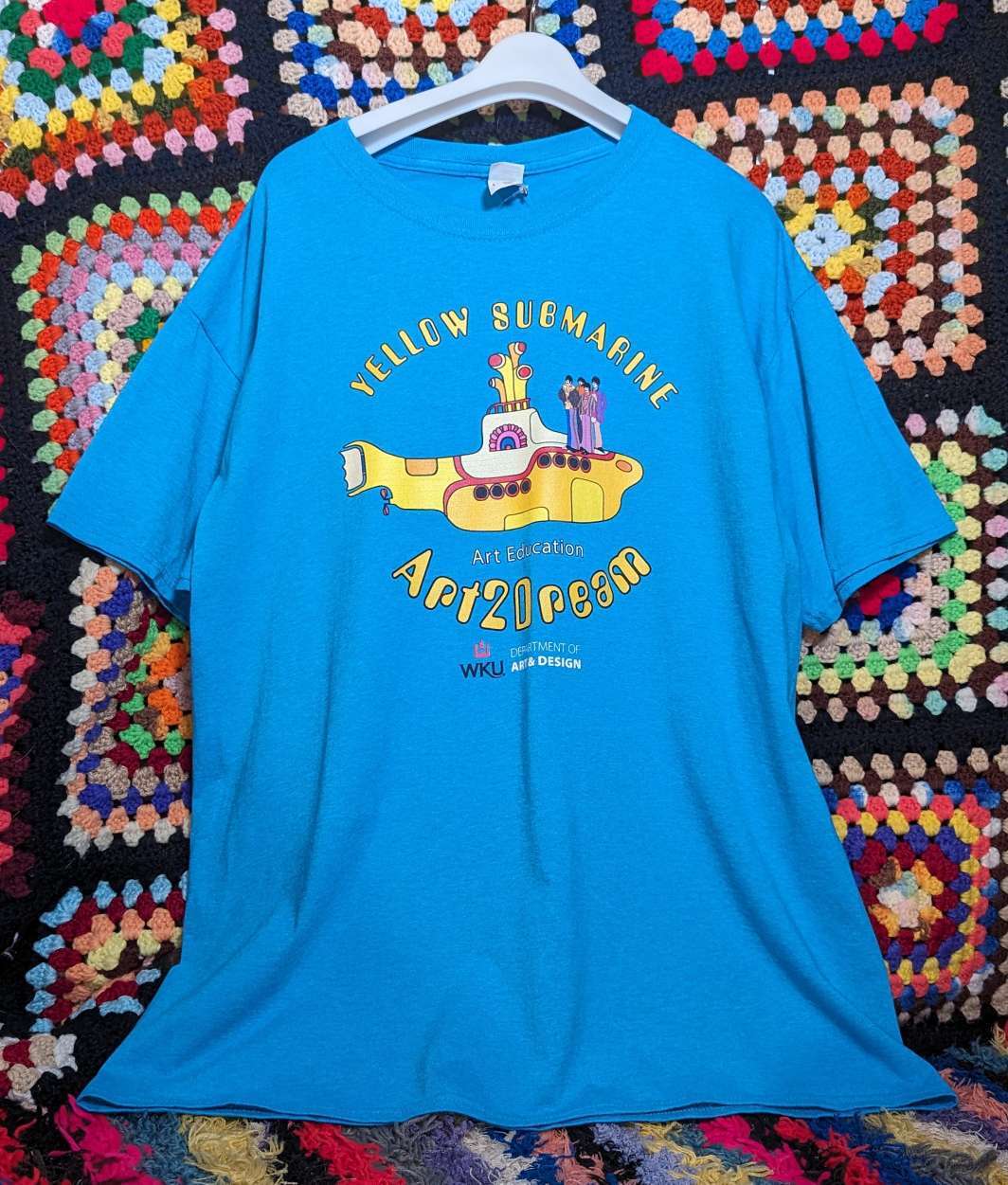 爽やかなブルーに映えるプリント、イエローサブマリンのこの絵、これのアニメ映画も好きです。お好きな方も多いと思いますが。ちゃっかりイエローサブマリン号にメンバーが乗ってるのも個人的にはにっこりポイント。