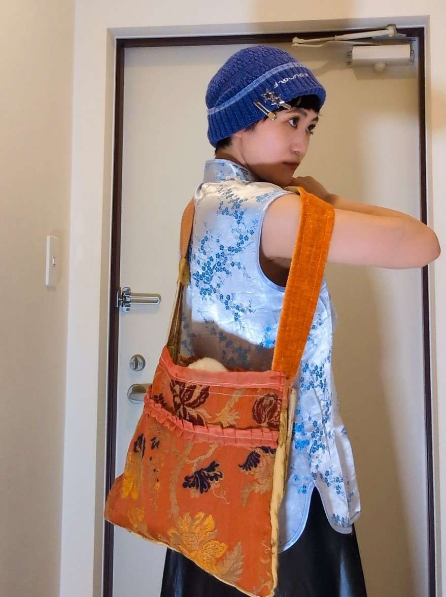 今回はツヤ感のあるスカートで質感を合わせつつも、ビーニーやパッチワークのショルダーバッグなどで遊び心をプラスしたスタイリングでご提案。