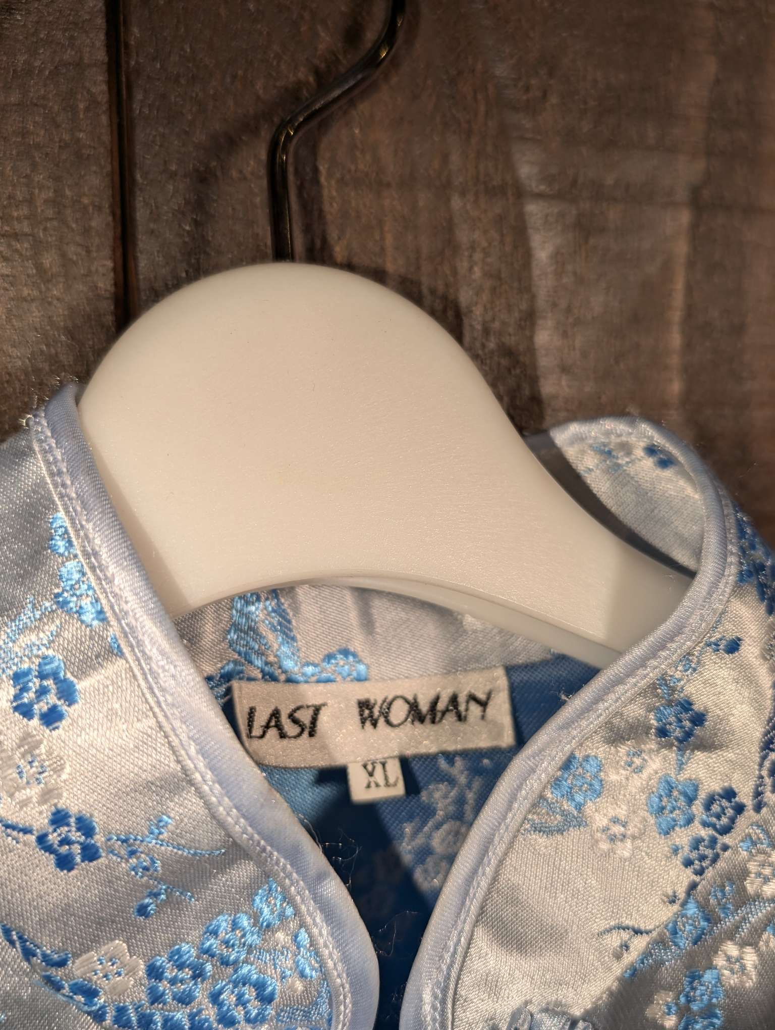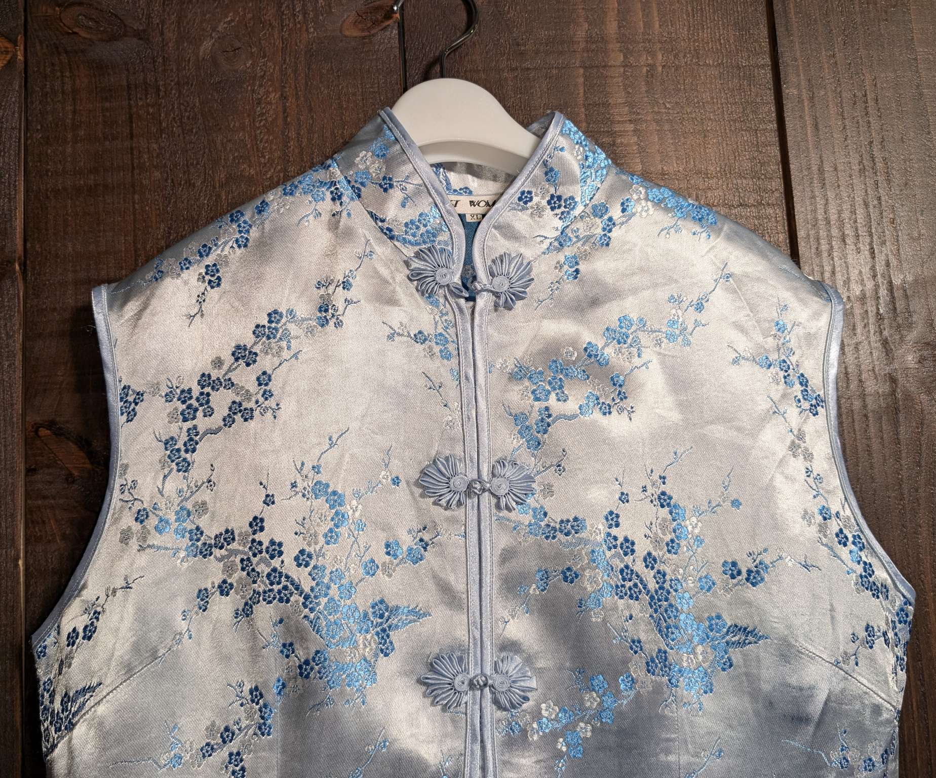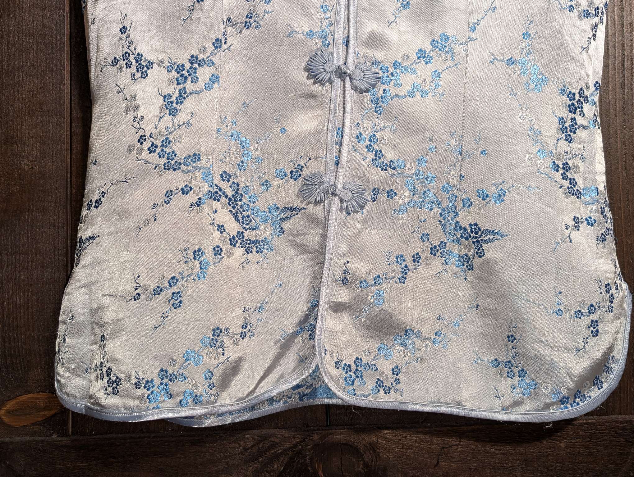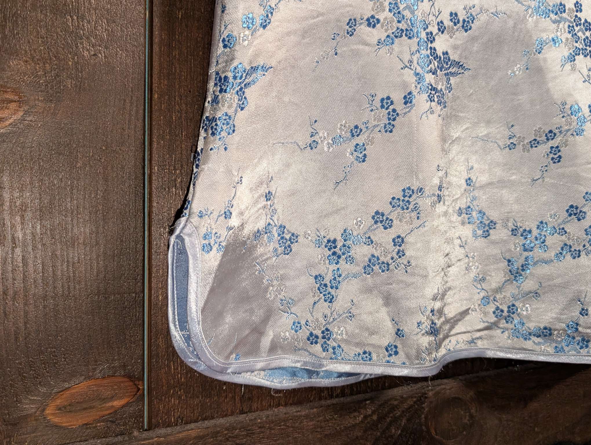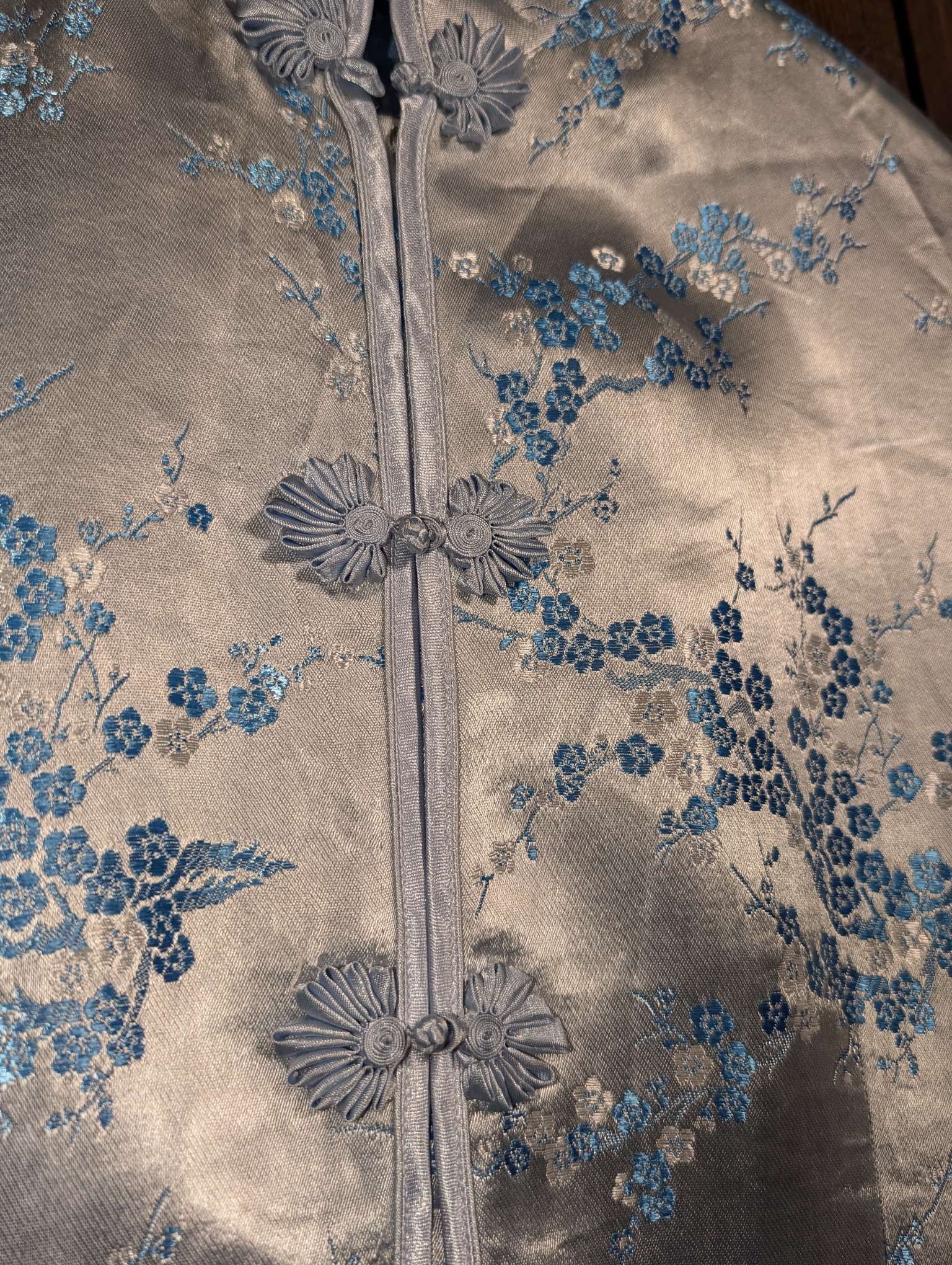 ツルツルとしたシルク素材でサラッと軽やか。淡いブルーに細かいお花のテキスタイルが上品な雰囲気◎ゆったりと大きなサイズ感でタイトになりにくいので前を閉めてきてもコスプレ感が多くなくより馴染みやすいかと。