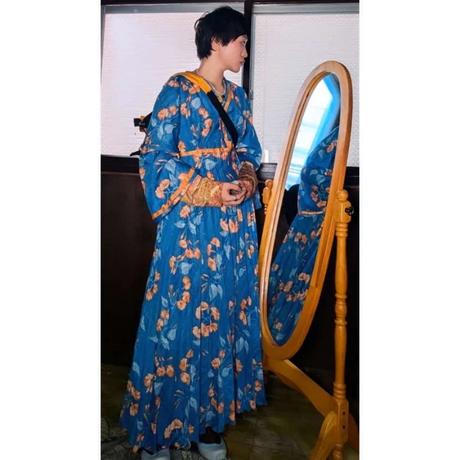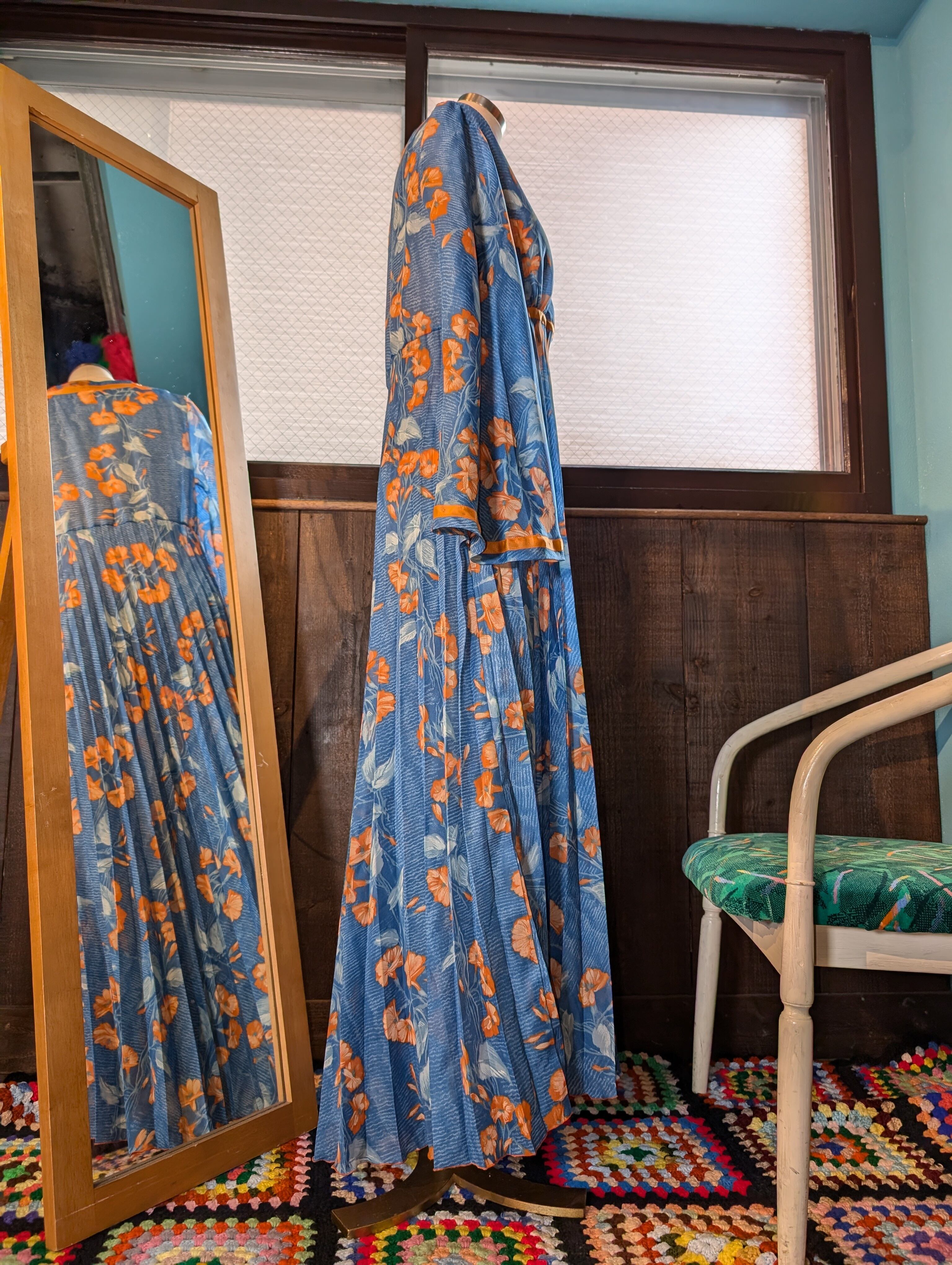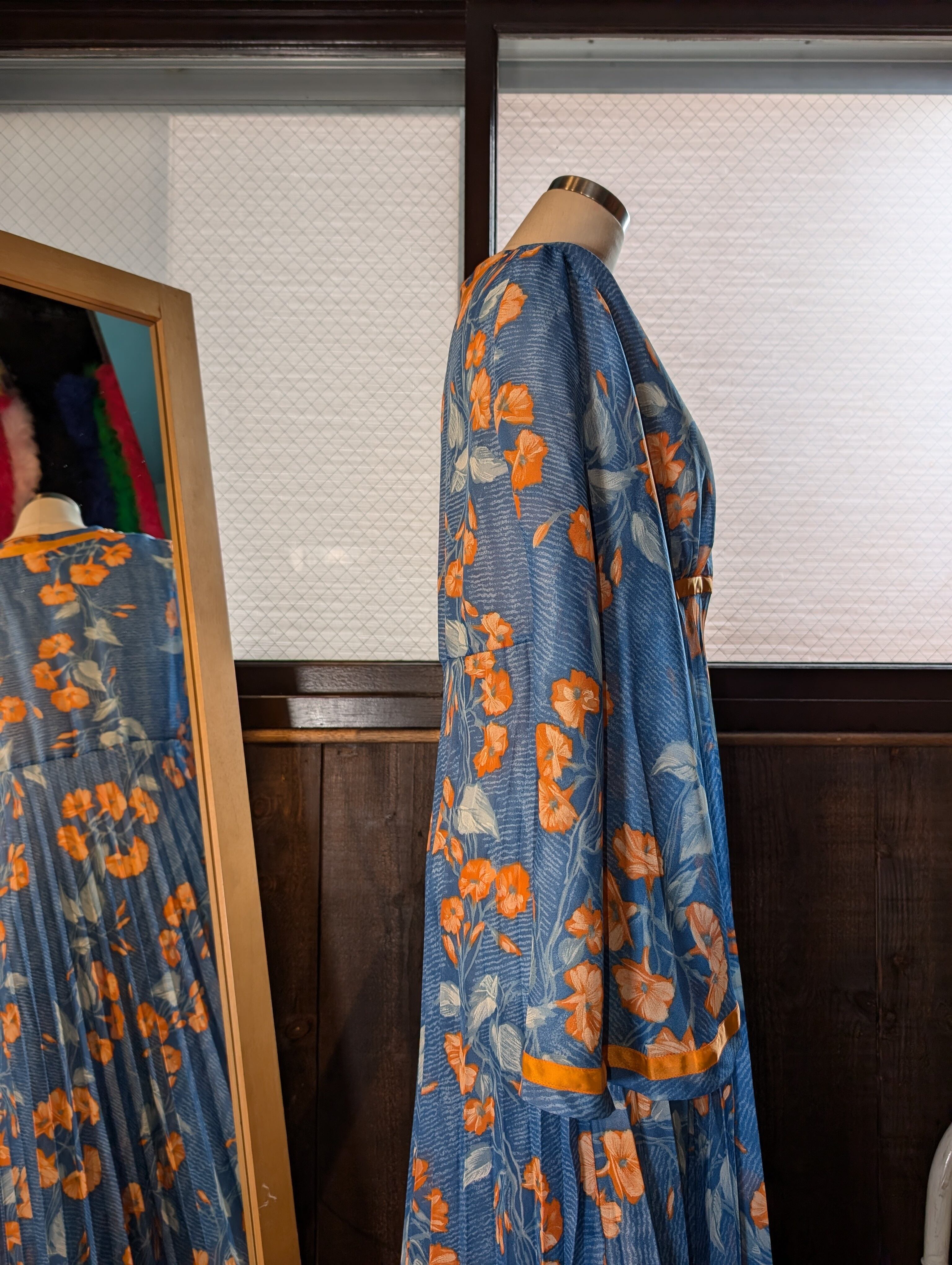 オレンジと青の補色の組み合わせ、すごく好きなのですがお花といいシアーな素材感といい全体的に柔らかい雰囲気なのが素敵。