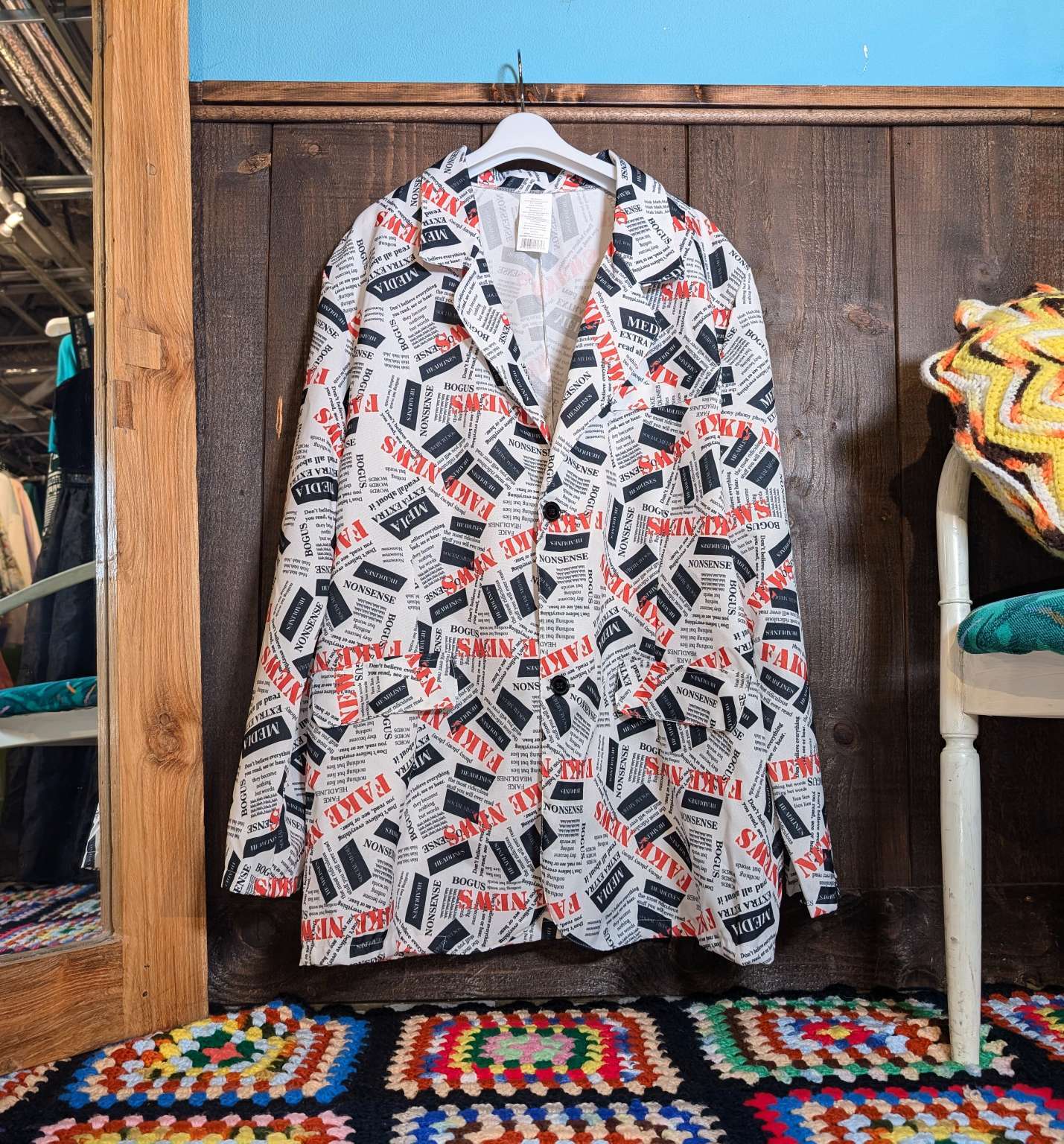 ニュースペーパー系のアイテムはいつだって人気だし、私も好きですがこのジャケットは偽物やらナンセンスやら、全てを信じてはいけないやらの文言がびっしり書かれています。真面目なフォントとモノトーン×赤が良いですね。