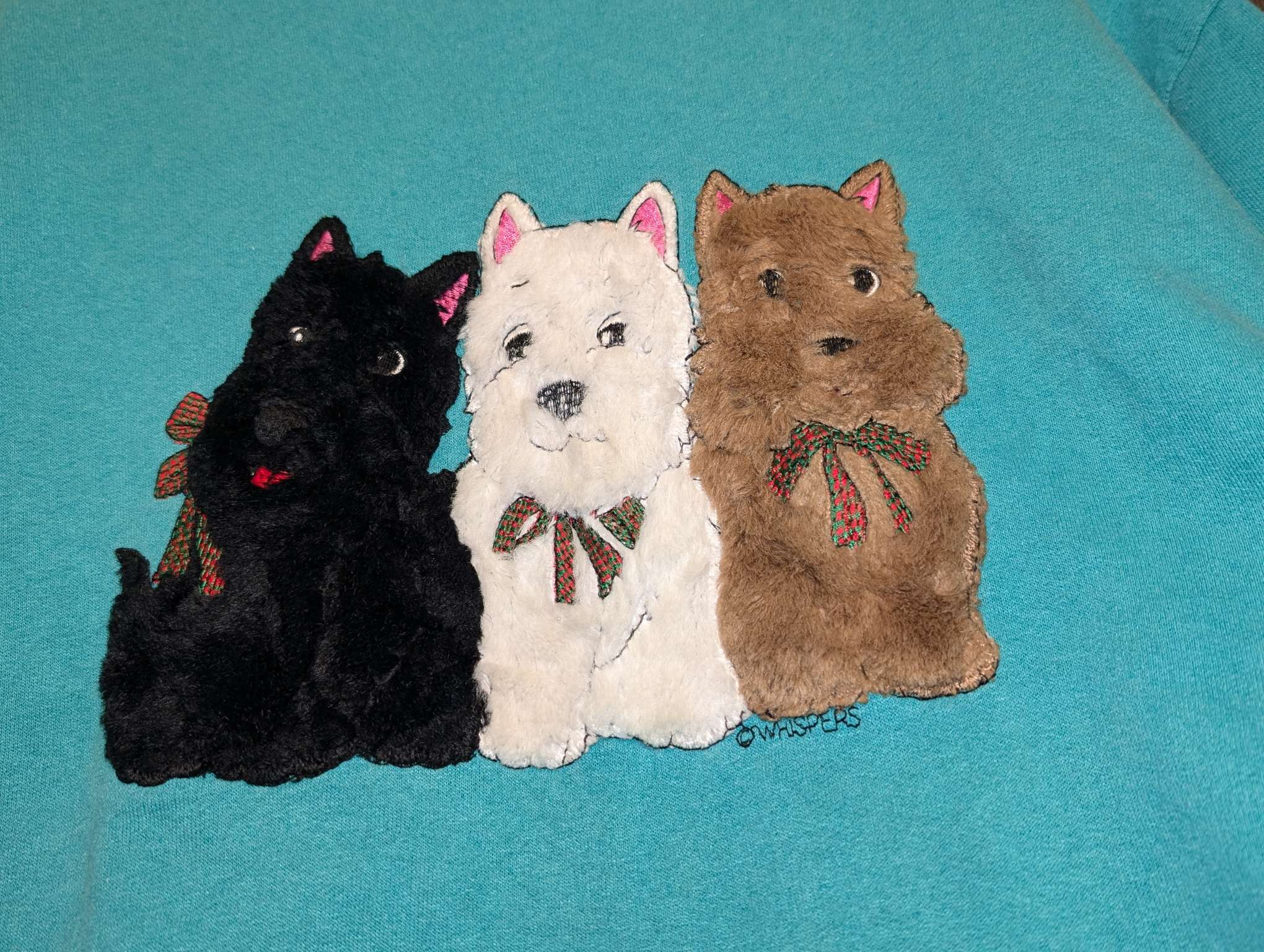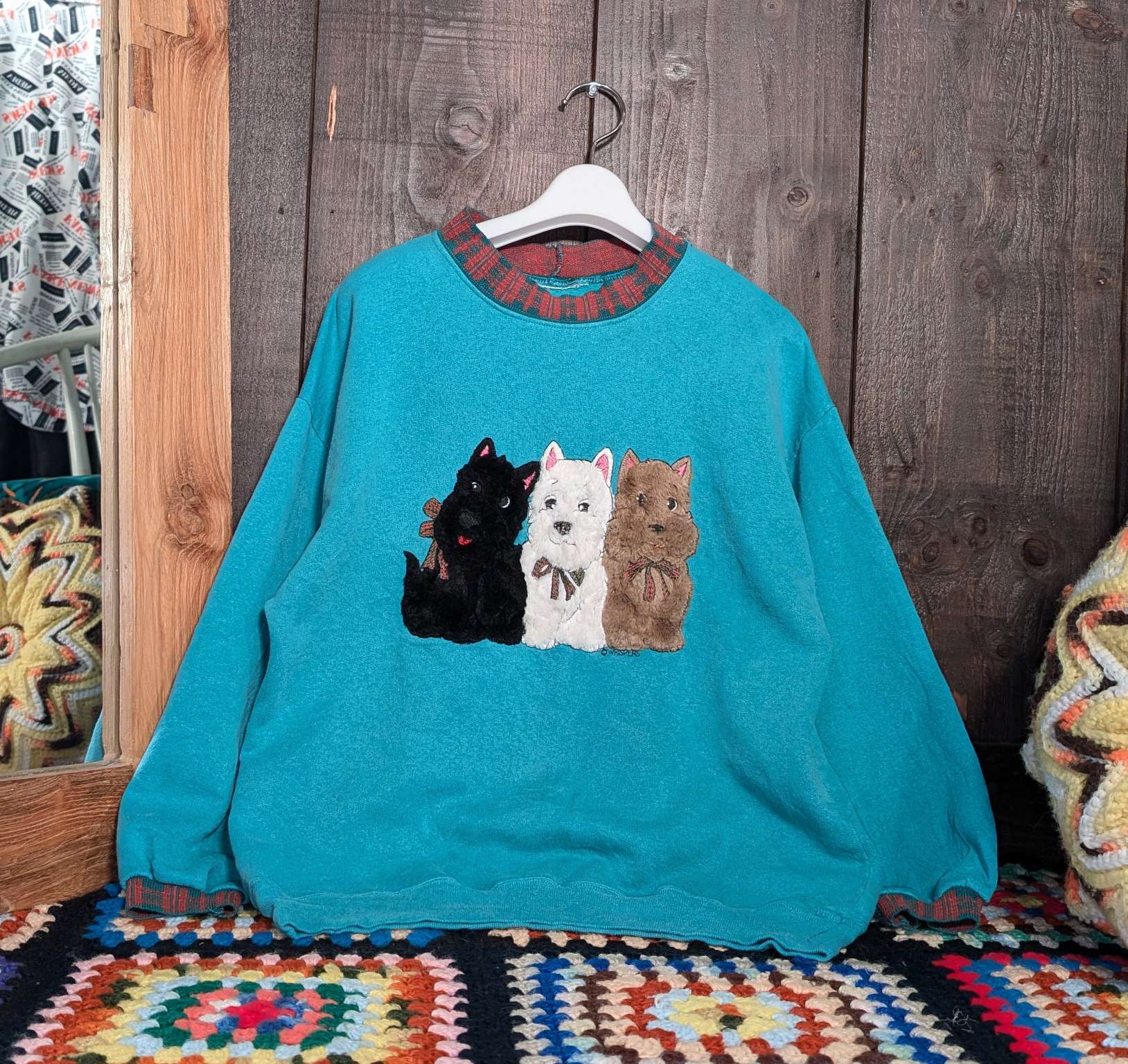 ぎゅっと集まったモッコモコのワンちゃんたちがとってもキュート♡まんまるおめめのチャーミングチャンたちがちょこんとお座りしています。それぞれ付けているおそろいのリボンは、スウェットのリブ部分ともおそろいのチェック柄。
