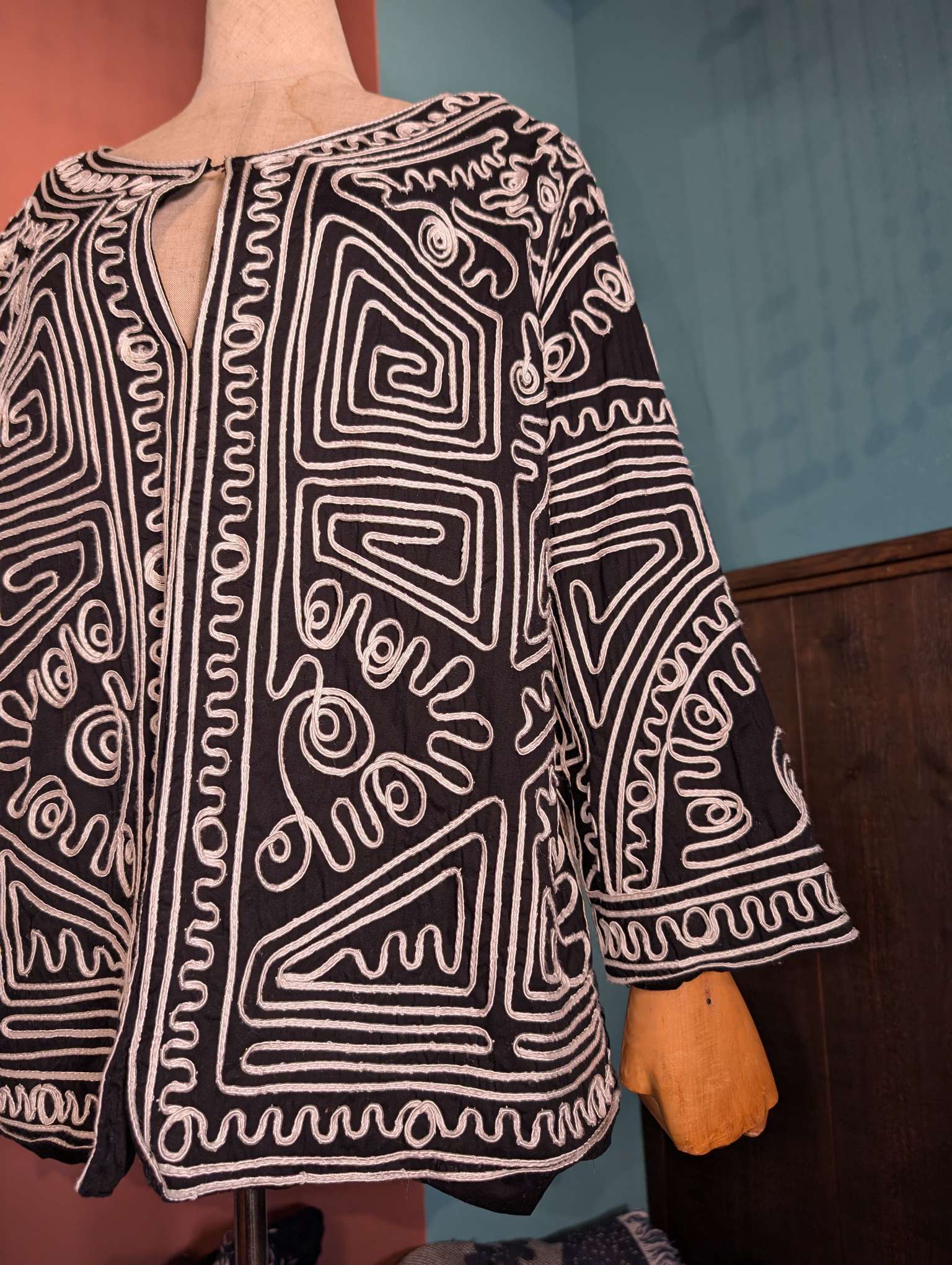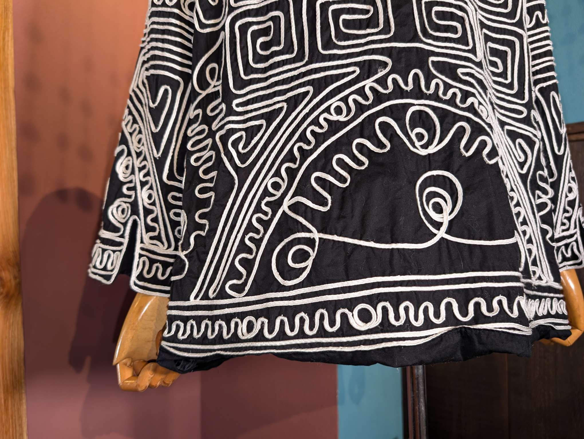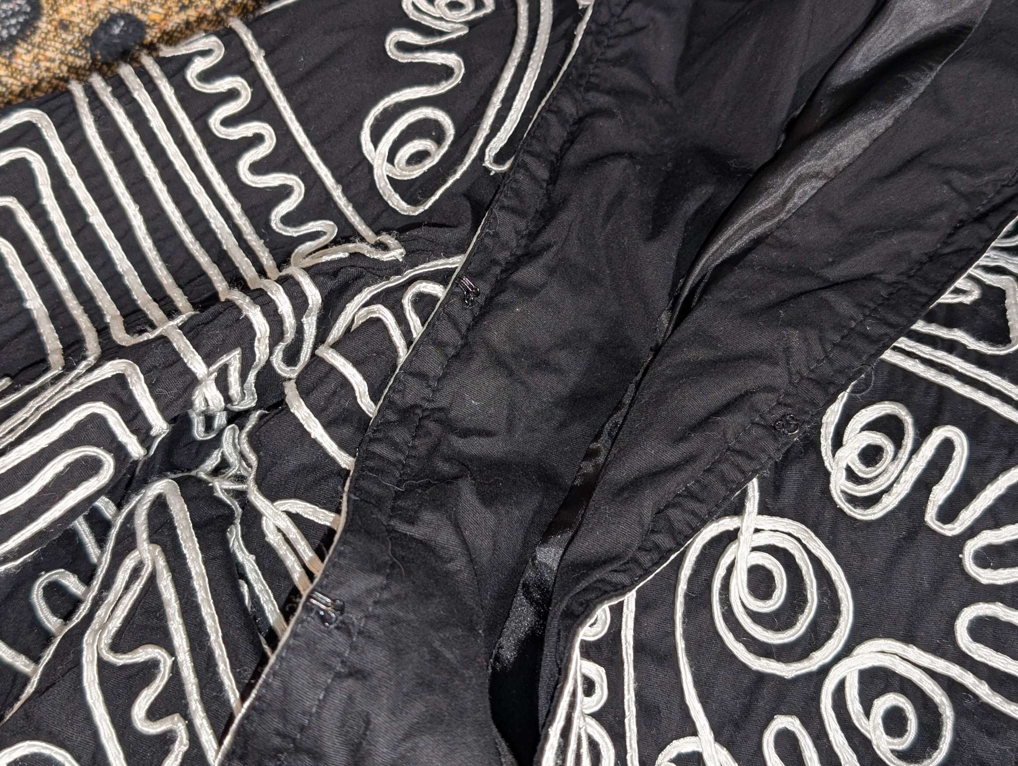 光沢のあるリボンからなる刺繍のデザインが、圧巻。地上絵とか好きなおいらからするとカッコいいなぁという印象です。黒地にシロの総柄が非常に映えます。