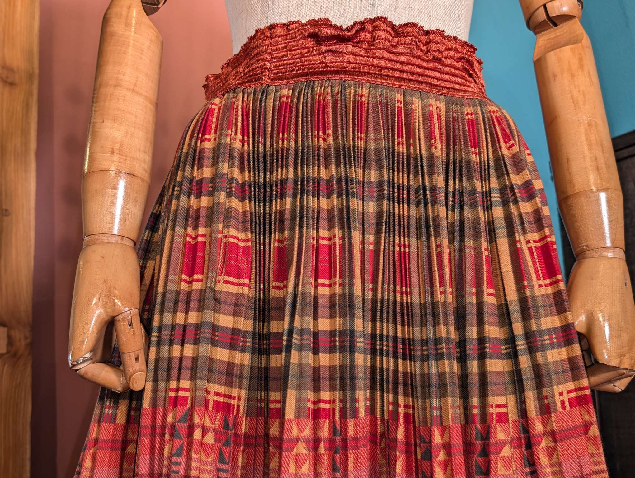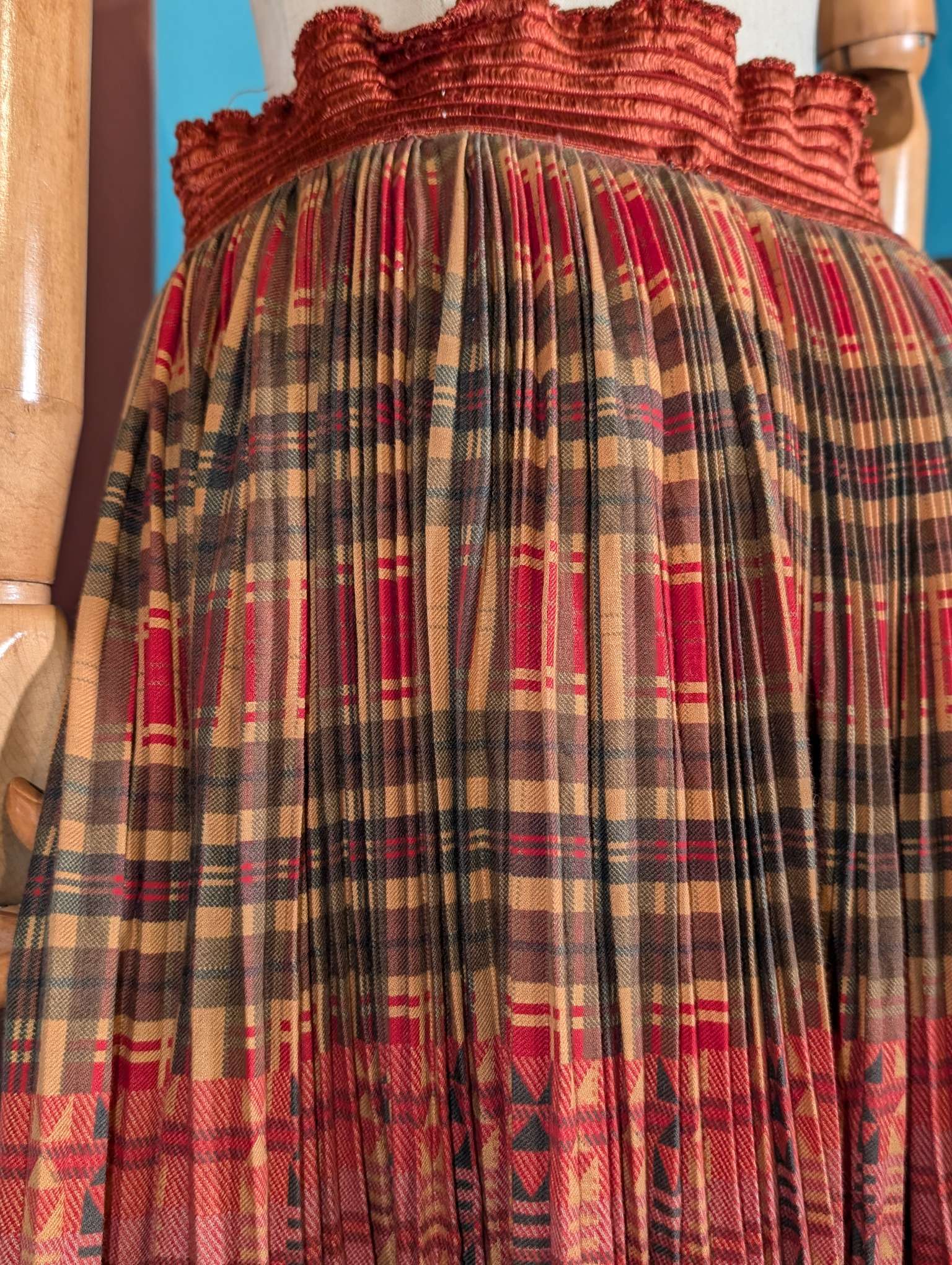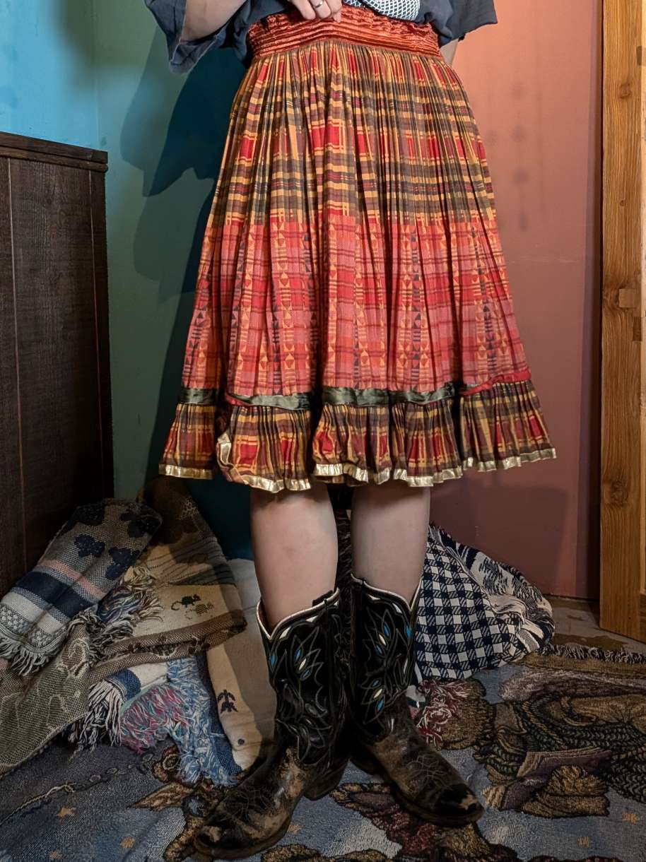 つるりと光沢のあるカラーテープに細やかなアコーディオンプリーツ、裾部分は切り返しで腰回りと同じチェックが施されています。ボリューム感と落ち着きのあるカラーにツルッと光るテープのバランスが非常に素敵。
