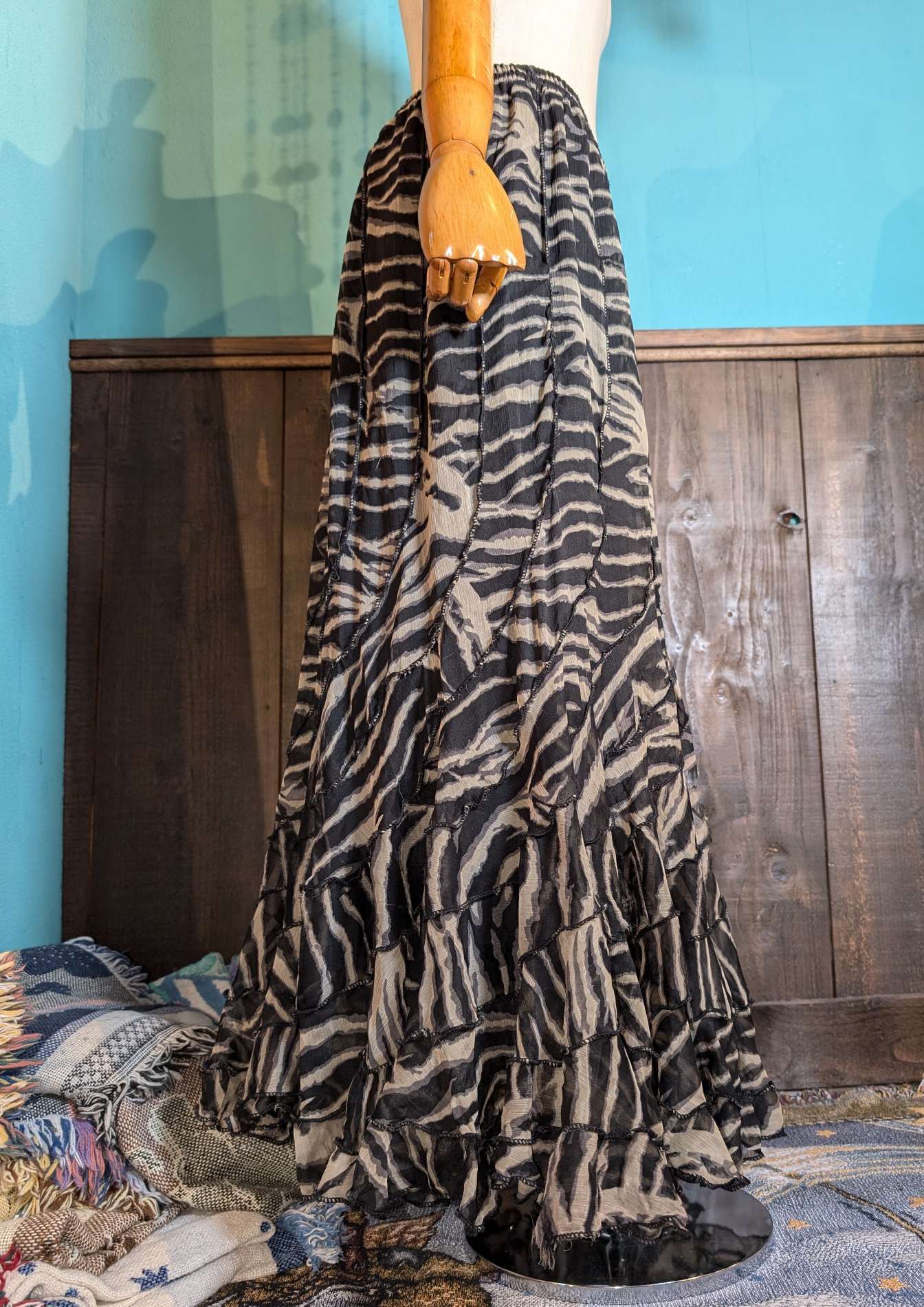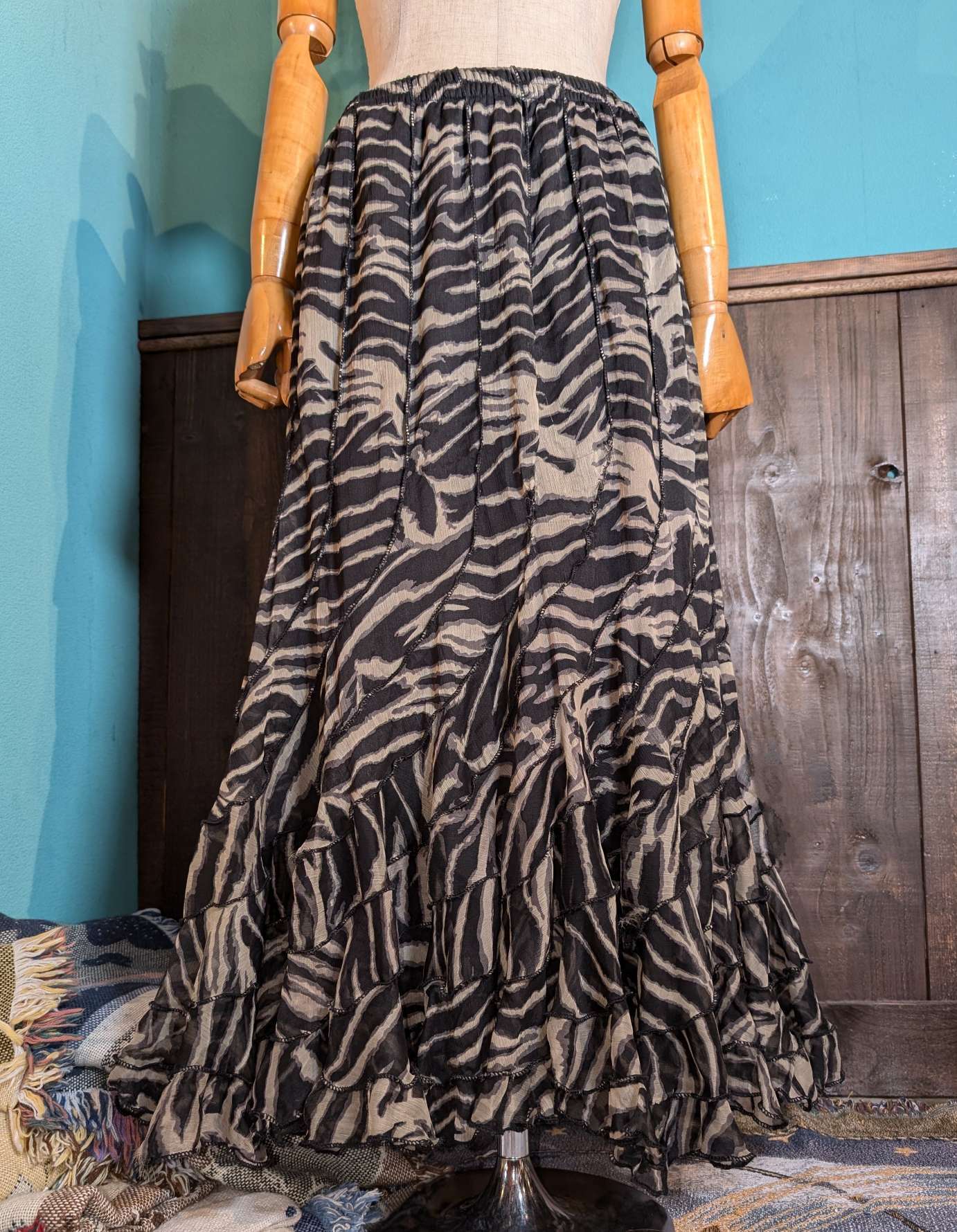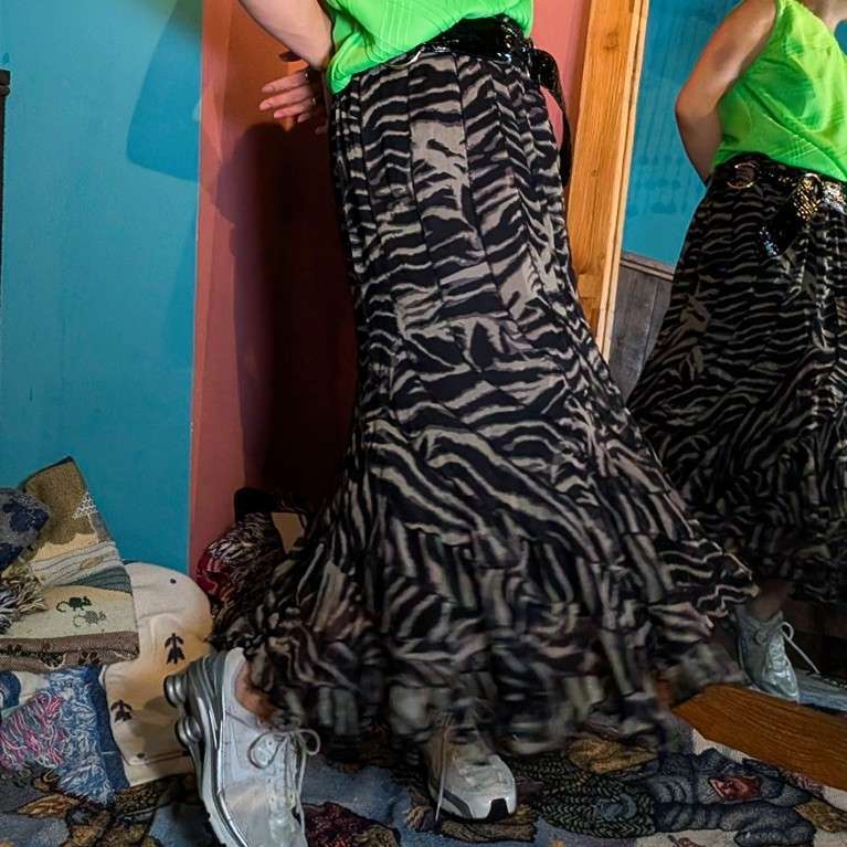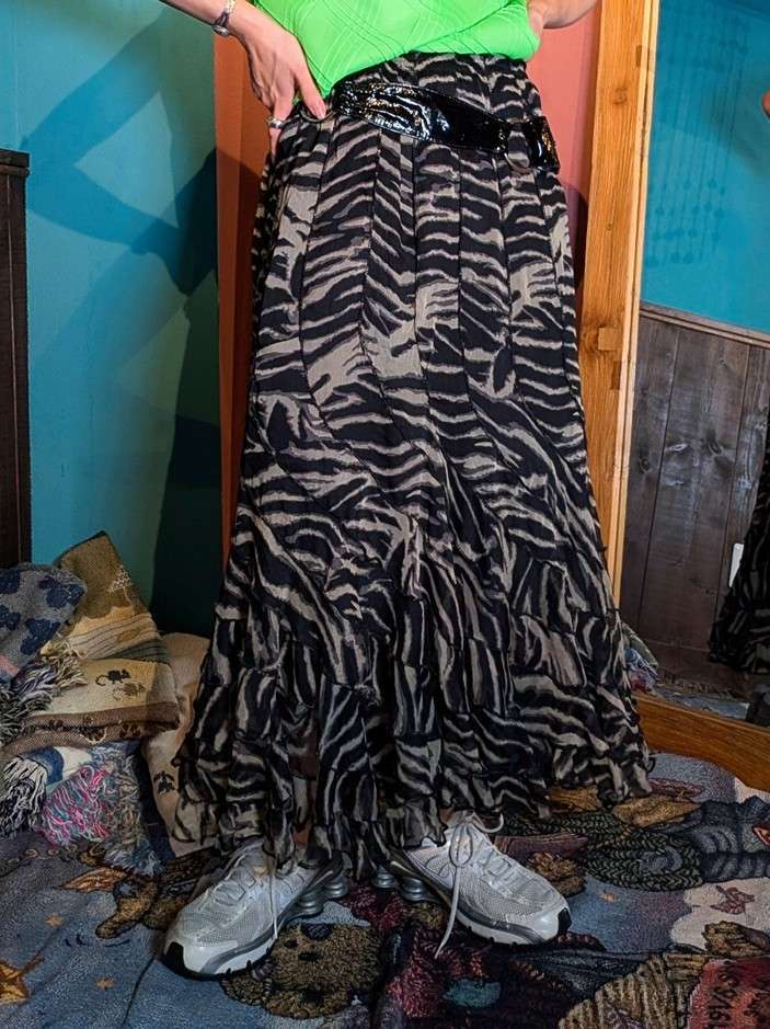 シアーな柔らかいゼブラ柄の素材がたっぷりと使われた、マーメイドシルエットが魅力的。動くともったりと揺れる軽やかさが魅力的。斜めに繋がる合わせ方がユニーク。キャミソールなどと合わせればY2Kな雰囲気に、バンTeeなどと合わせても可愛いです。