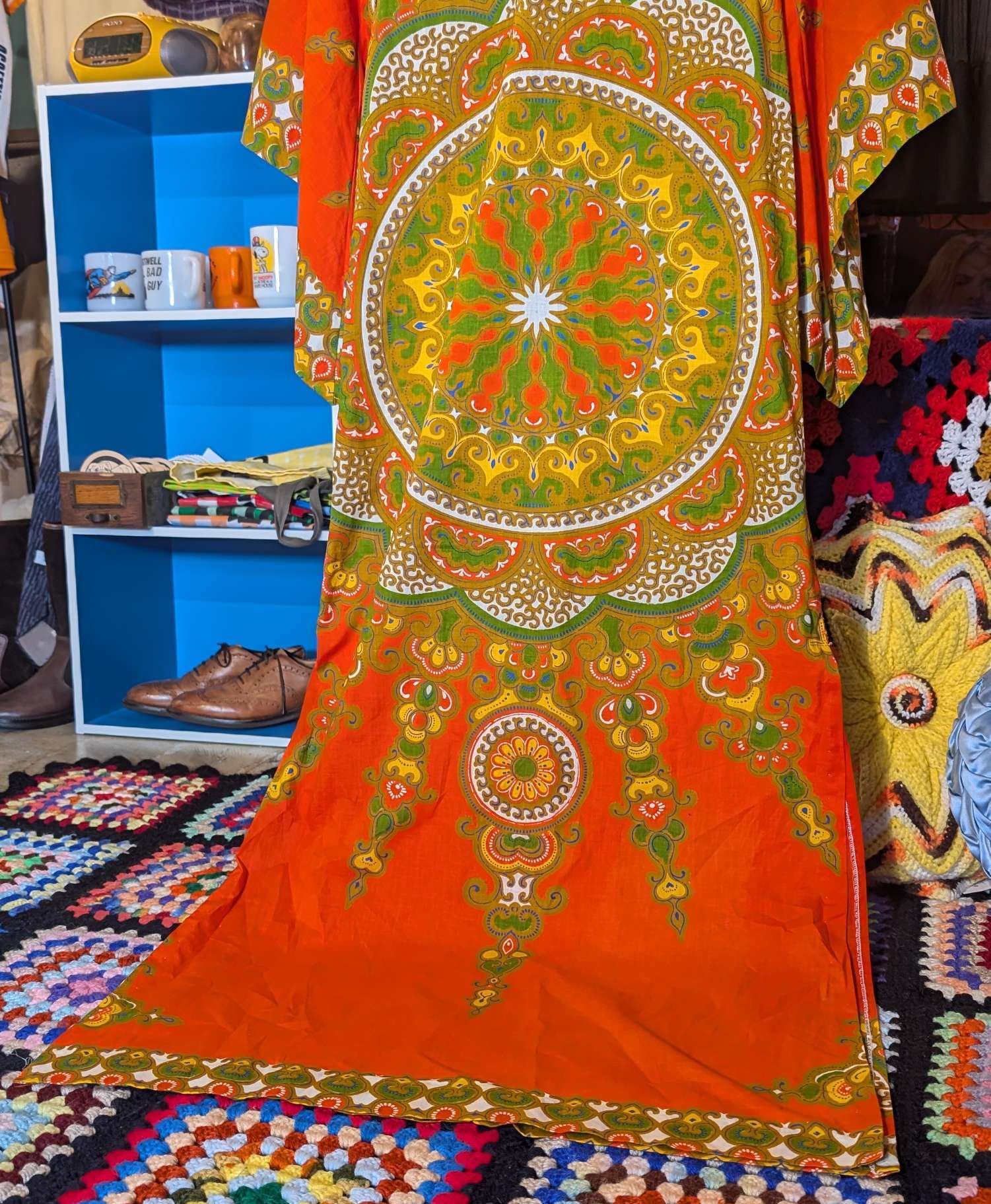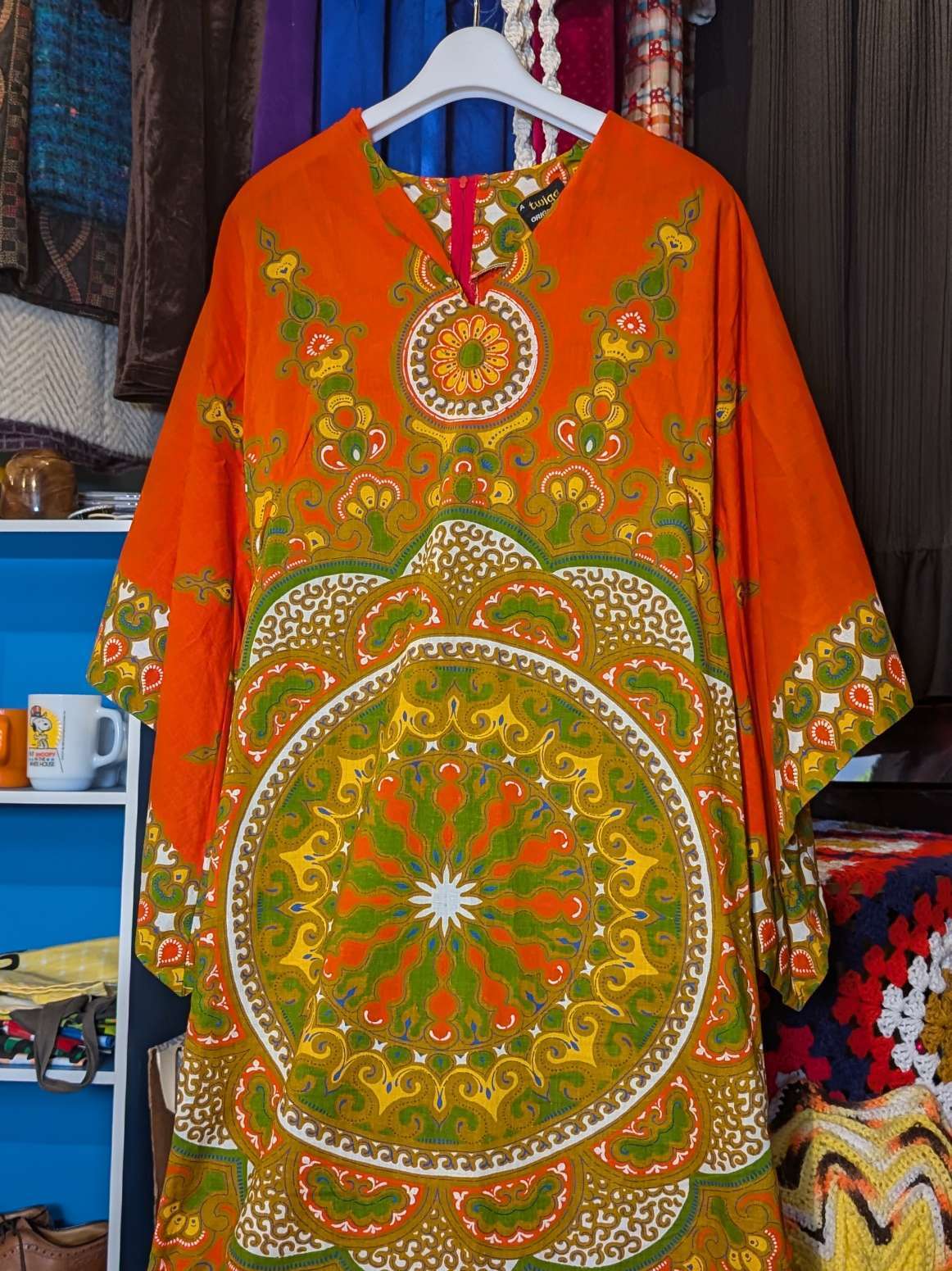 総柄のマキシ丈、鮮やかなオレンジと、オリエンタルなテキスタイルが迫力あり。フレアな袖とスッキリとしたVネック、腰回りは程よいフィット感があるためメリハリのあるシルエットも魅力的です。