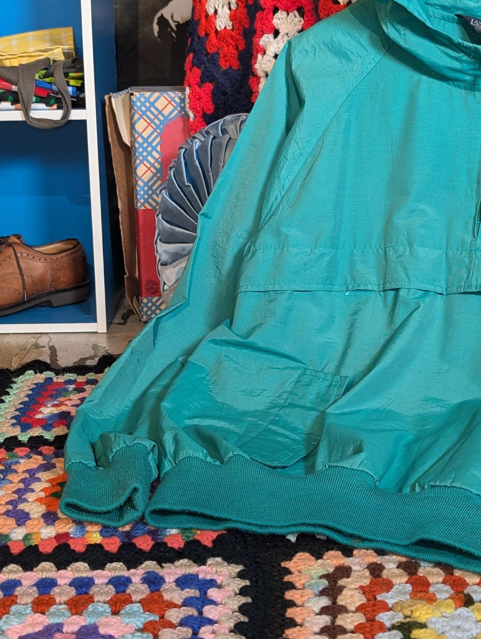 色味は、グリーン×ホワイト。ナイロンとポリのシャカシャカとした質感です。シンプルなデザインながらもナイスなシルエットやカラーリングがとっても魅力的。身幅広めでサラッとゆったり着られます。
