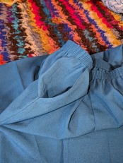 軽やかなポリエステル素材でゴムウェスト。楽な着心地が魅力的です。サラリと着られ、通年使えるのも◎