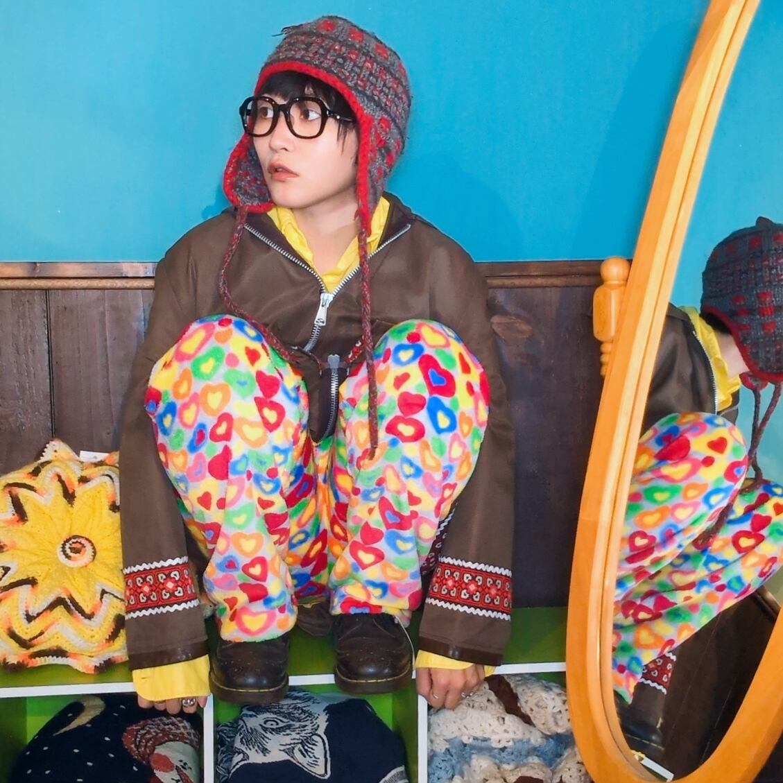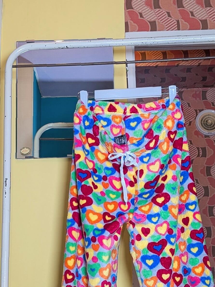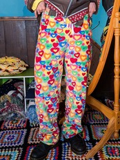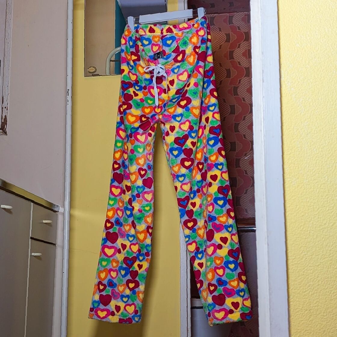 カラフルなハートがたっぷりのフリースパンツ。もこもことした手触りとビビットなテキスタイルが目を惹きます。