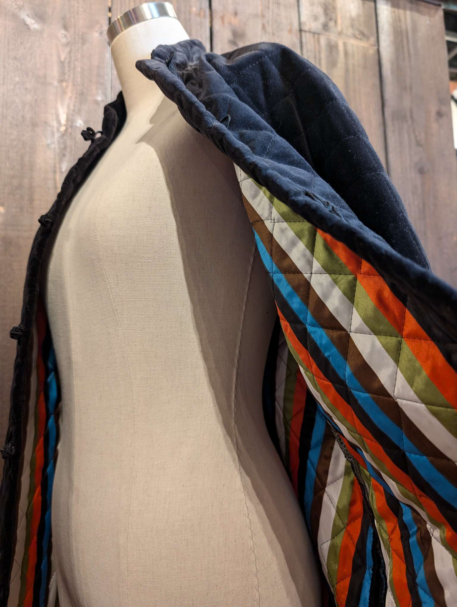 裏地は華やかなストライプ。前を閉めてトップスとして使っても、羽織って動けばビビットなカラーがチラ見えします。袖部分を折り返してもかわいい。