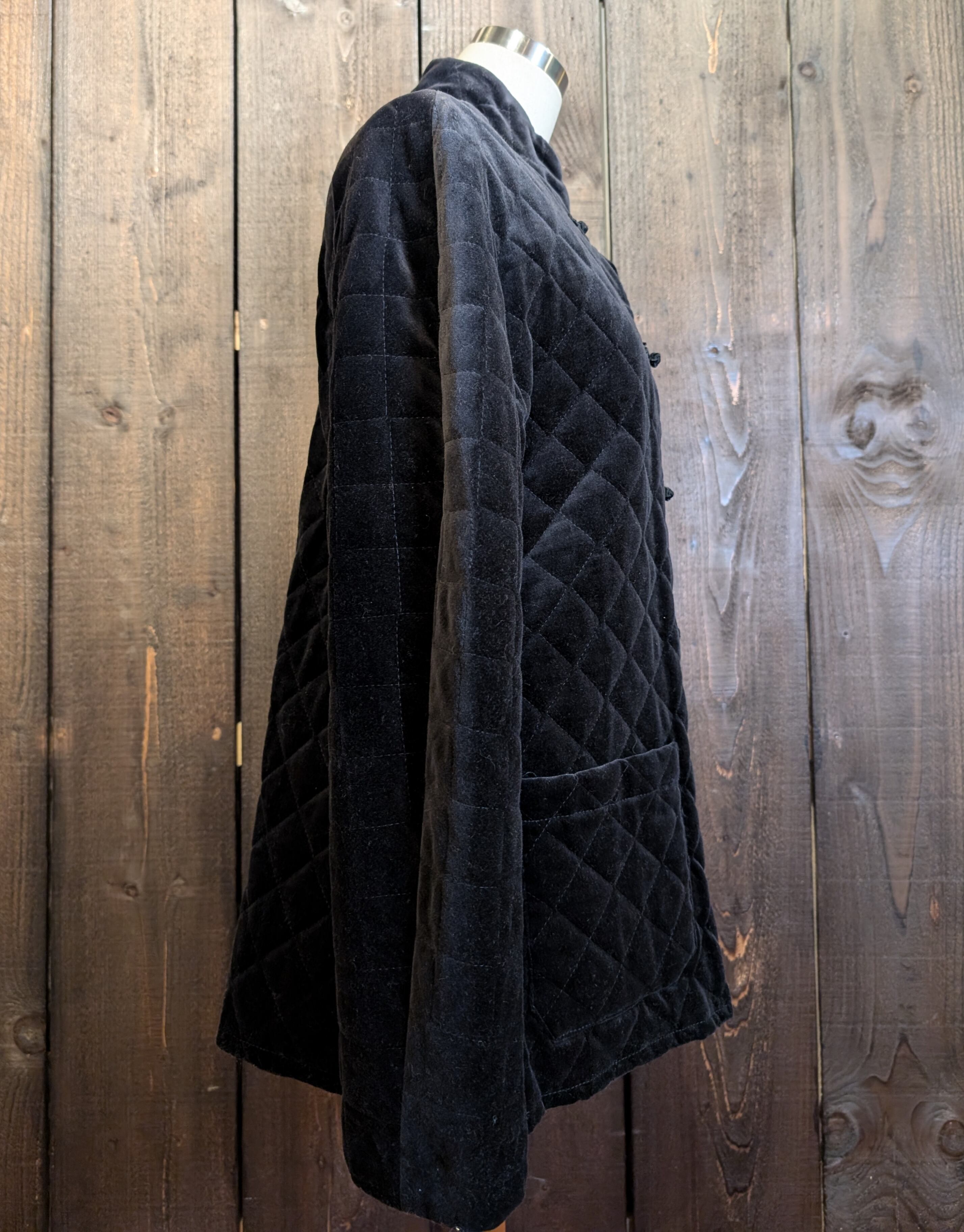 色味は、ブラック。ベロアの重厚感のある上品な雰囲気とチャイナボタンのデザインが魅力的◎ライトに羽織れる軽やかさで通年使いやすいです。