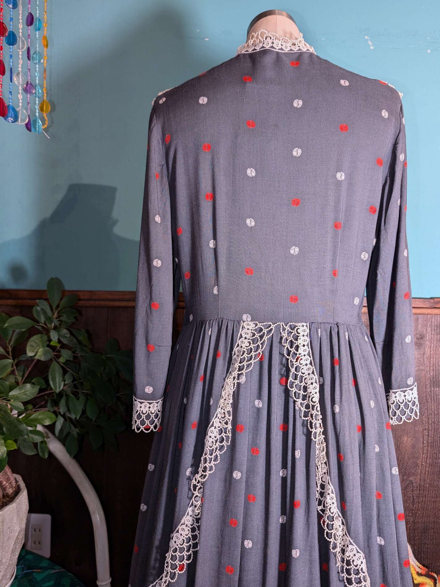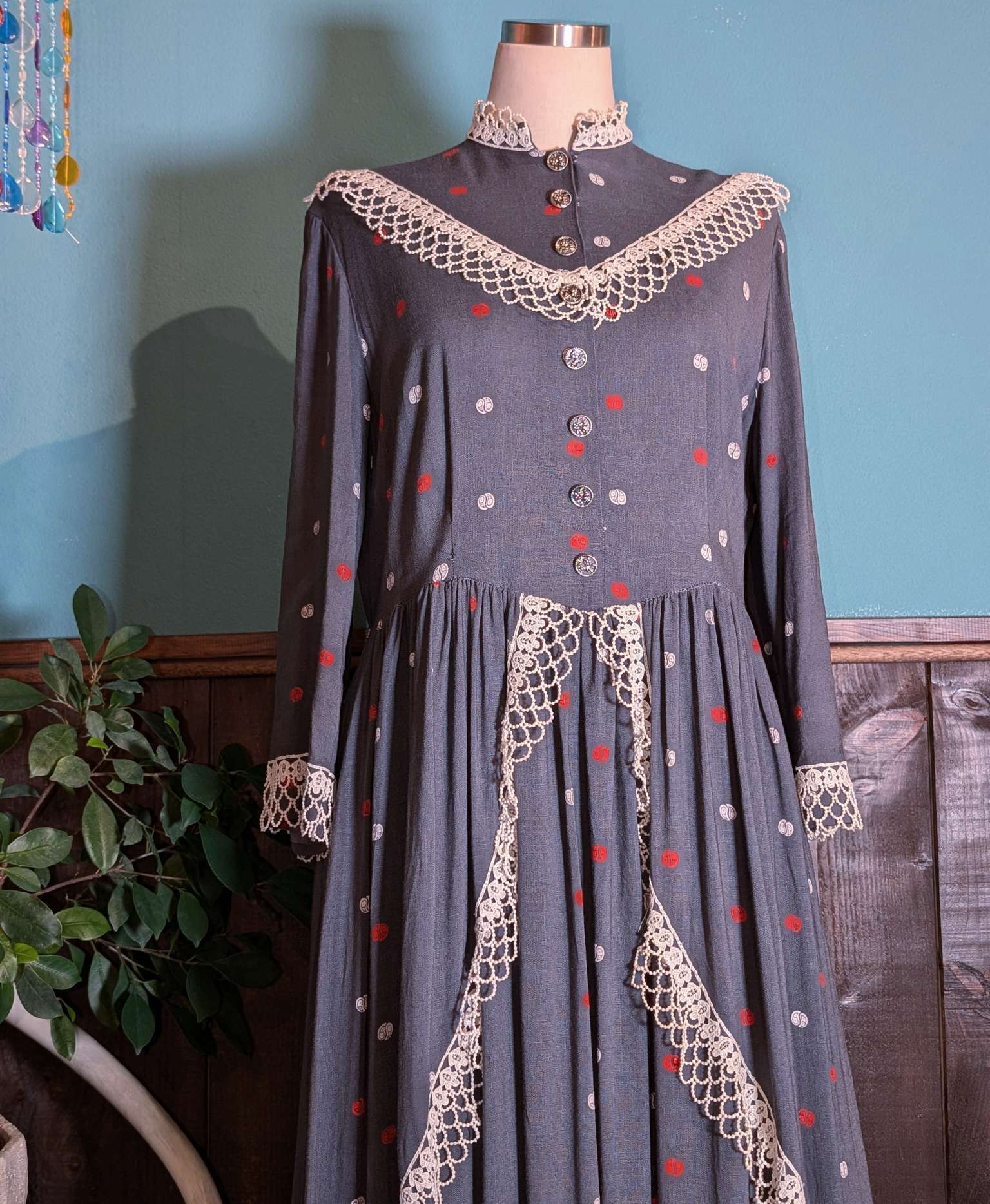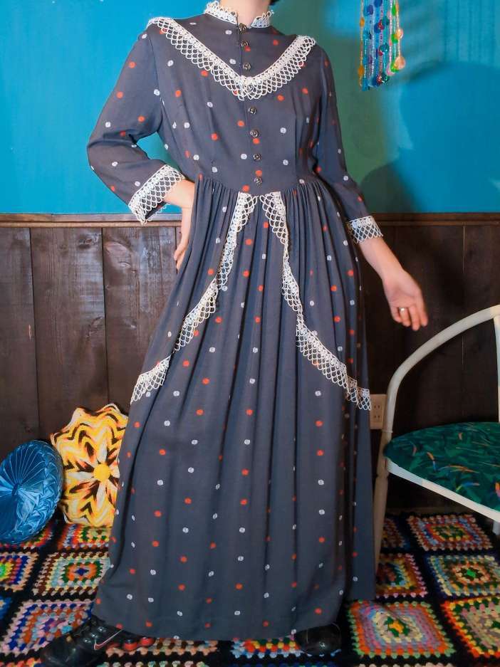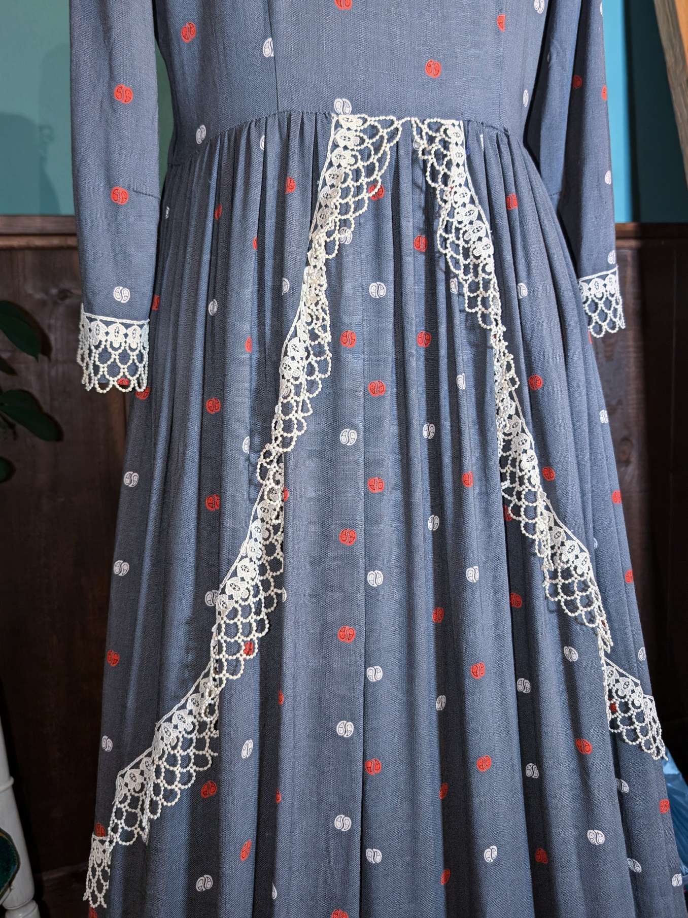 レースのハイネックでマキシ丈の上品なデザイン。襟もと袖元、スカート部分にはレースがあしらわれていたり、ウエスト部分はギャザーが寄せられていたりと可愛らしい雰囲気が散らばるディティール。
