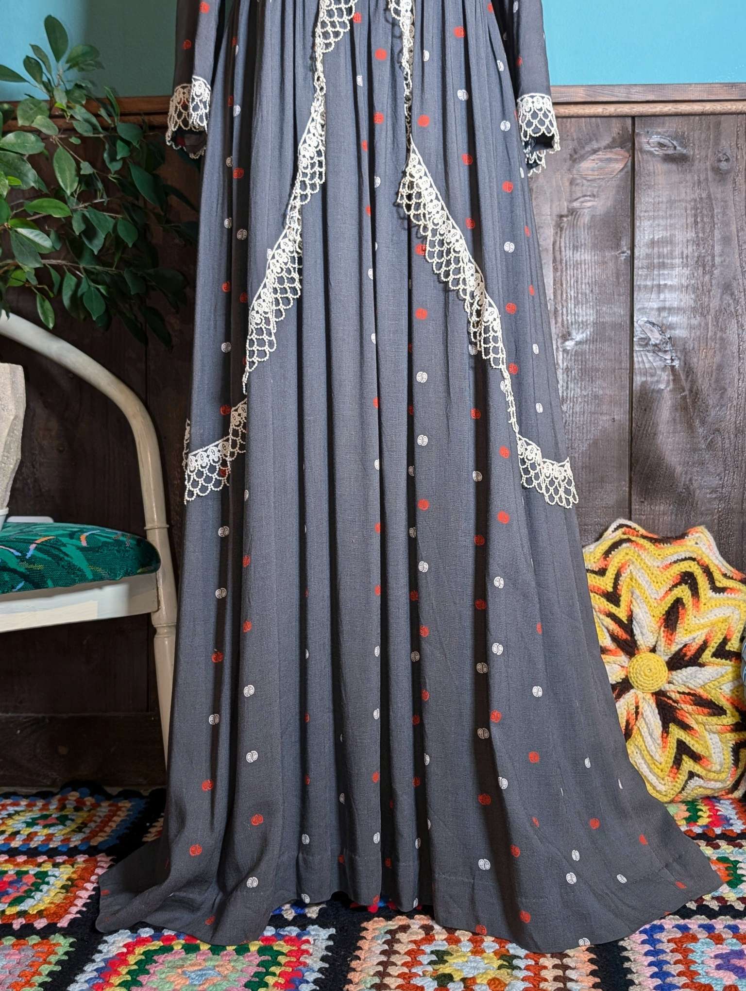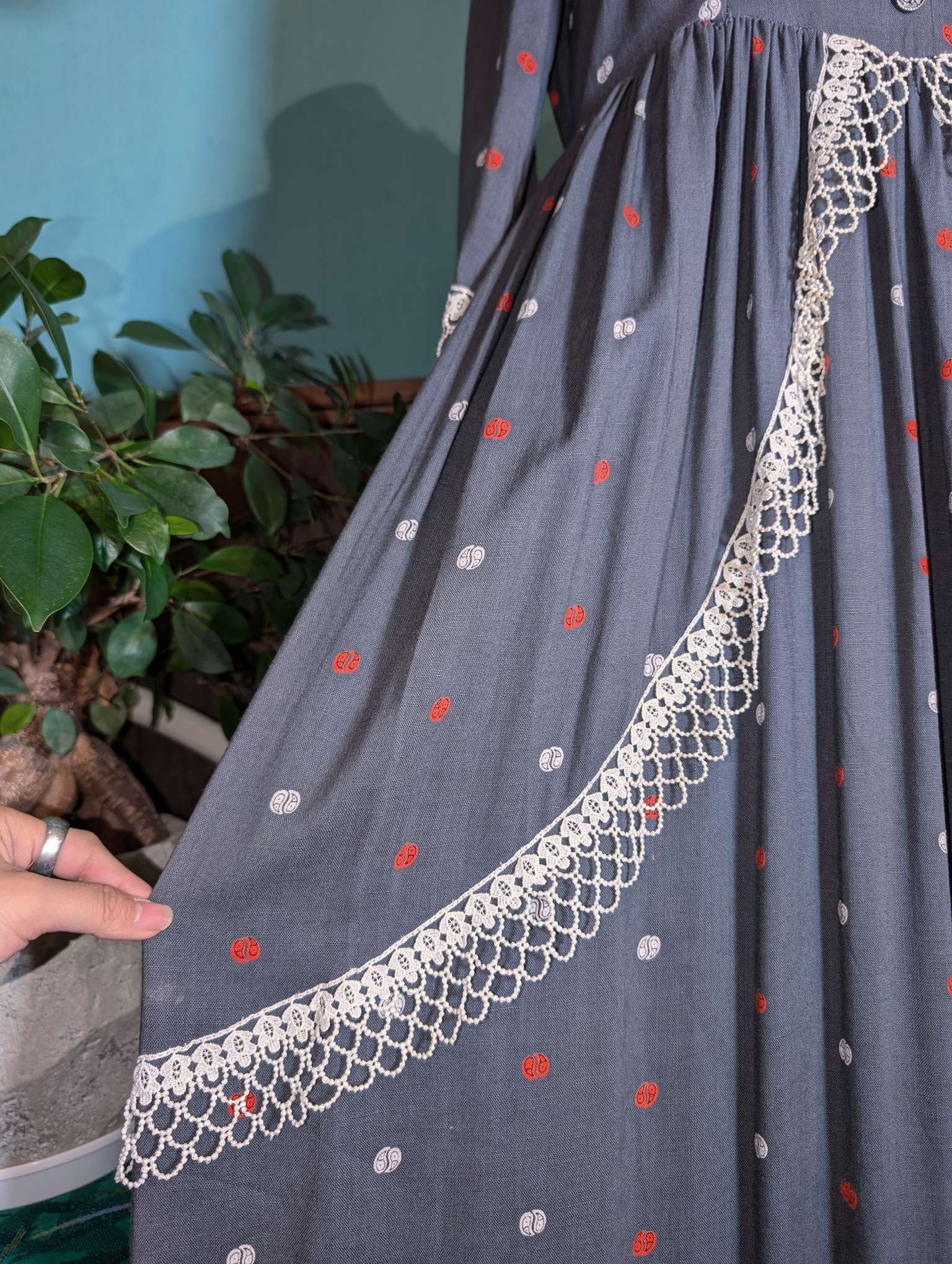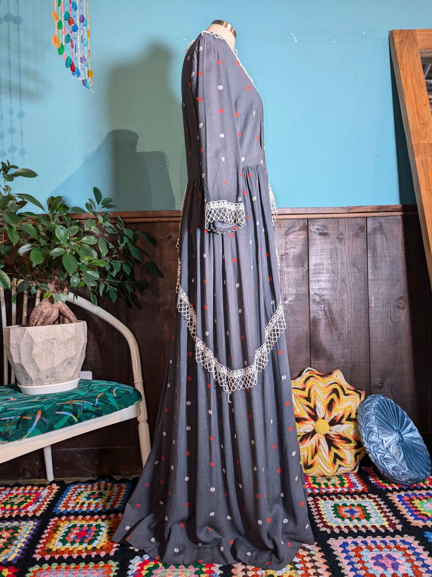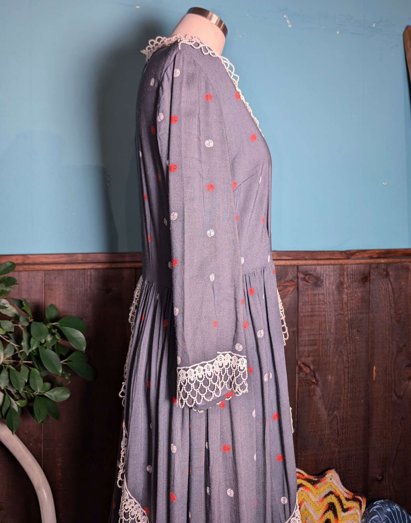 レースのハイネックでマキシ丈の上品なデザイン。襟もと袖元、スカート部分にはレースがあしらわれていたり、ウエスト部分はギャザーが寄せられていたりと可愛らしい雰囲気が散らばるディティール。