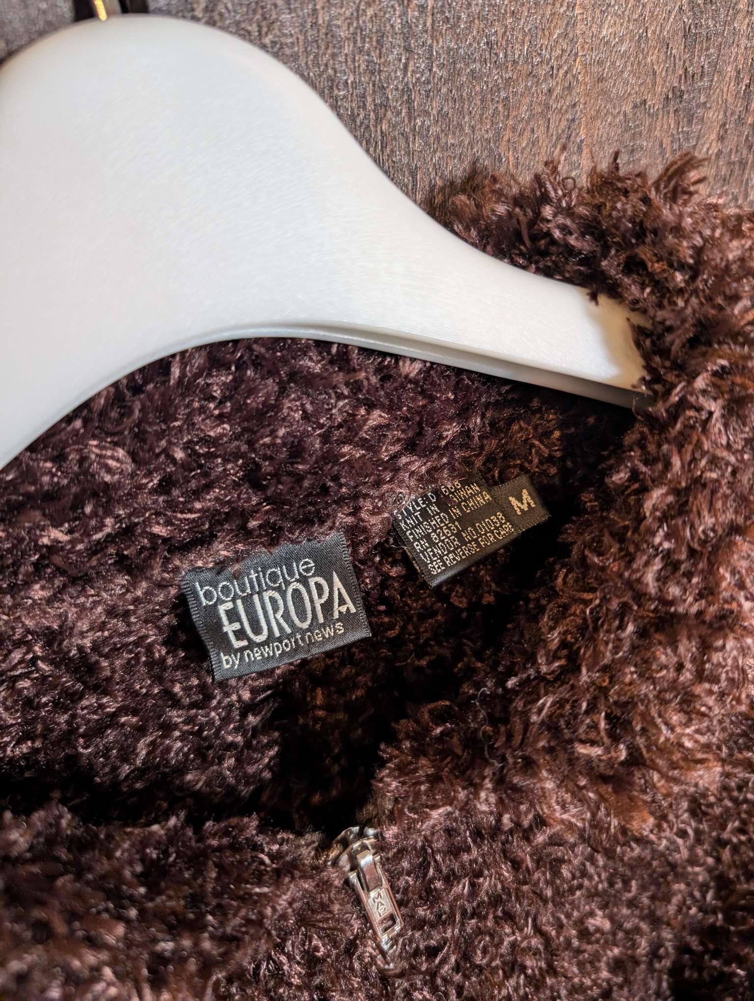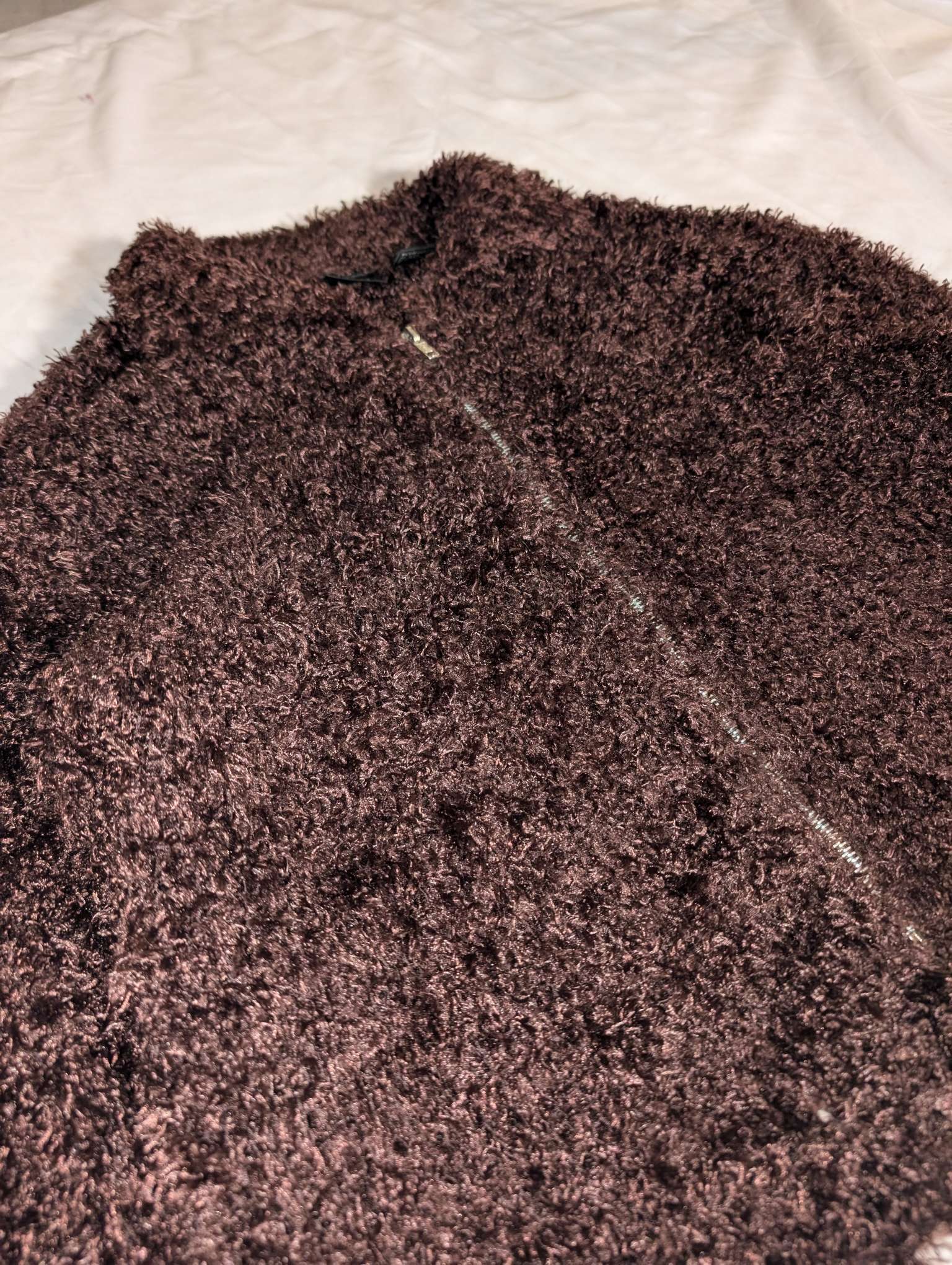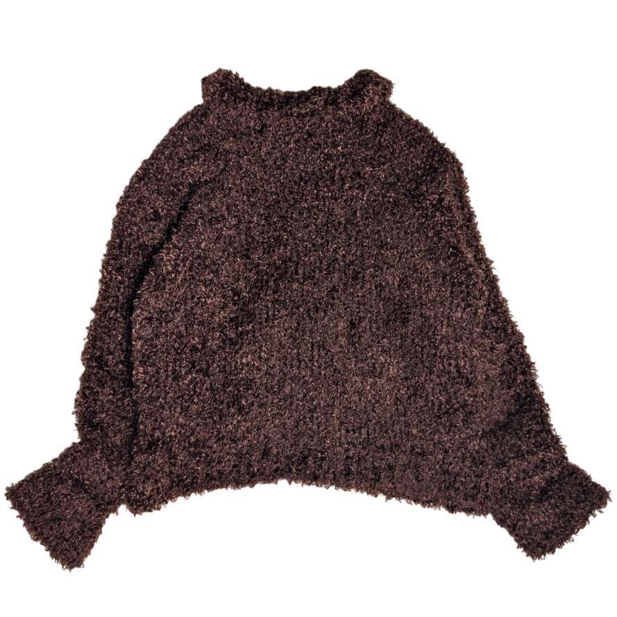 色味は、ブラウン。シャギーのニットでほわほわもこもことしています。艶感のあるニット生地、着丈は短めで伸縮性の高い素材感なので軽やかに着れつつも秋冬らしい雰囲気をプラスできます◎小ぶりな襟部分も可愛らしい。