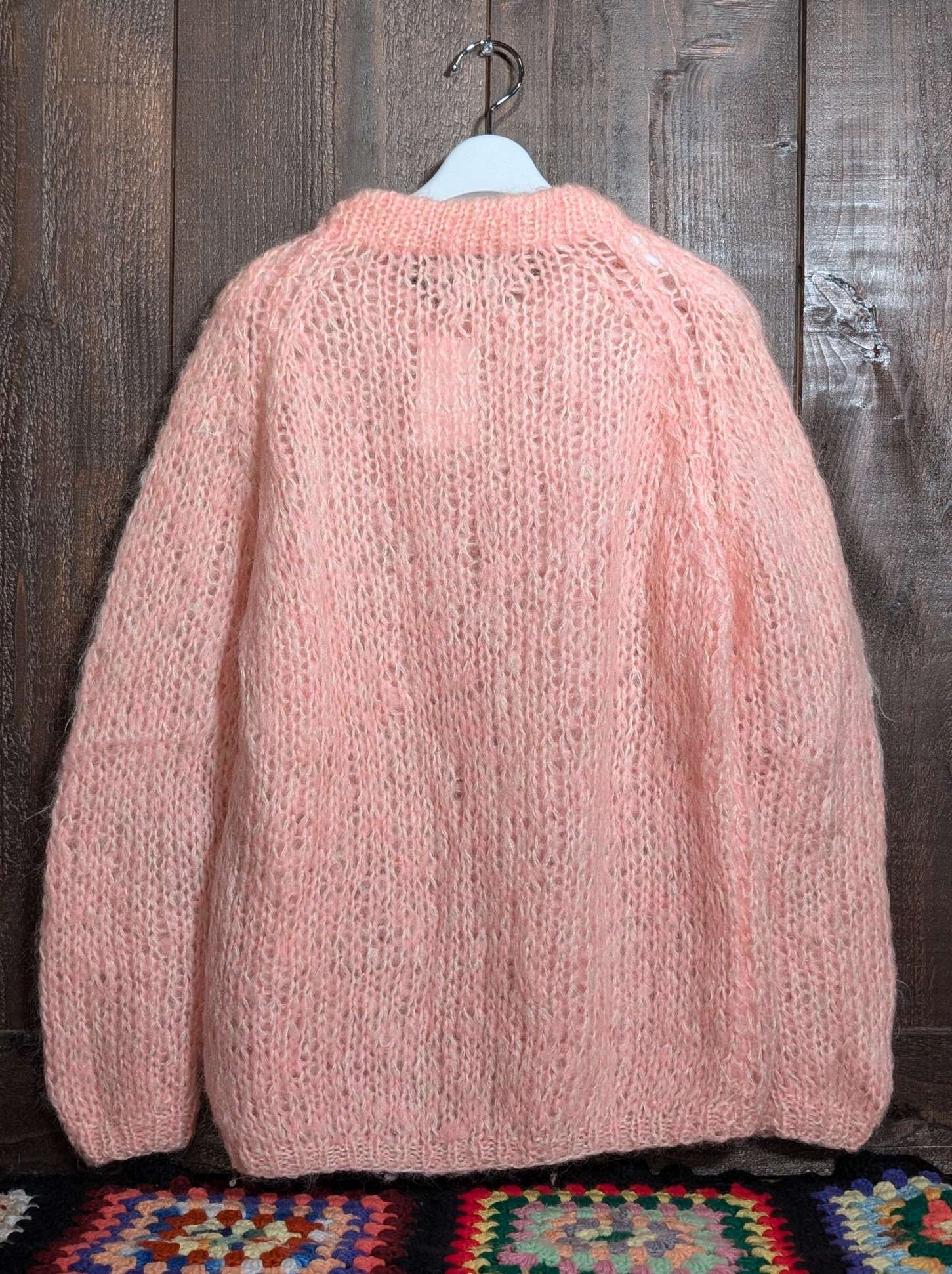 ポコポコとした立体感のある編みが可愛らしく、ゆるゆるとした編みがインナーを透かして見えるのも可愛いです。ウールにモヘア混でもちっと。