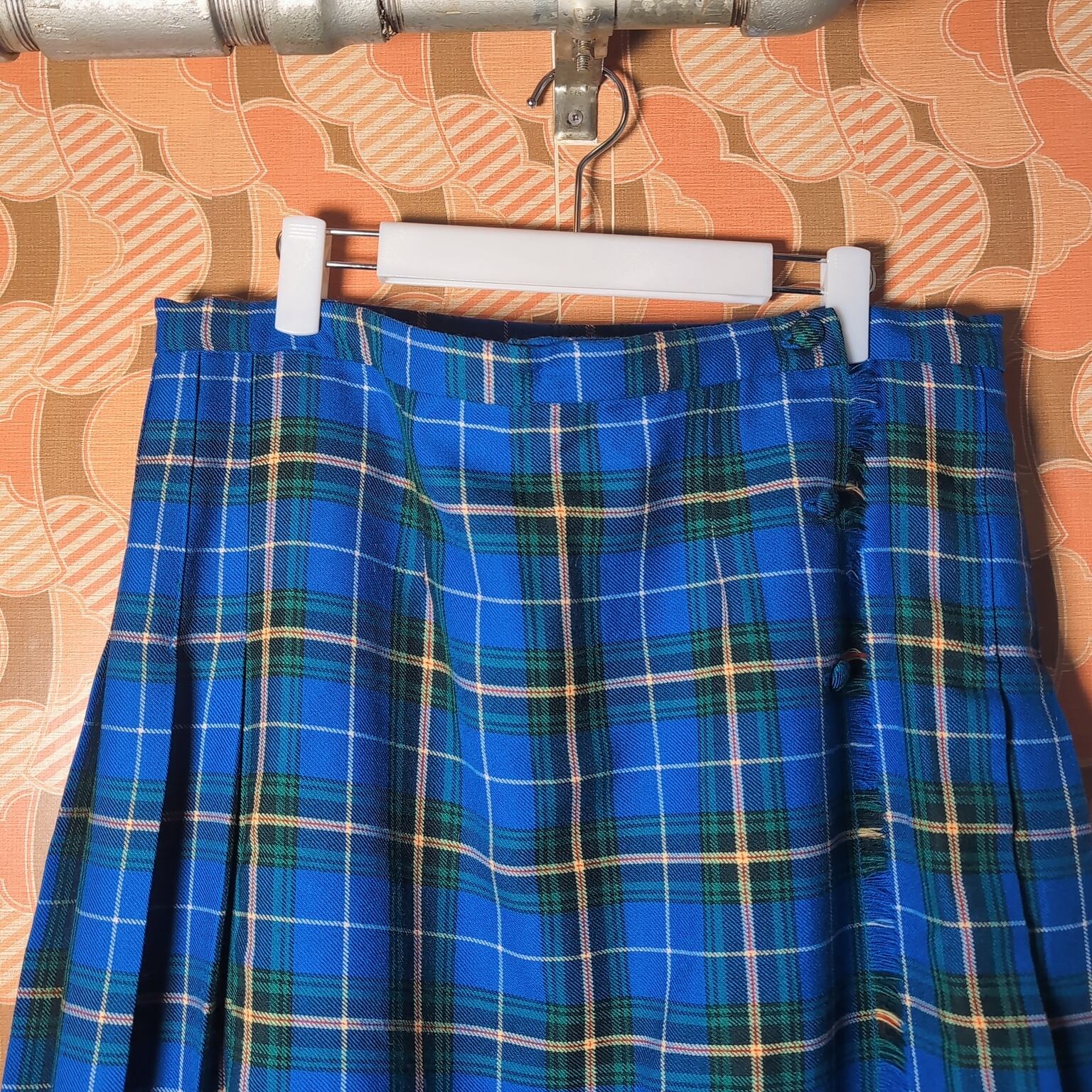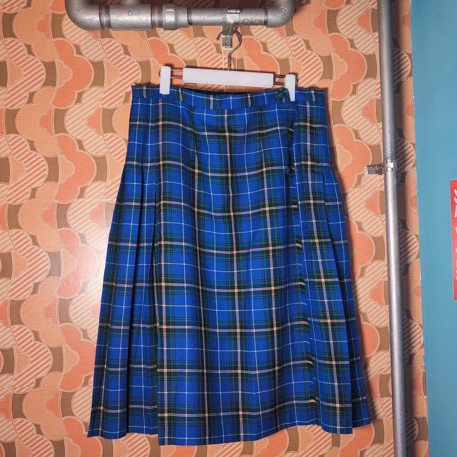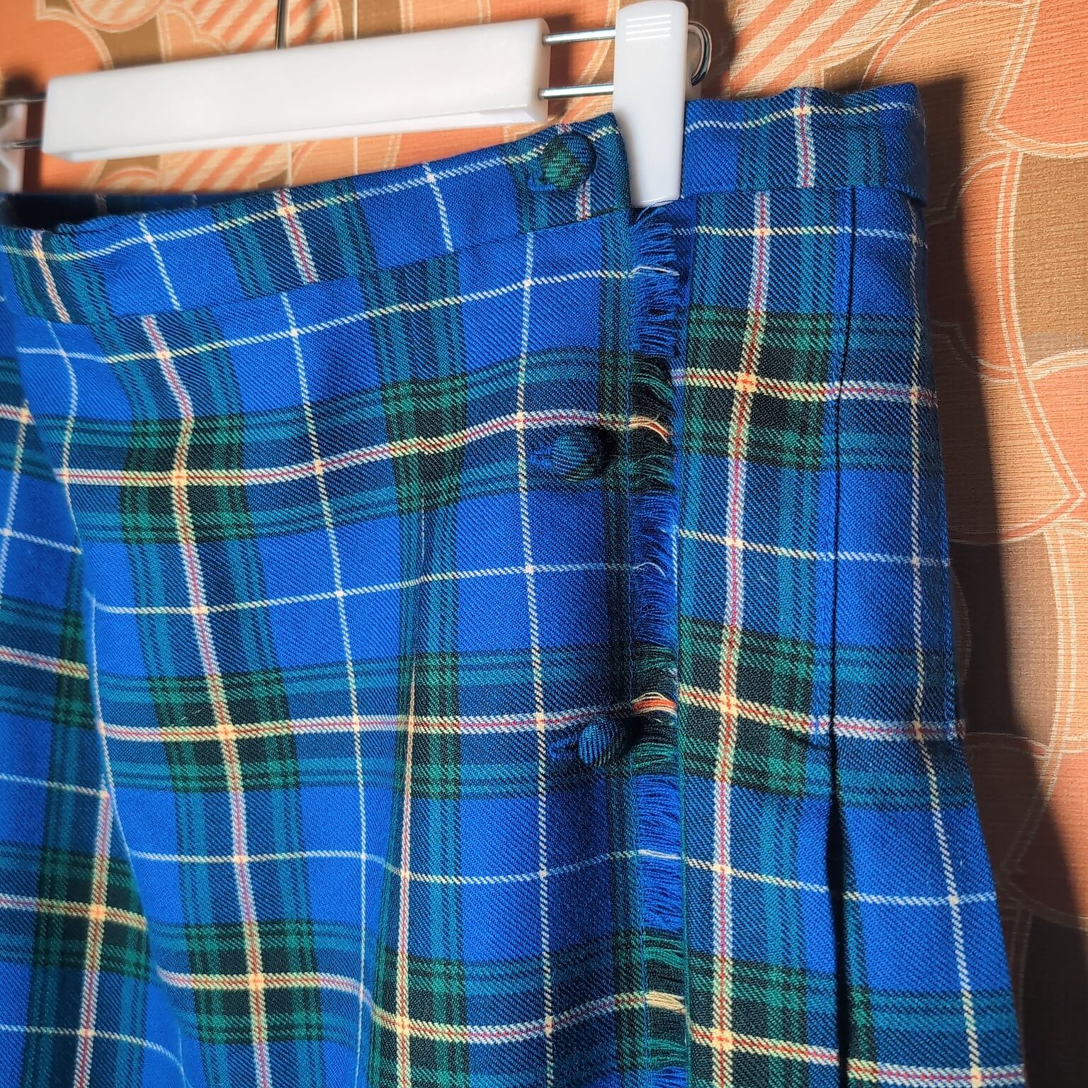 ブルーベースのカラーリングが綺麗な一着。後ろのプリーツ部分は明るいブルーのチェックの隙間から緑のチェックが見え隠れ。