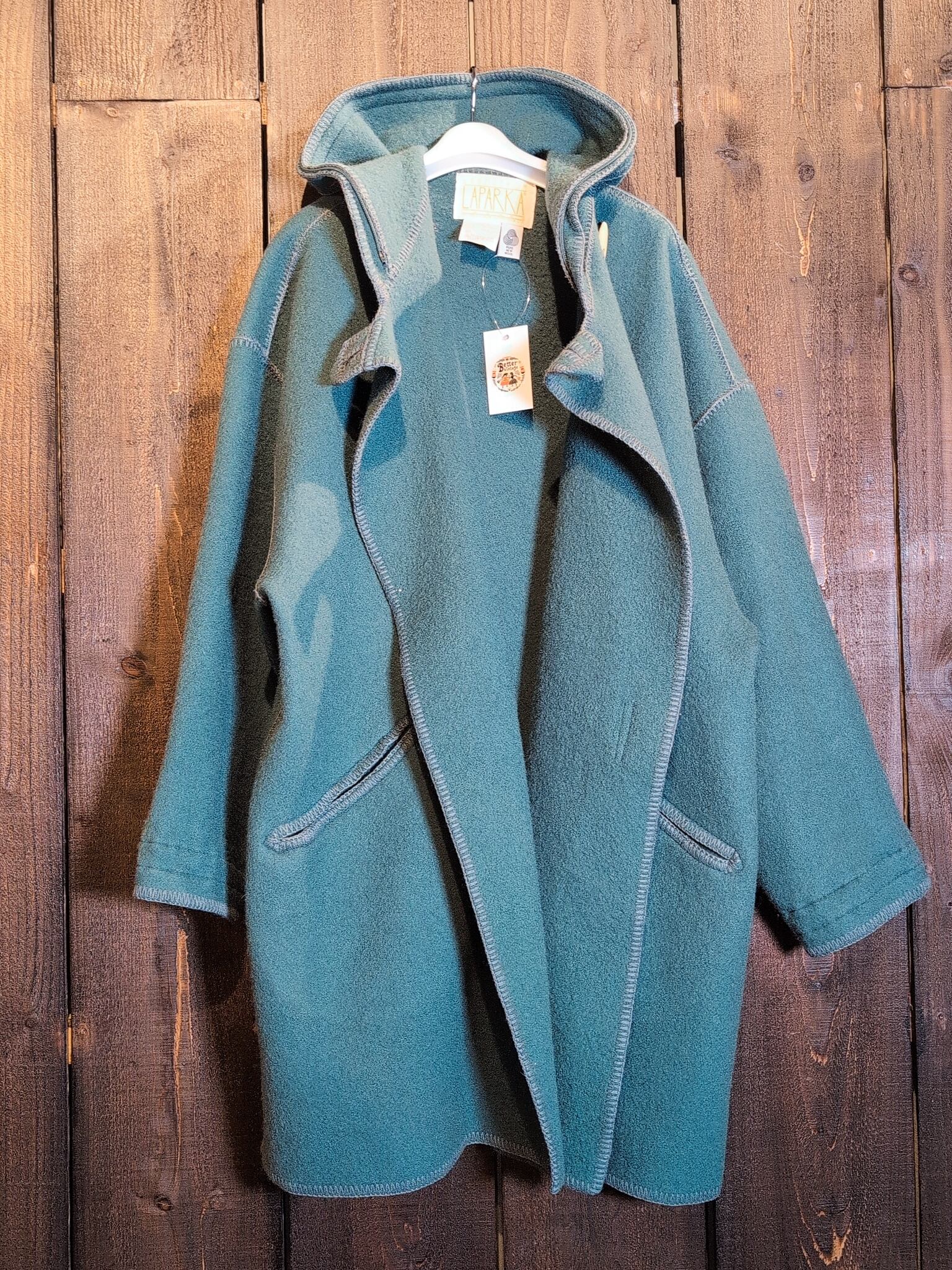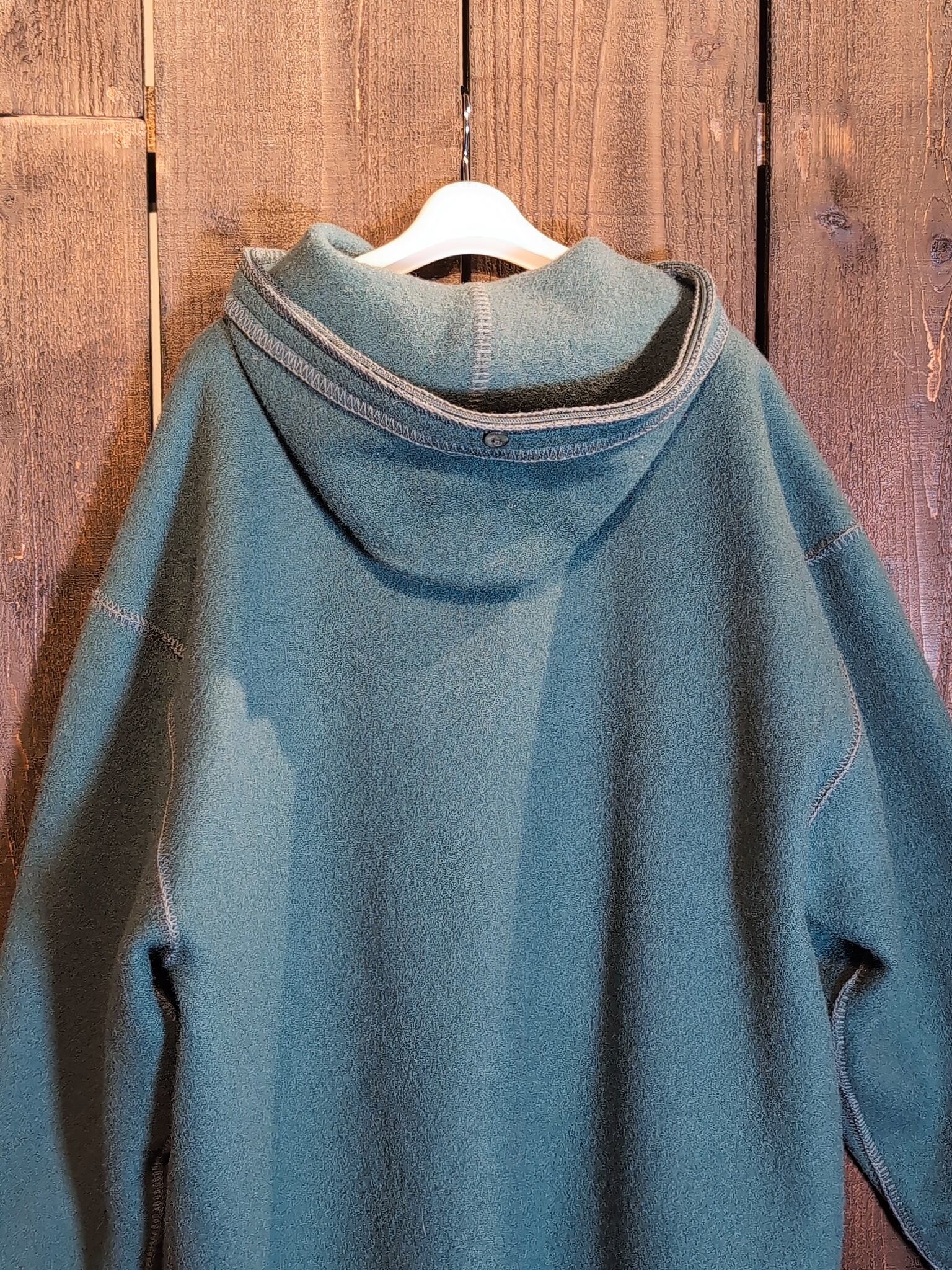 ゆとりあるアームホール、リラックス感のある柔らかなシルエット、カジュアルな雰囲気なフードに反してキチンと上品に留まる襟元、可愛らしいステッチ、捉えるポイントによって印象が変わるディティールが混在しているのがなんともユニーク。
