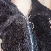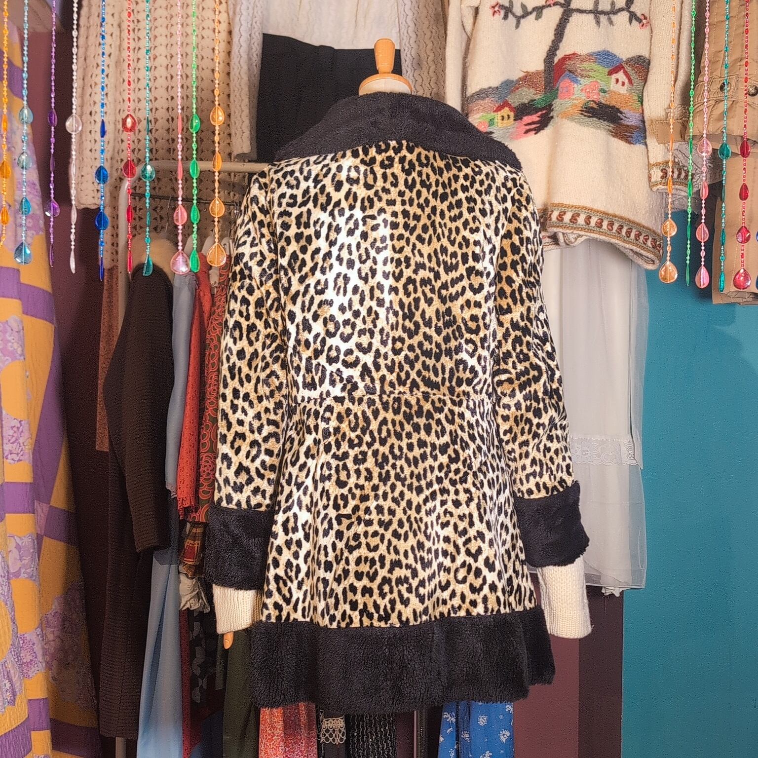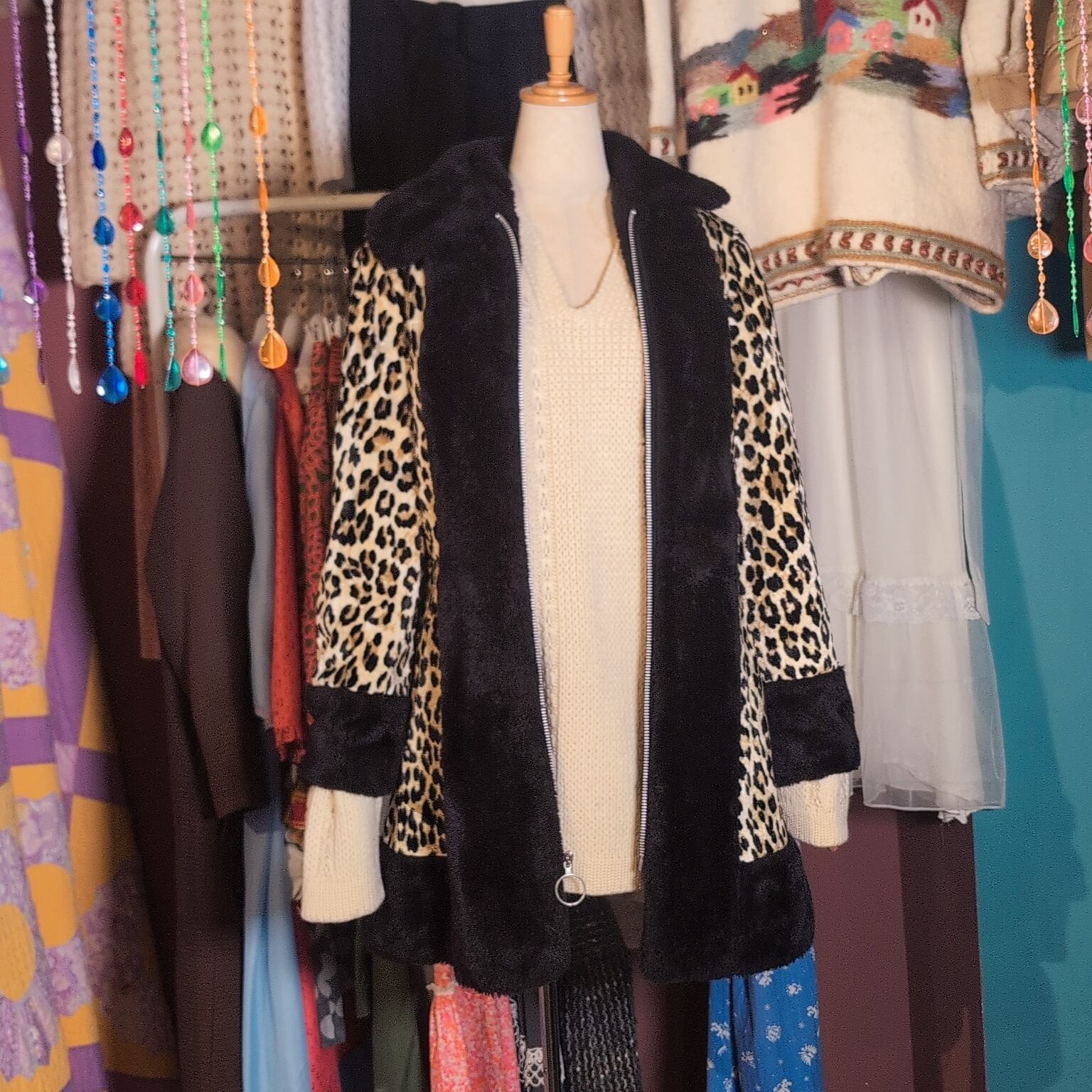 色味は、ブラック × ベージュ × ブラウン。存在感のあるヒョウ柄がかっこいい一着です。Aラインの綺麗なシルエットとビンテージならではの存在感。切り返しになっているブラックのフェイクファーの部分もシックな印象です。