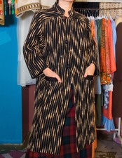 色味は、ブラック×ベージュ。細さの異なる糸で織られた不規則なストライプ柄のテキスタイルがかっこいいです。スタンドカラー、Iラインも含めスタイリッシュな雰囲気が◎