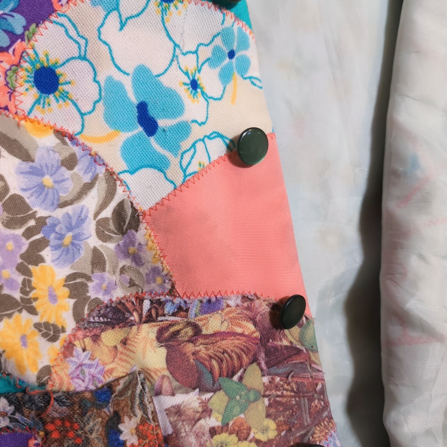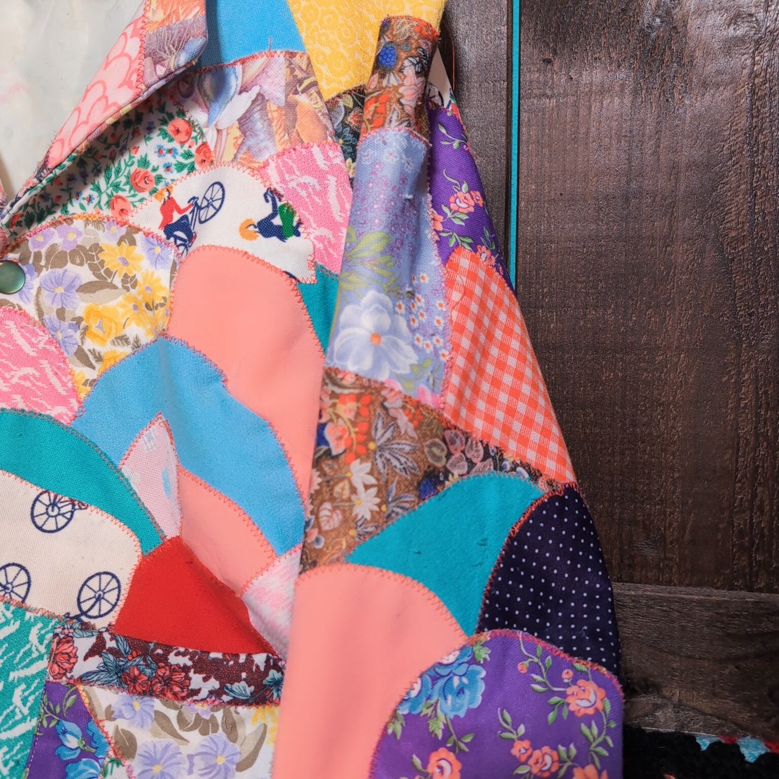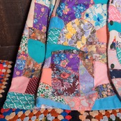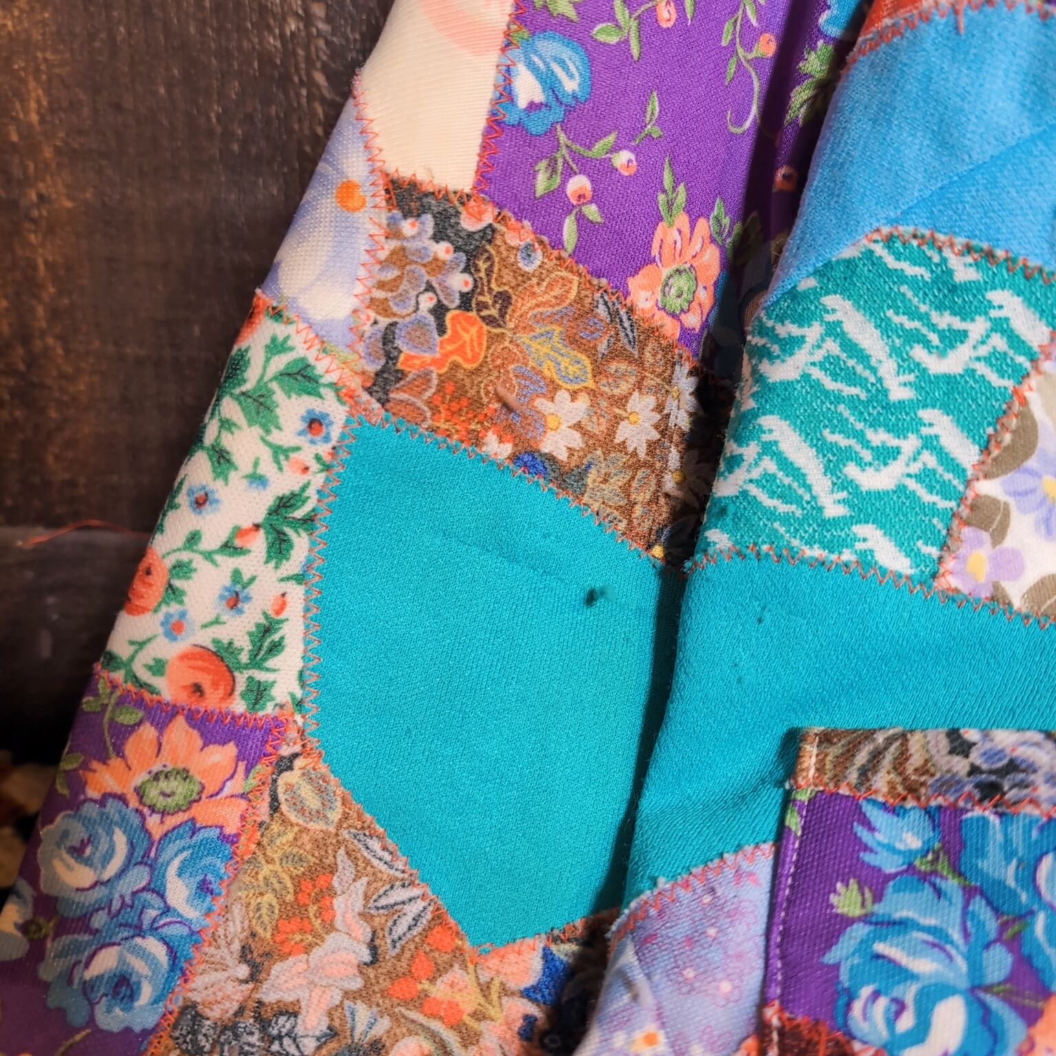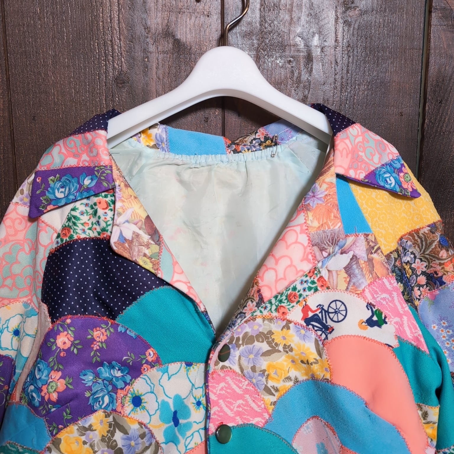扇形のパッチワークがとっても可愛らしいです。ラグランで肩が落ちつつもなだらかにシェイプされています。パッチワークのカジュアルさに比べてフォーマルでキレイなデザインが魅力的。