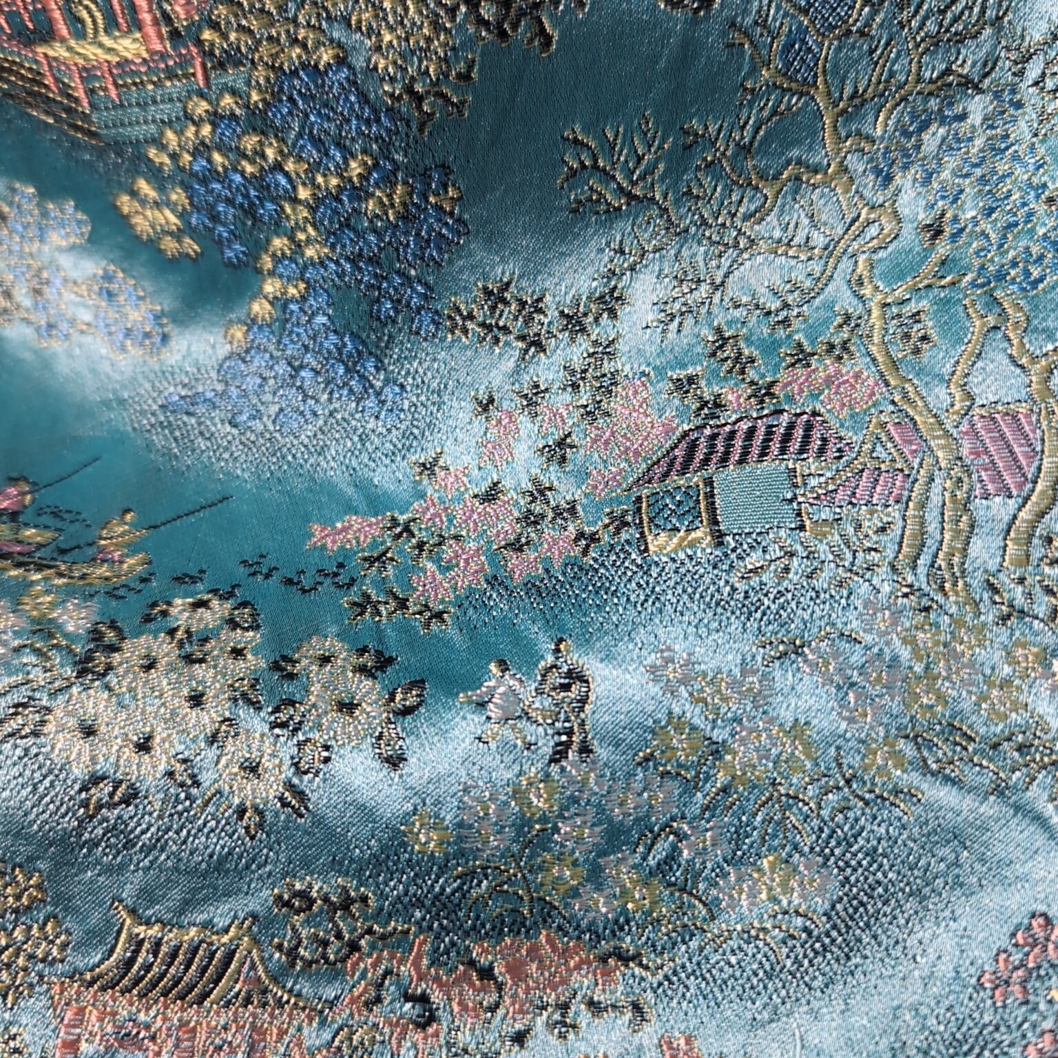 シルクの光沢感とお花や建物のひしめく総柄の刺繍が魅力的。思い切り長い着丈はワンピースのように着られます。