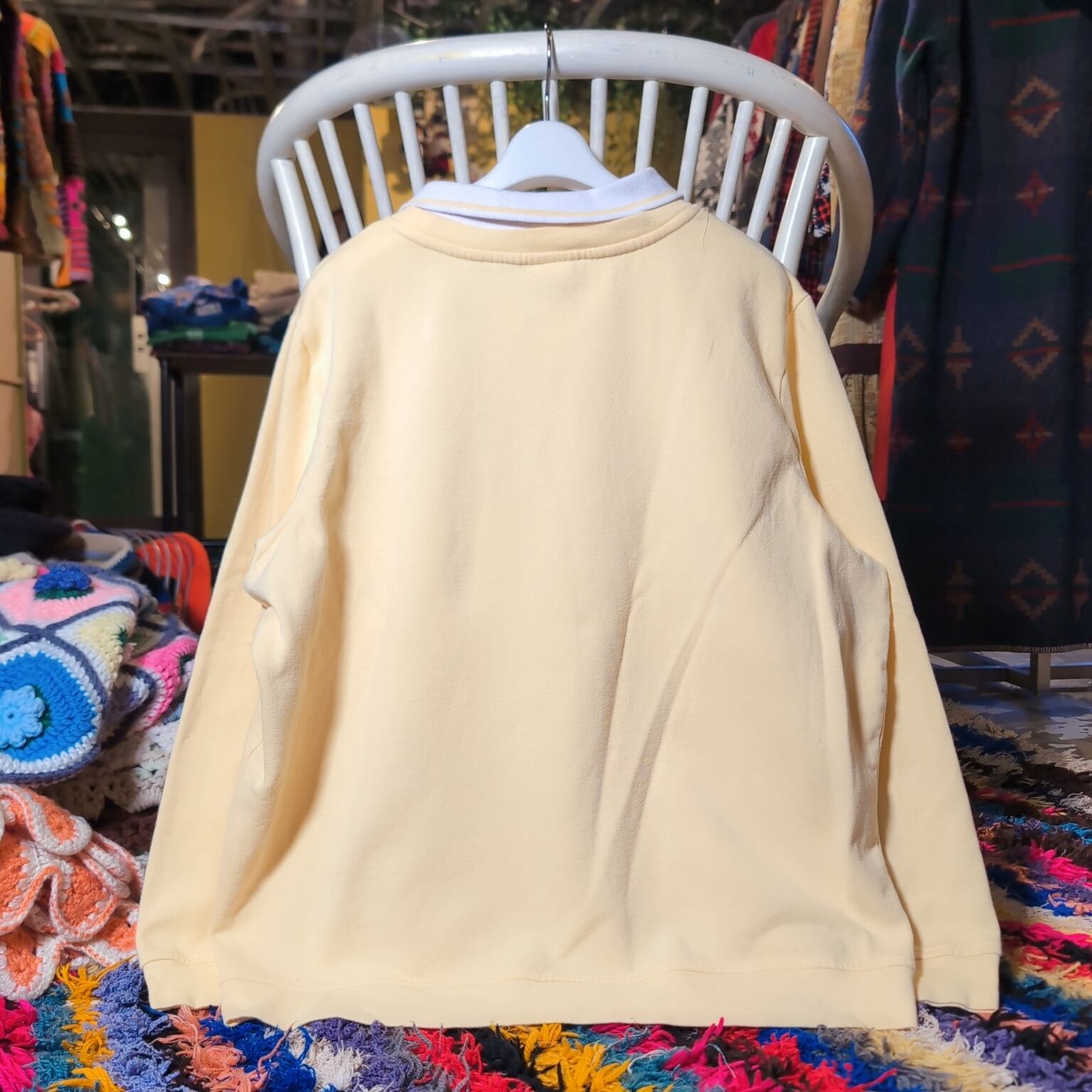 優しいイエローの柔らかいカラーリングに、ねこちゃんたちのパッチワーク、お花の刺繍がかわいいですね。襟部分はホワイトでちょこんとした襟、黄色のラインがアクセント。