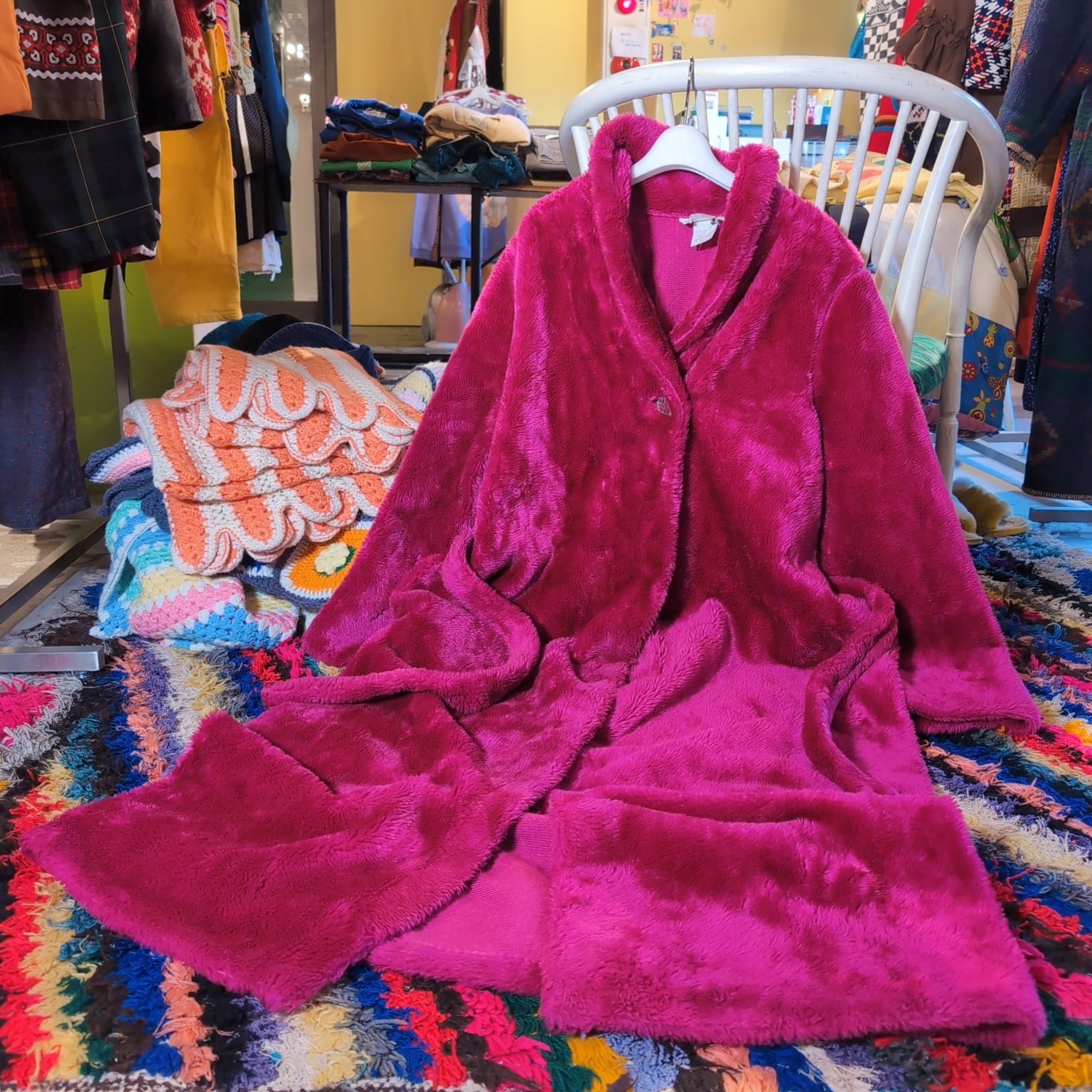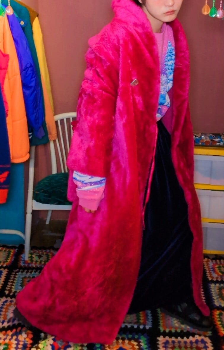 鮮やかなカラーリング、ふわふわの贅沢な丈感。スタイリッシュなショールカラーと、クリアなボタンがゴージャスな雰囲気です。