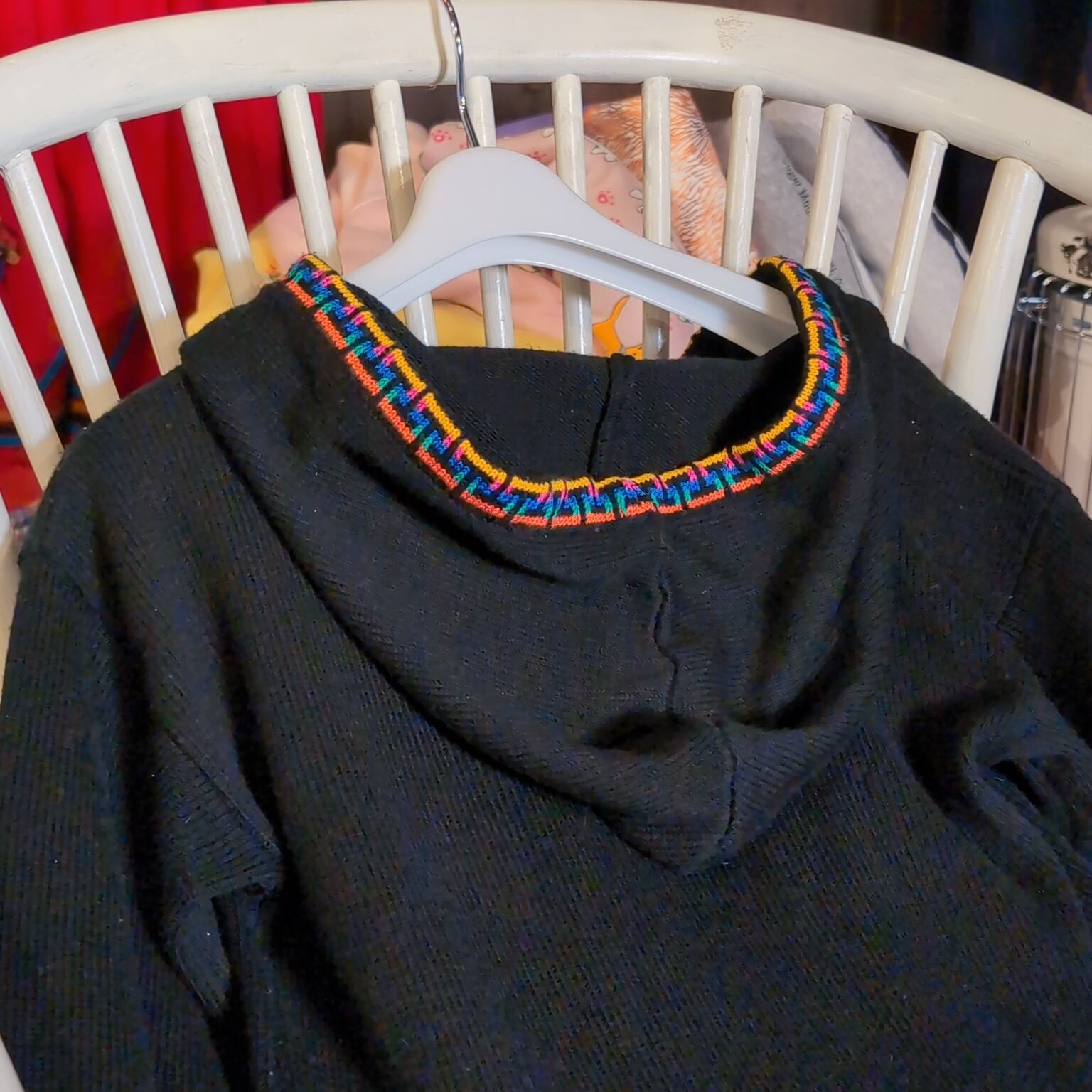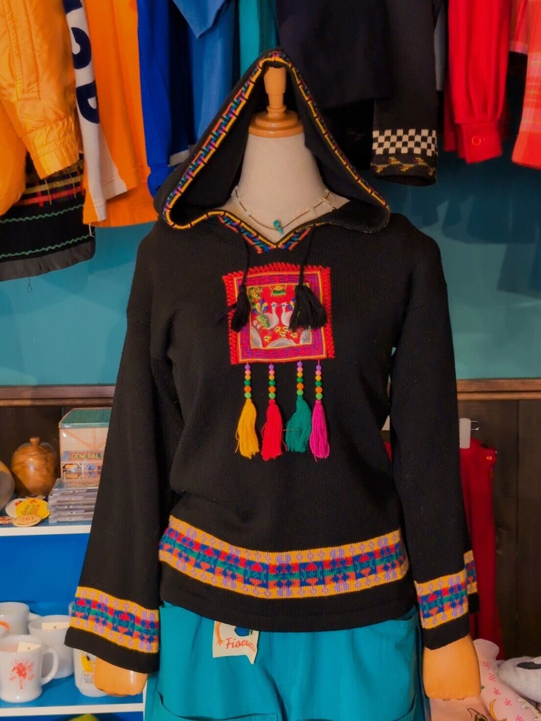 タイトなサイズ感。タペストリーのような刺繍のモチーフと、ビーズ、タッセルがアジアンな雰囲気。フレアなスリーブとアウトラインのカラフルなデザインも可愛い。