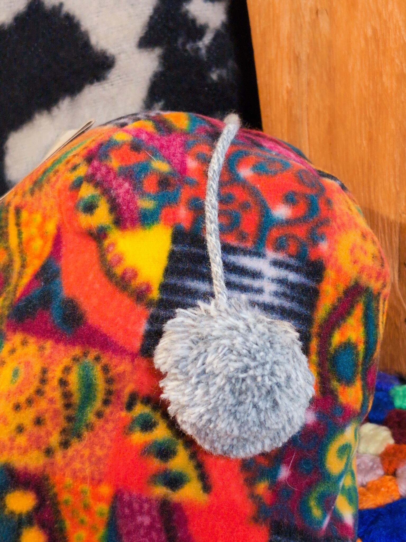 色味は、レッド×グリーン×イエロー×ブラック×ボルドーなど。パッチワーク風の不思議な模様とコンパクトなデザインが魅力的。ぽんぽんが付いてるのも可愛いです。