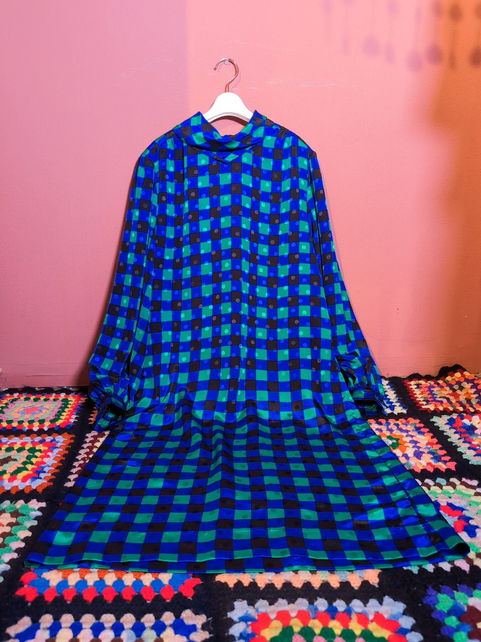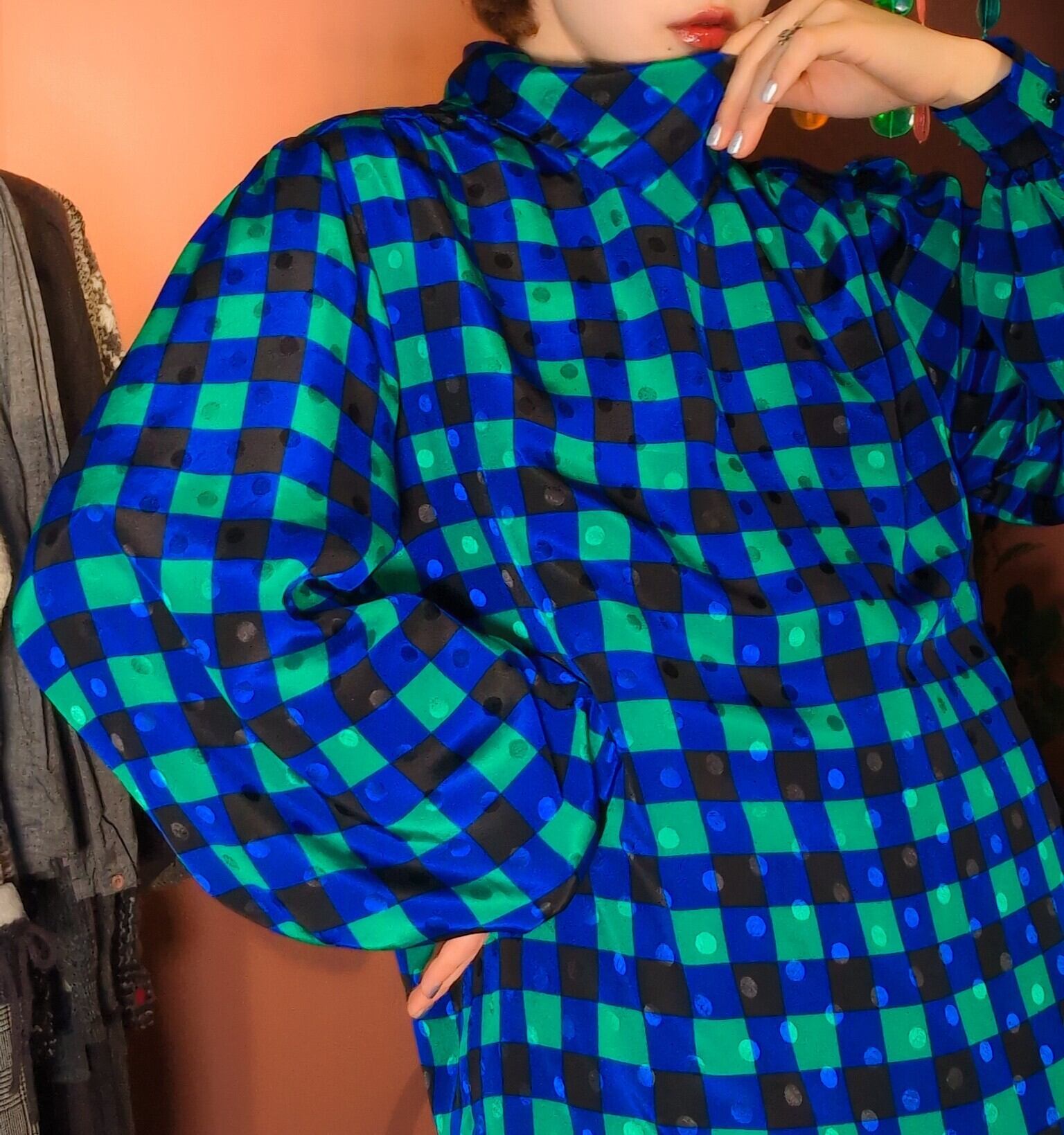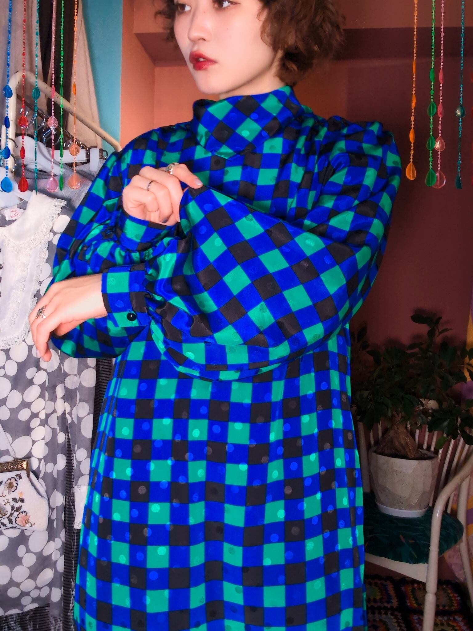 艶感のある素材にブラックチェック、その上からドットが透けるユニークなテキスタイル。高めの襟にIラインでシンプルなデザインですが、袖部分はキュッとしまりポワンポワンとボリューム感が魅力的なパフスリーブ。