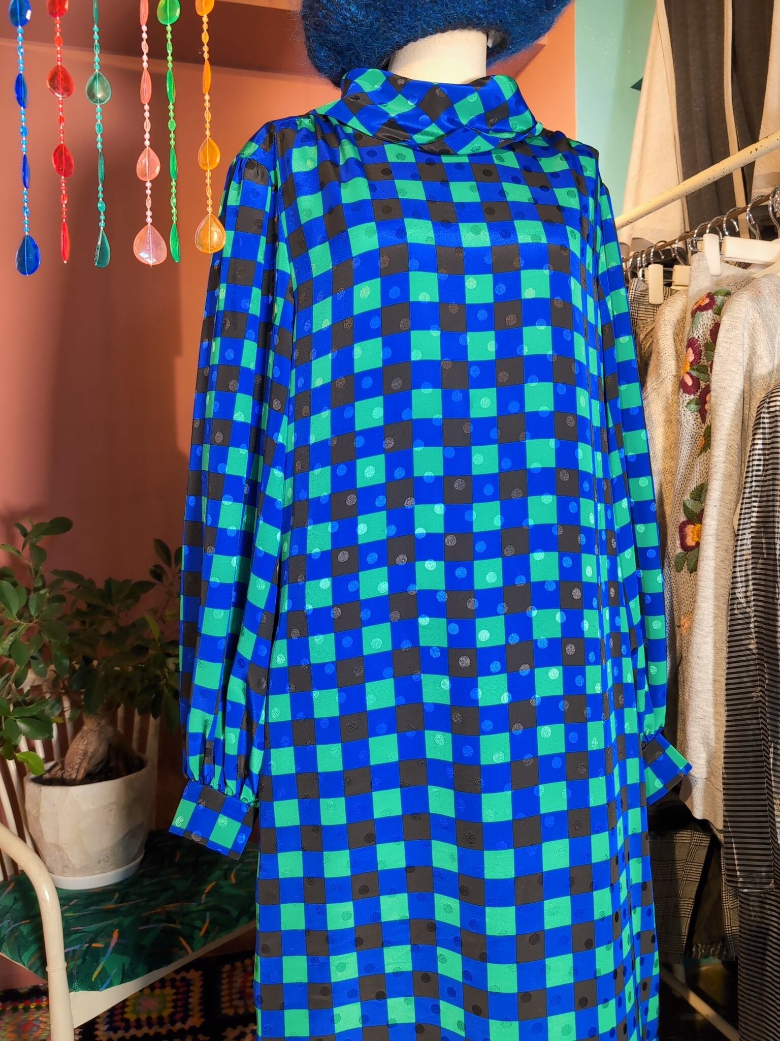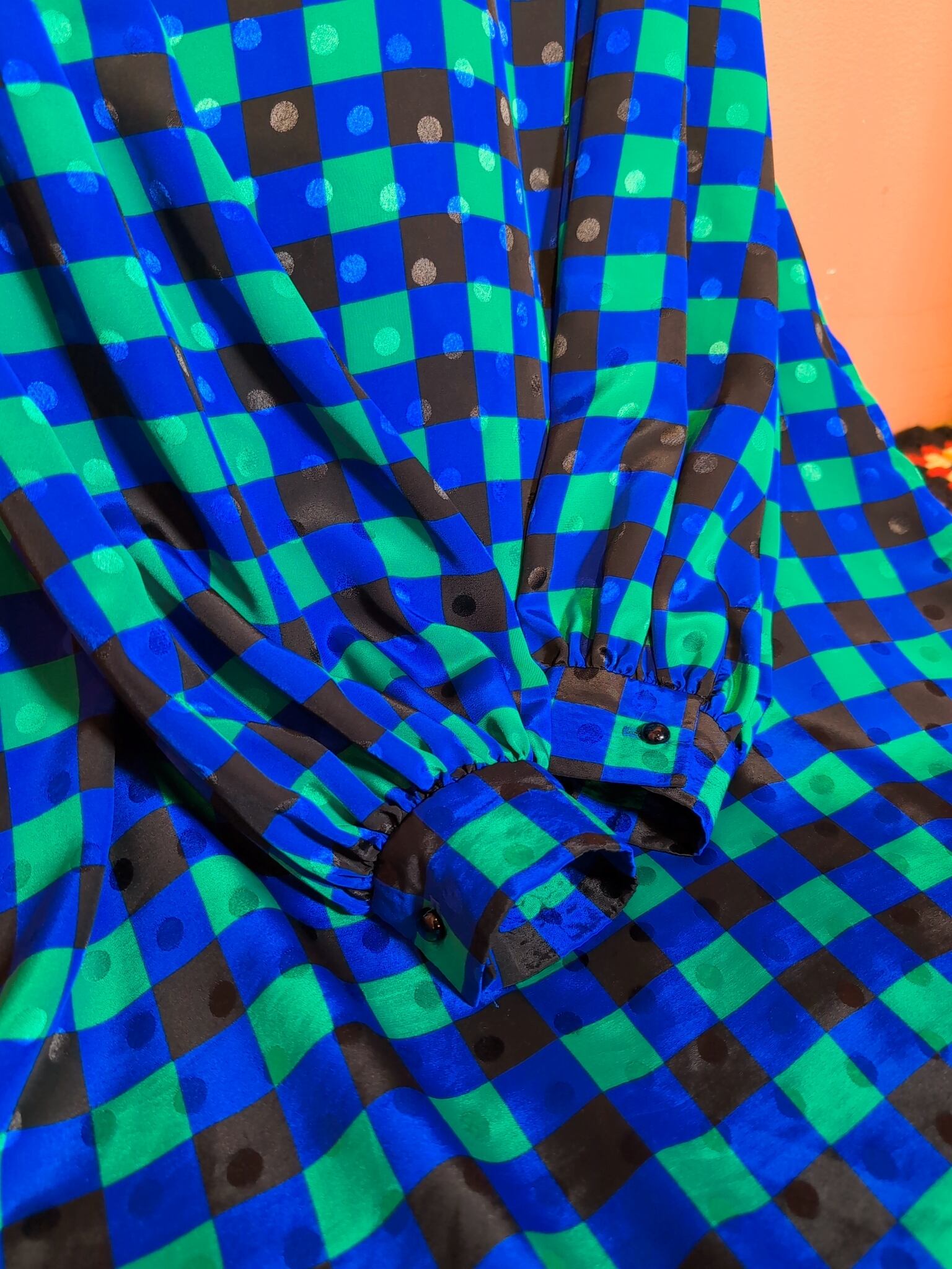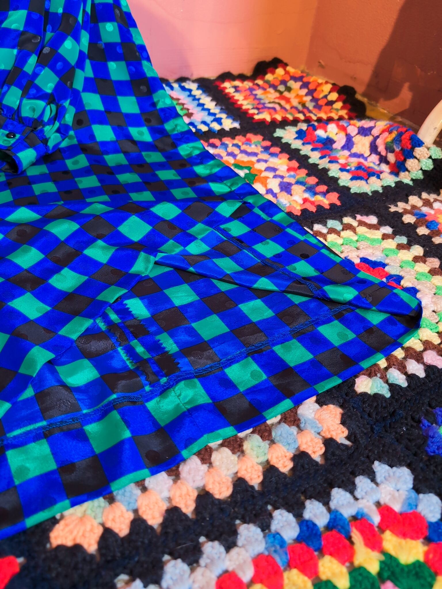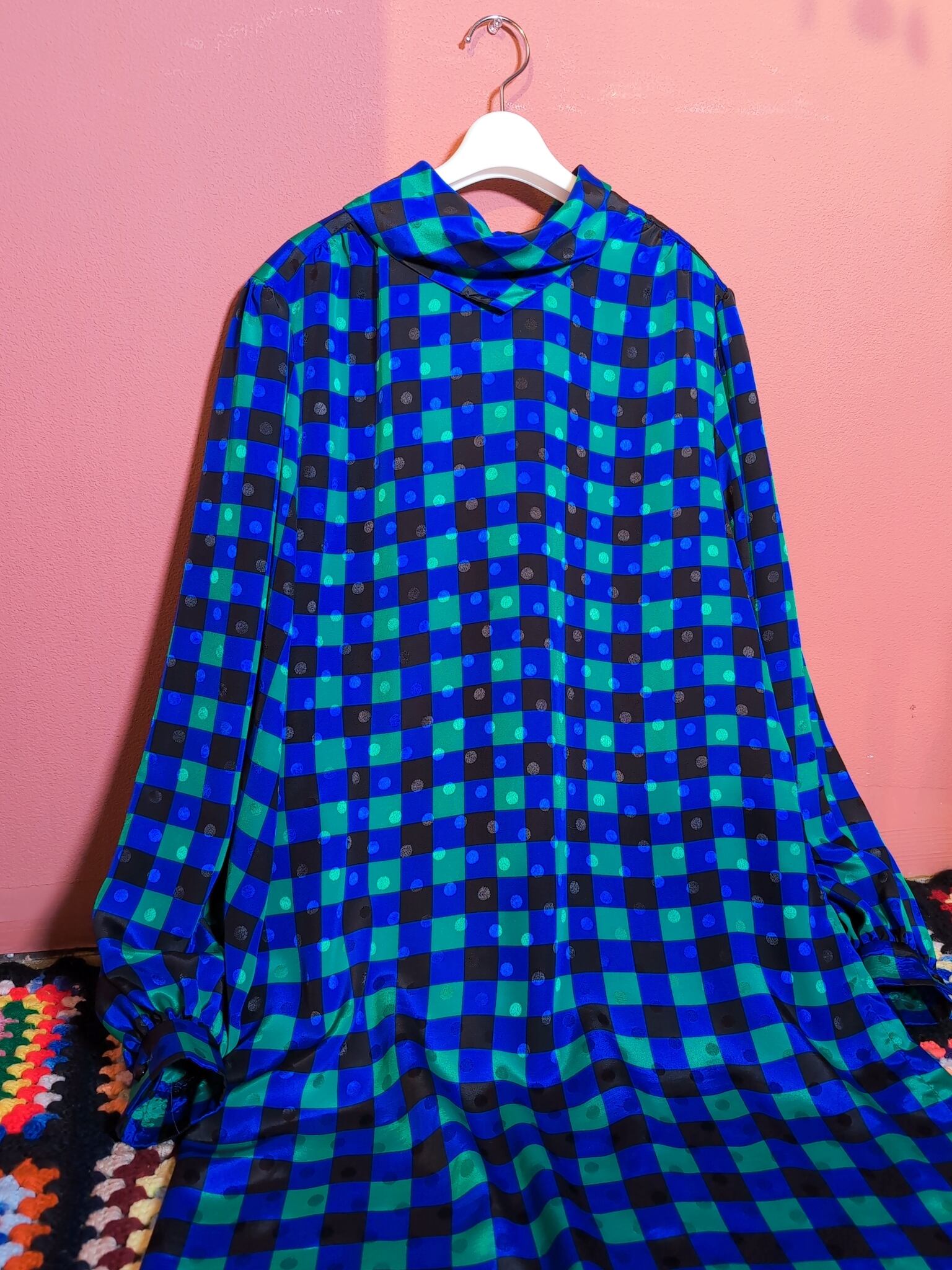 艶感のある素材にブラックチェック、その上からドットが透けるユニークなテキスタイル。高めの襟にIラインでシンプルなデザインですが、袖部分はキュッとしまりポワンポワンとボリューム感が魅力的なパフスリーブ。