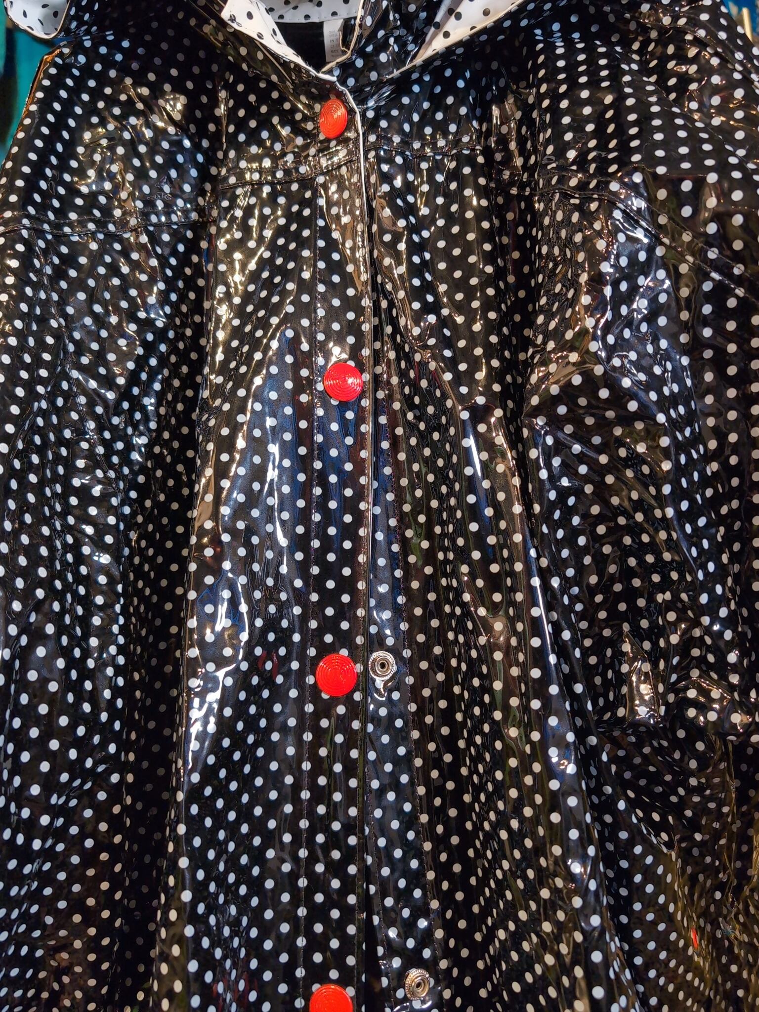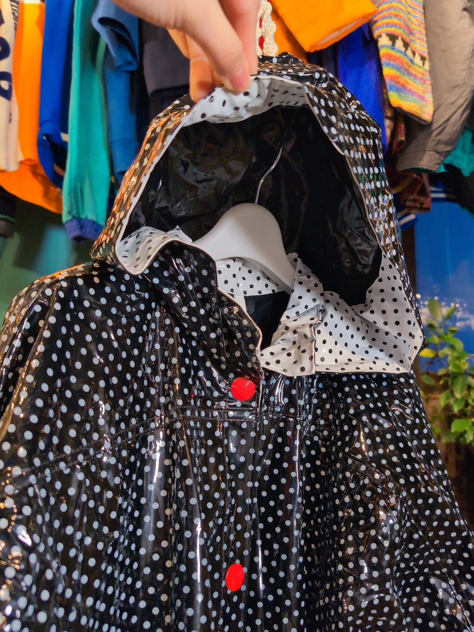 レインコートって色々ありますが、こちらはこだわり感じる身幅の広さ、ハリのある素材だからこそ馴染みの良いラグラン。ドルマンスリーブ×たっぷりとした着丈も魅力的。大きめのフードや赤のボタン、袖部分のライン、折り返した部分はカラーが反転されて白黒のドットになっていたりとレインコートのデザインへの気概を感じますね。