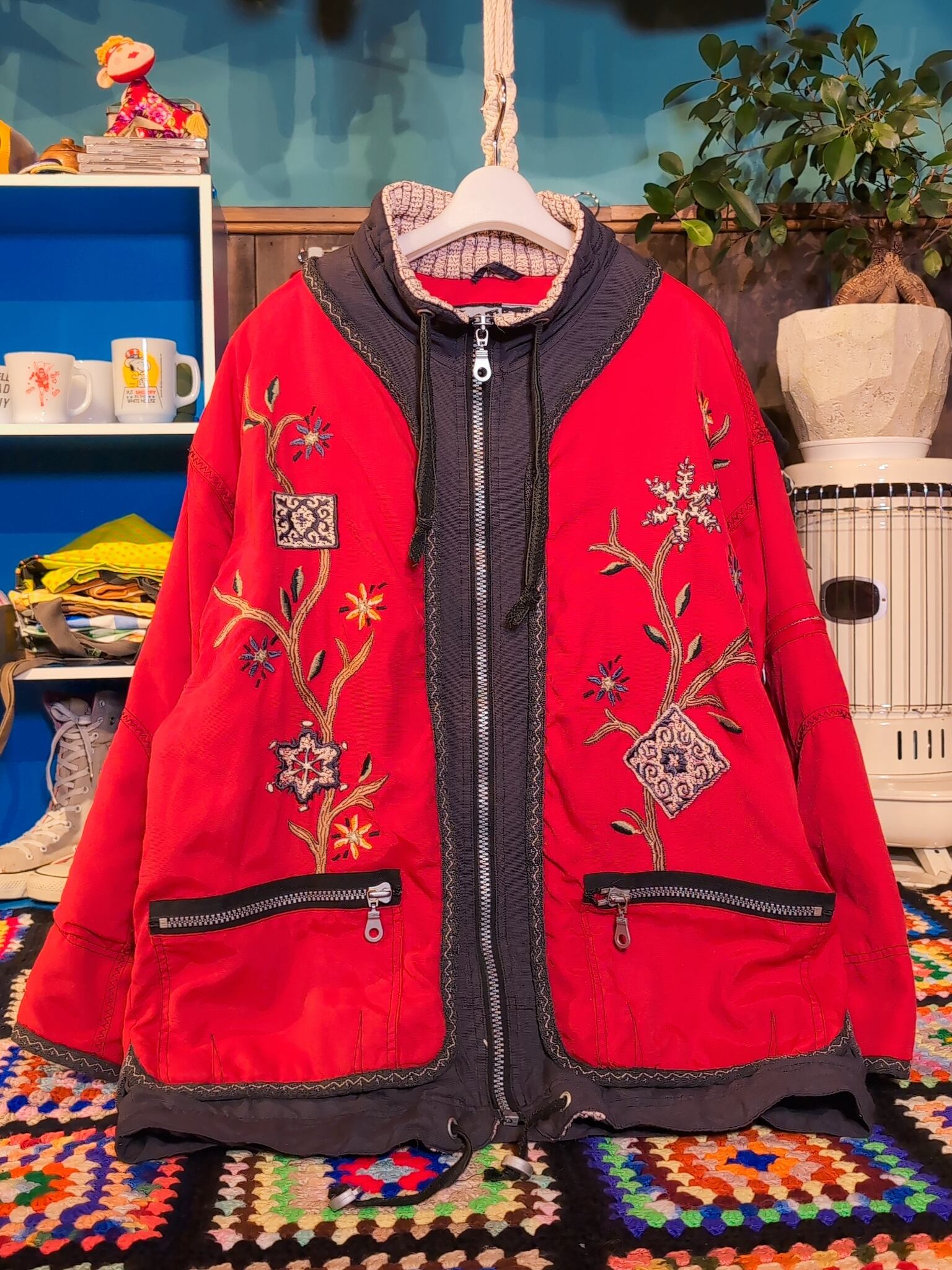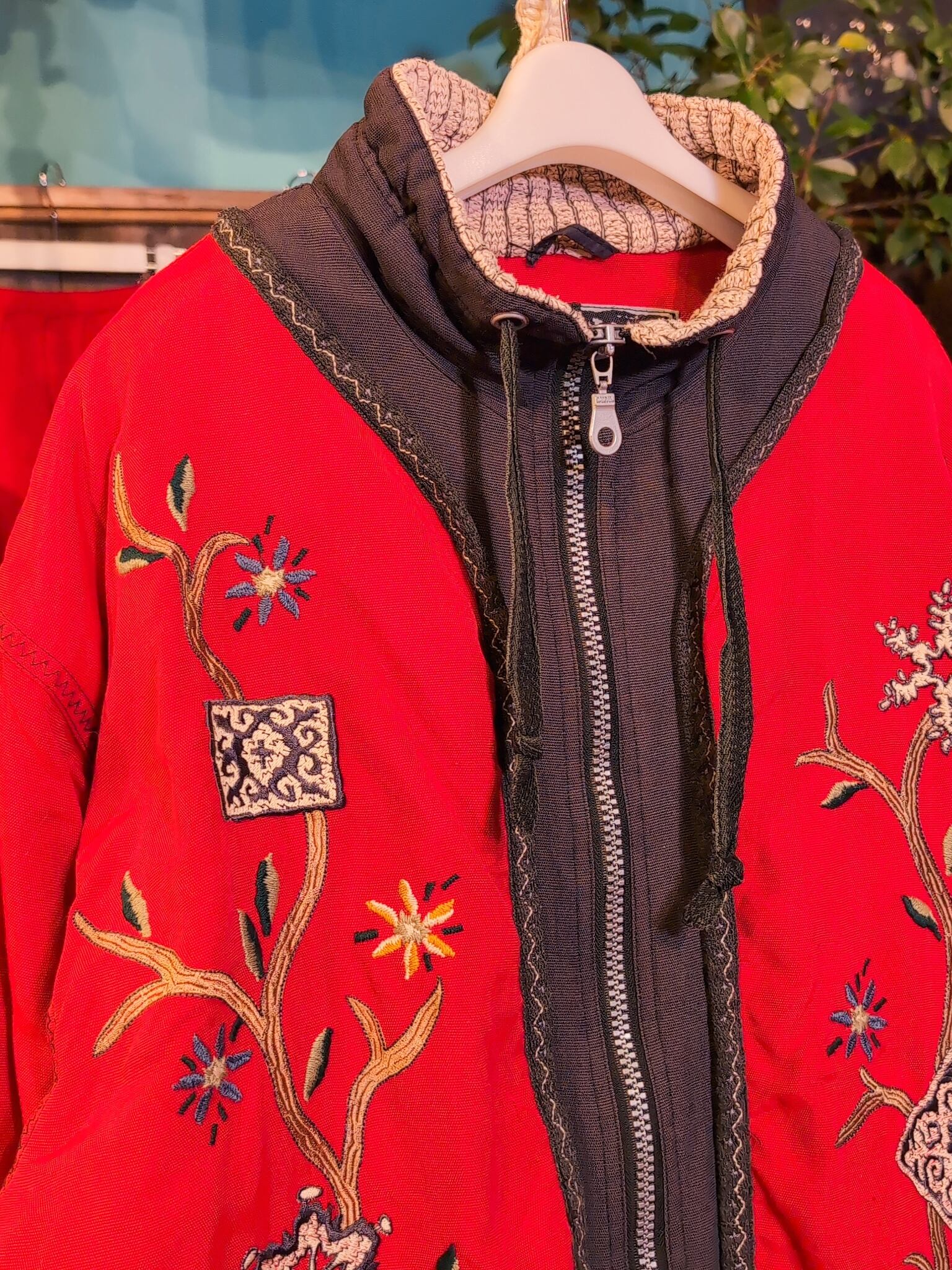 アクティブなデザインに、チロルテープのようなパイピング、フォークロアなお花の刺繍の組み合わせが魅力的な一着です。