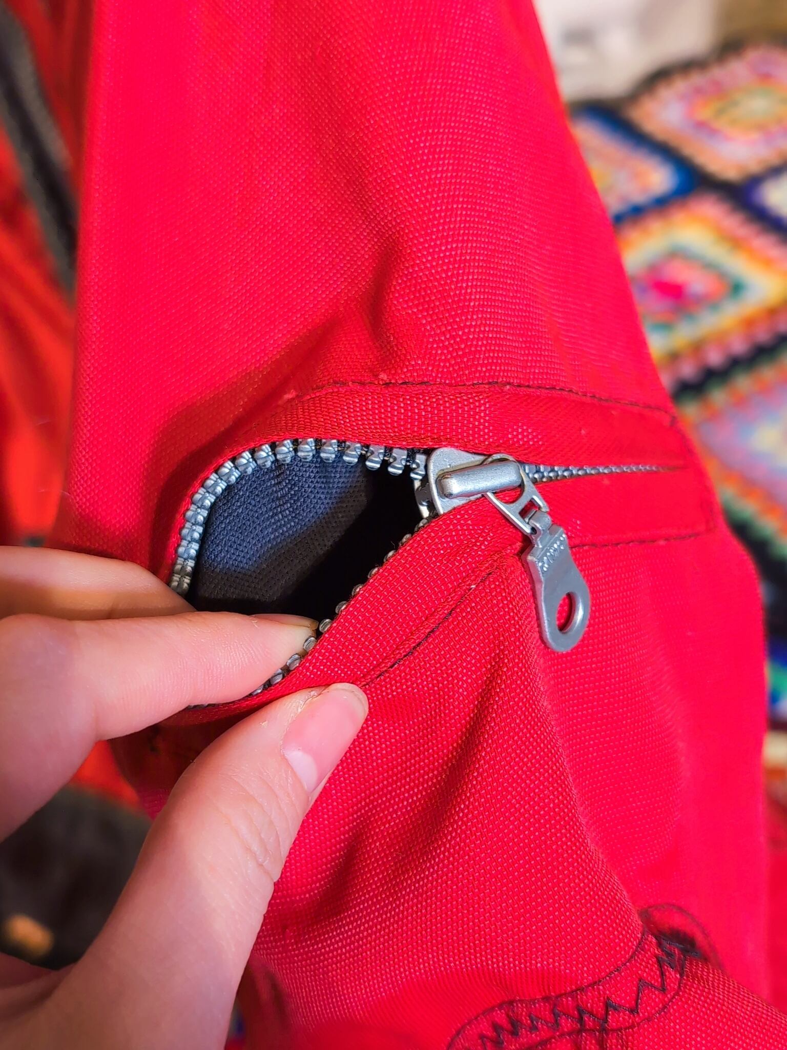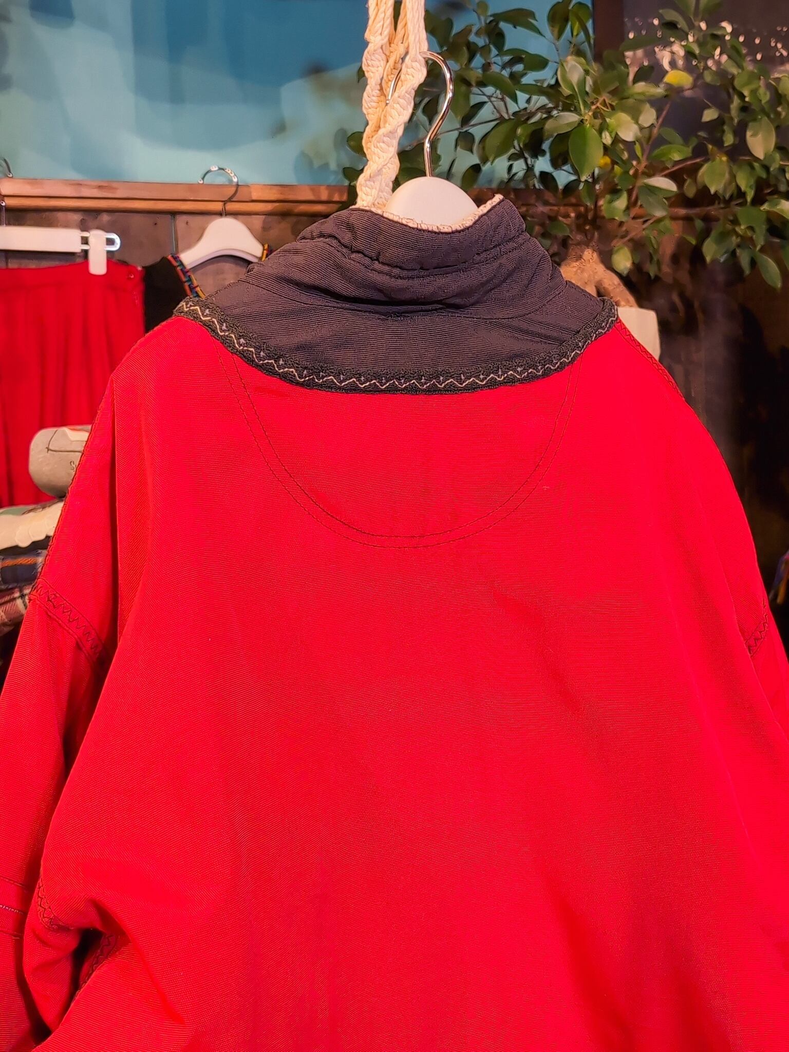 ビビッドな赤に黒い切り返しの、重ね着をしているかのような切り返しも可愛い。身幅も着丈もたっぷり。