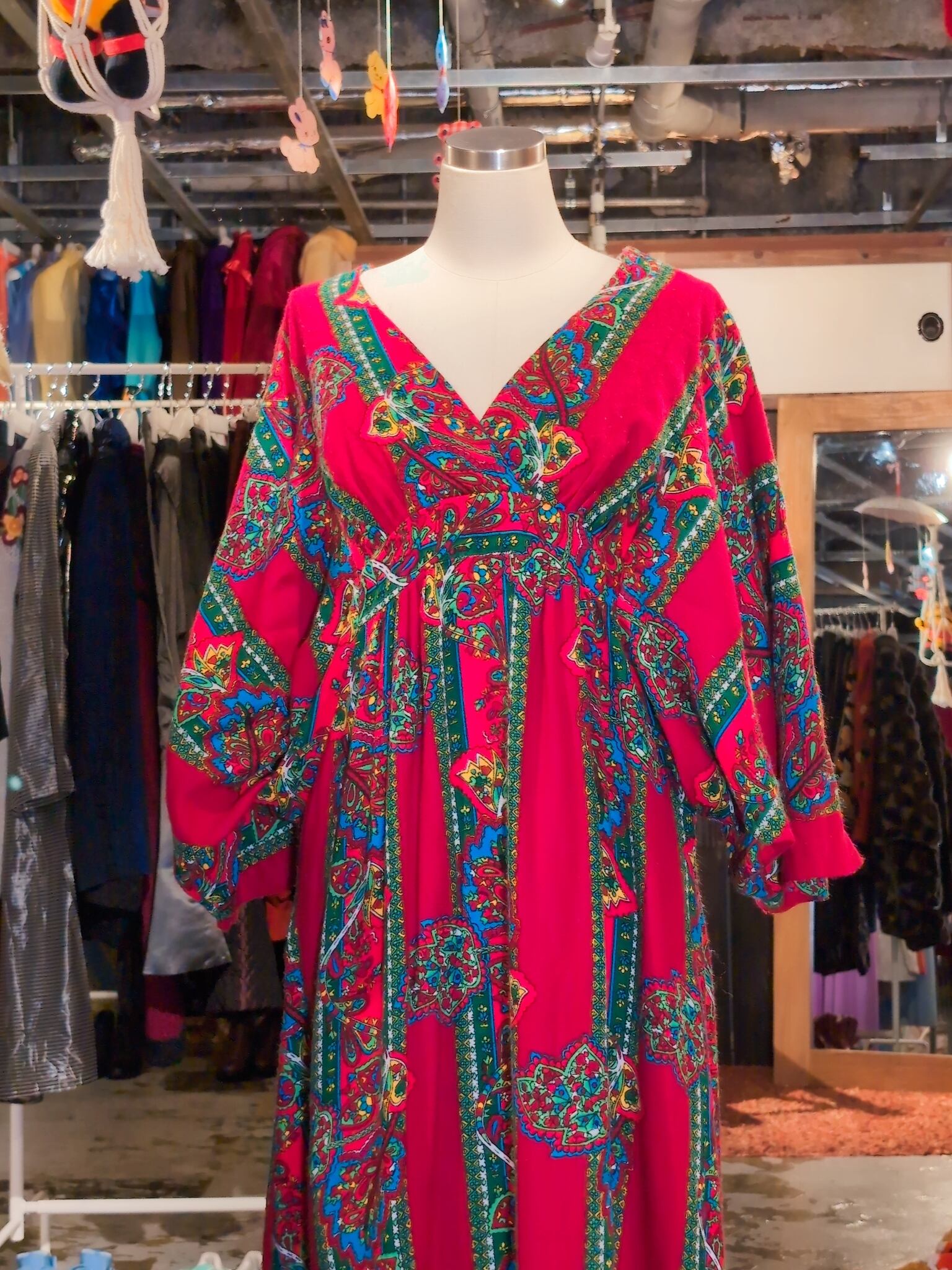 エスニックなパターンがとっても目を引く一着です。高めに切り替えされたウエスト、ドルマンスリーブでふわりと動く袖部分のシルエットも素敵です。