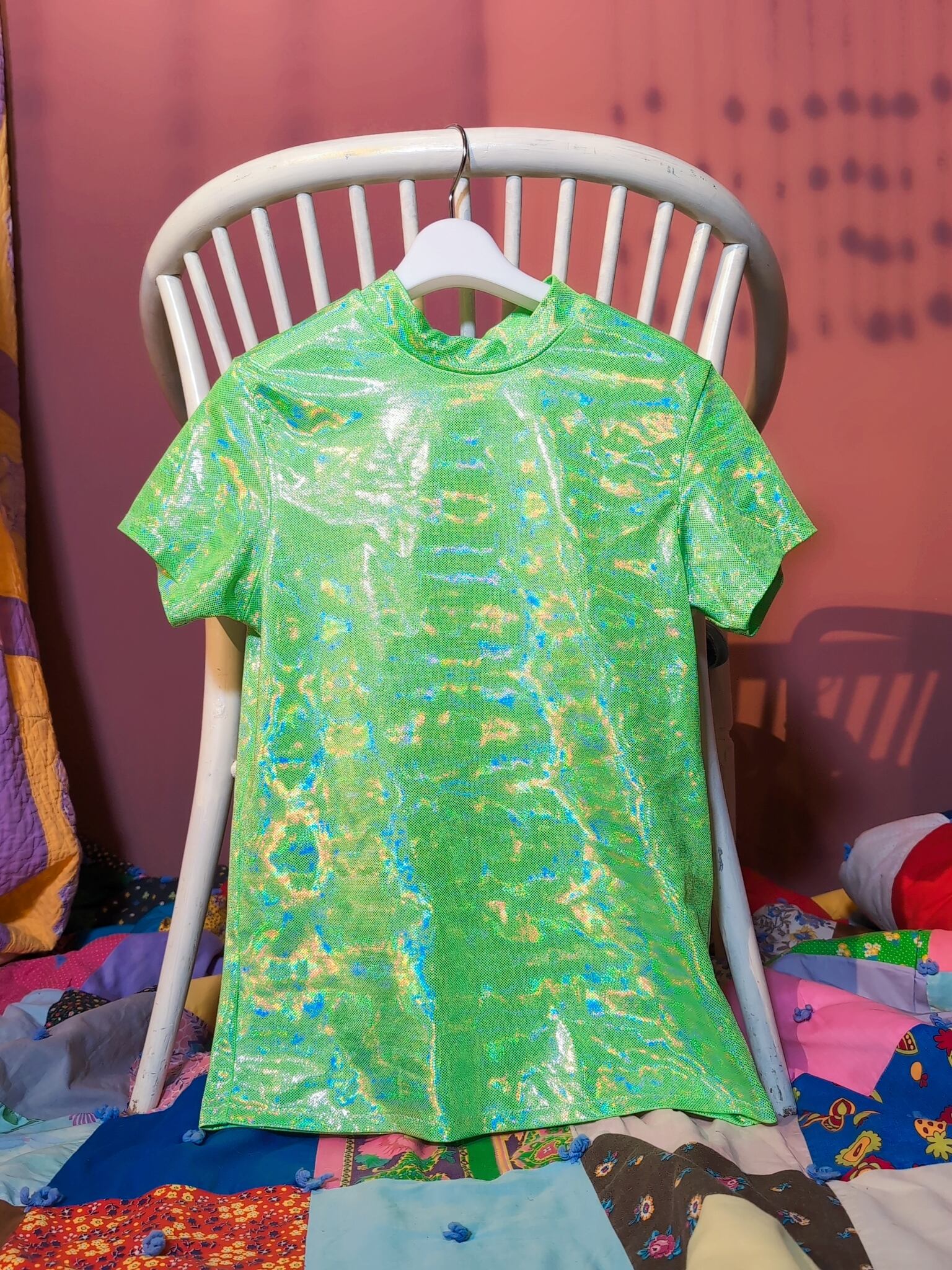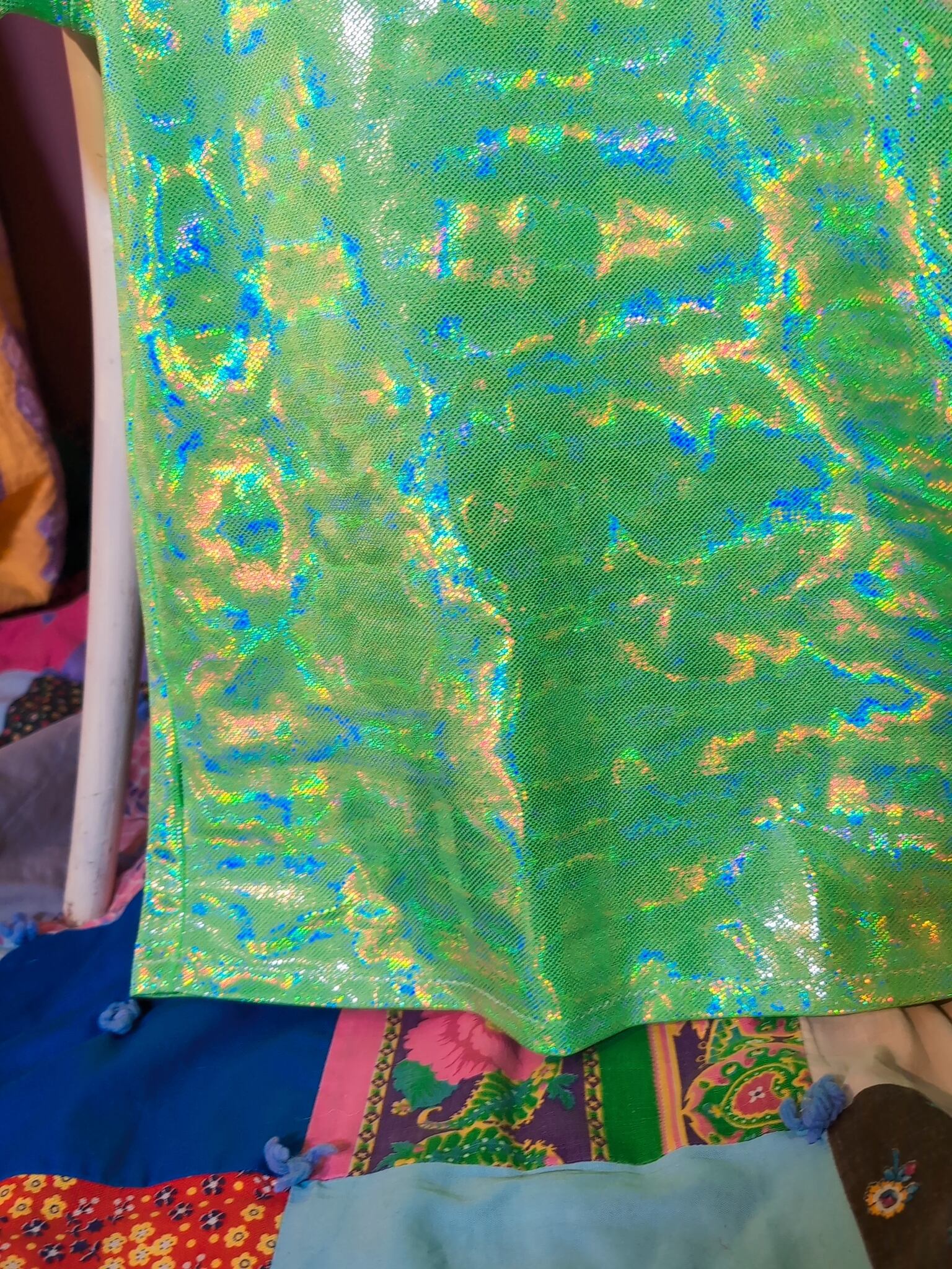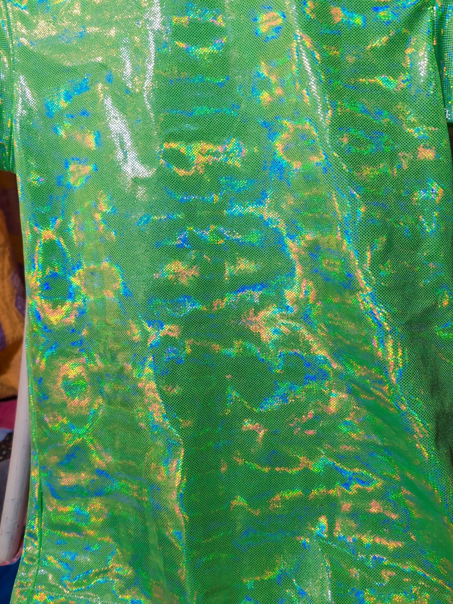 色味は、グリーン。ホログラムで見る角度によってぼんやりと発光するテキスタイルが近未来!!!!な感じ。伸縮性がありボディにフィットするのでインナーとして使うのがよりオススメです。